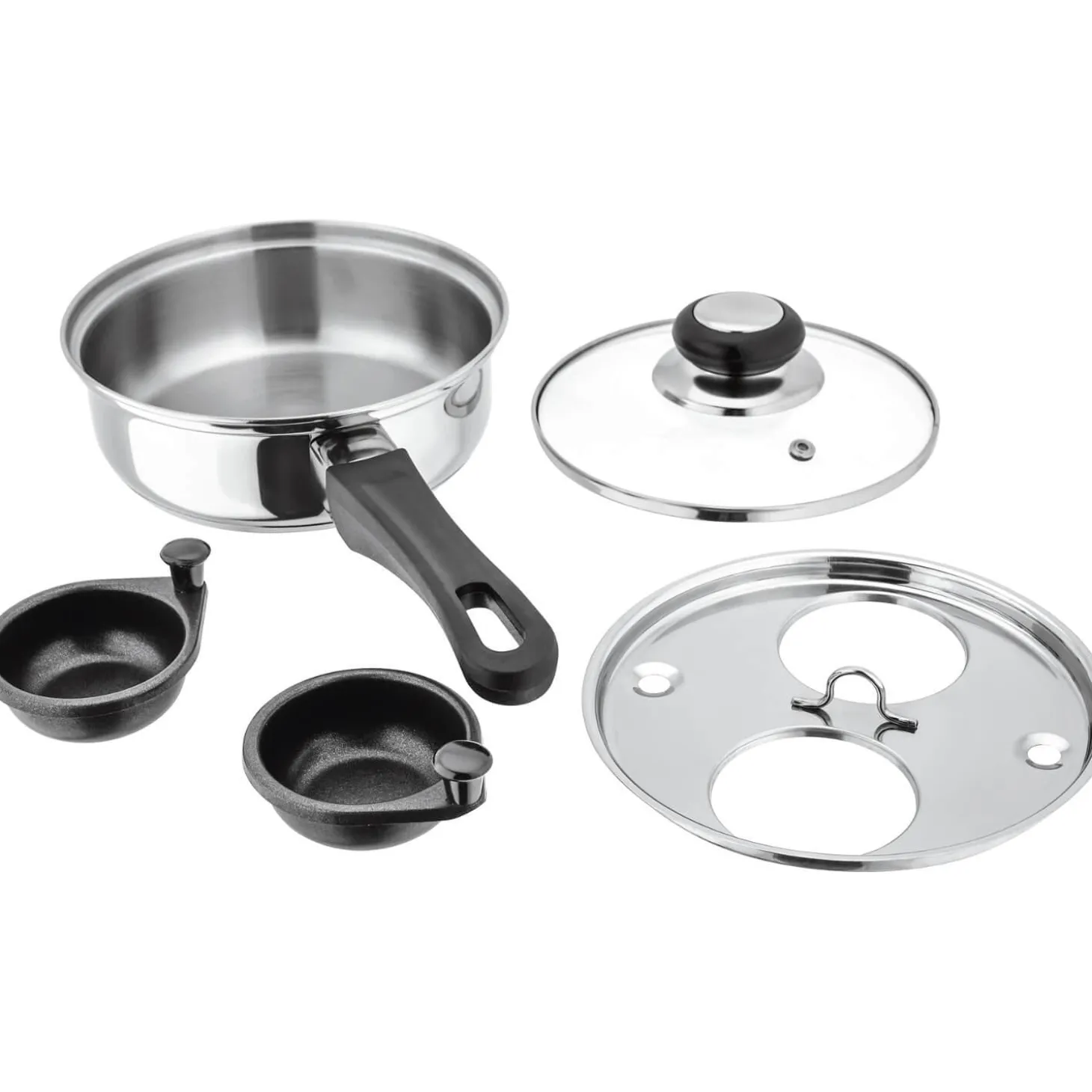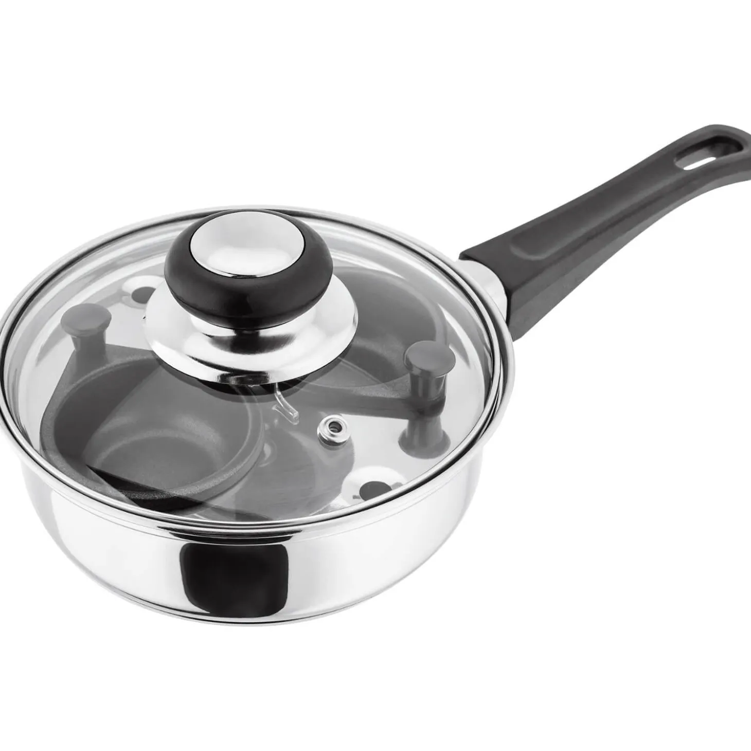 Create perfectly poached eggs with 2 hole egg poacher from the Judge Essentials range. Featuring a premium induction compatible stainless steel design with an ergonomic stay-cool handle and clear glass lid. To use simply add water to the pan and bring it to a gentle simmer, crack the egg and place into the cup and allow to cook. This item can also be used as a conventional saute pan by removing the inserts making it a versatile choice.