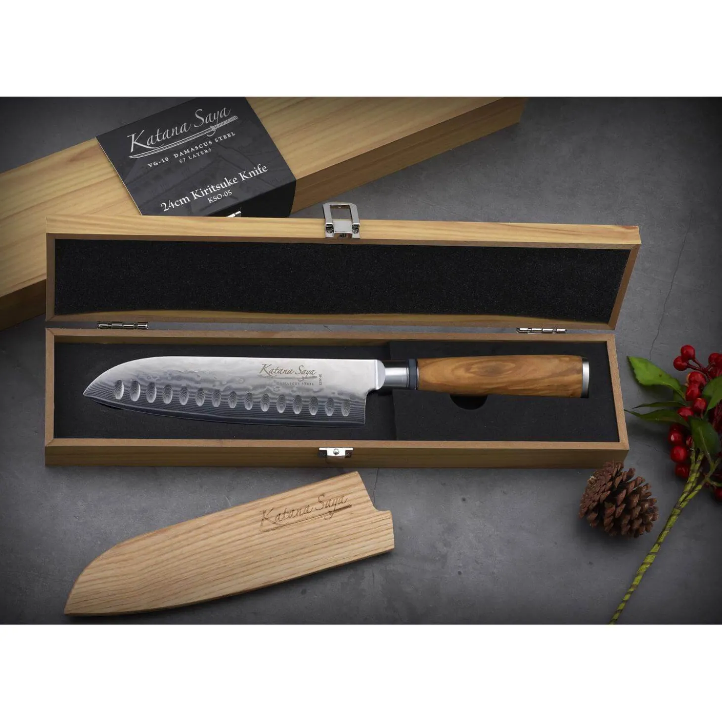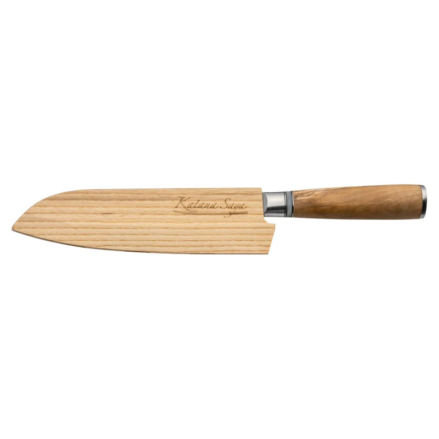 Katana presents the Saya 18cm Santoku Knife as part of its Olivewood range. The name “Katana” refers to the esteemed sword of the Samurai, which is known for its exceptionally sharp blade made from folded Damascus steel. Similarly, these knives are crafted from Japanese VG-10 Damascus steel. Like the legendary sword, these knives are protected by a sheath, or saya, highlighting their quality and value.
