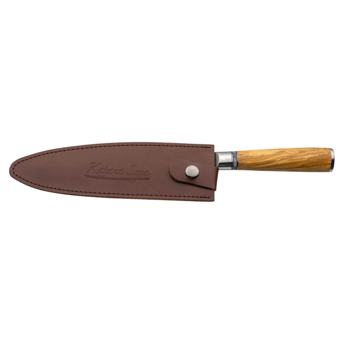 Katana presents the Saya 20cm Carving Knife as part of their Olivewood range. The Katana, the prized sword of the Samurai, features an exceptionally sharp blade made from folded Damascus steel. Similarly, Katana Saya knives are crafted from Japanese VG-10 Damascus steel and, like the Katana, are protected in a sheath, or saya, reflecting their value.