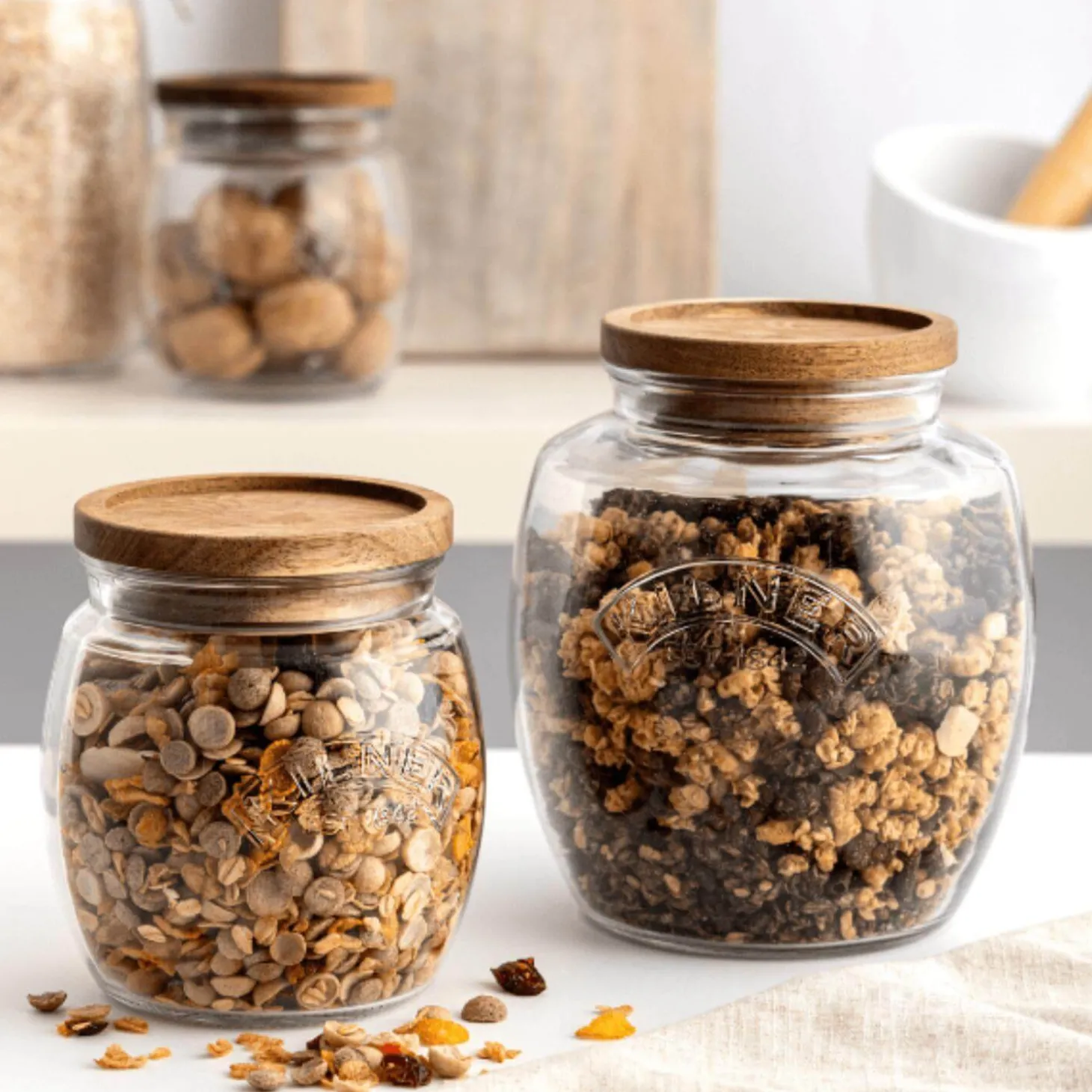 Kilner presents the 850ml Universal Glass Jar, that now comes with an acacia wooden push-top lid, providing a stylish and practical storage solution for dry foods. They are also great for organising cosmetics and toiletries in the bathroom. An attractive storage jar for your kitchen countertop.