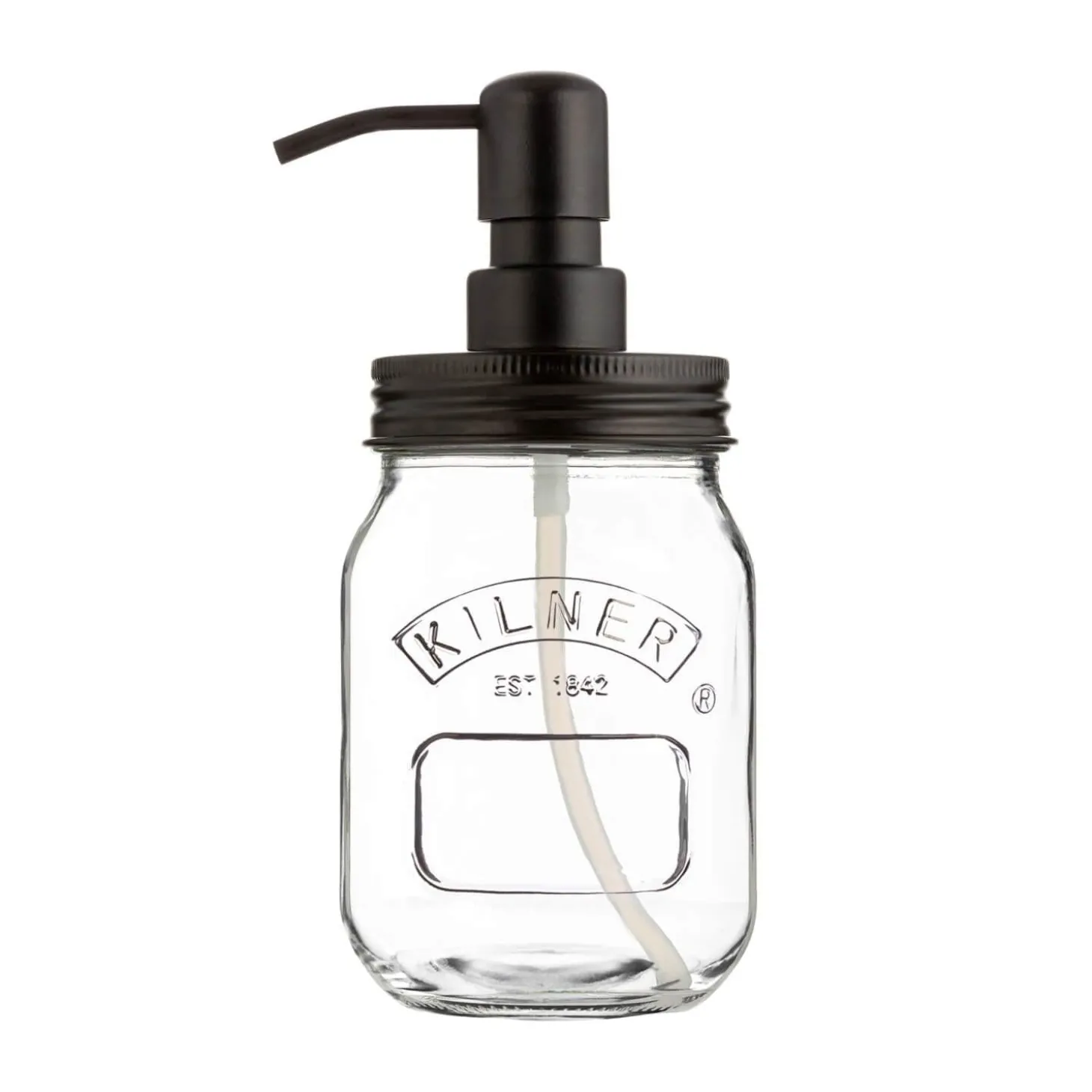 Ideal for the kitchen or bathroom, this clear glass soap / lotion dispenser by Kilner eliminates the need for single-use bottles and containers having been crafted from high-quality glass that is BPA free and does not absorb odour or stains. Styled in the form of a traditional Kilner preserve jar this soap pump features a screw-top lid with a stylish matte black spring pump mechanism that has been created using high-quality 18.10 stainless steel providing unmatched quality.