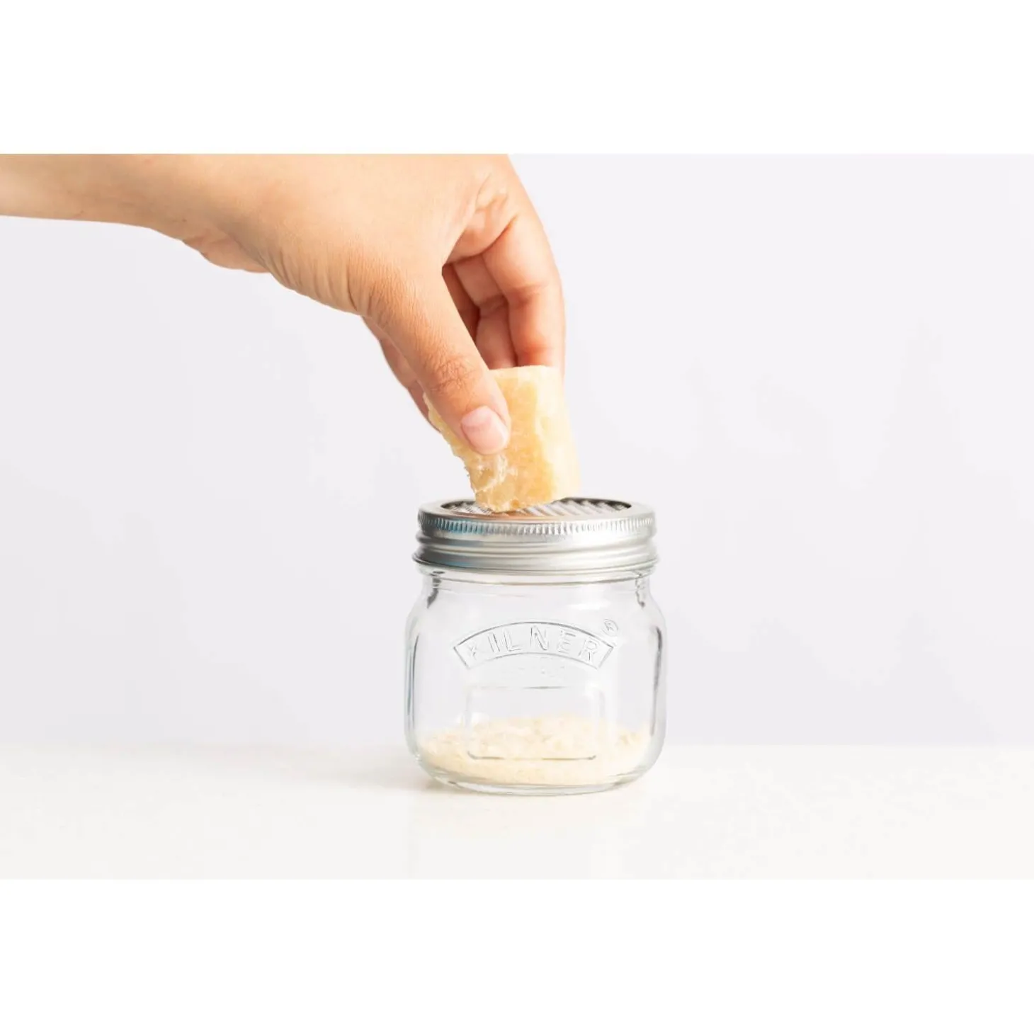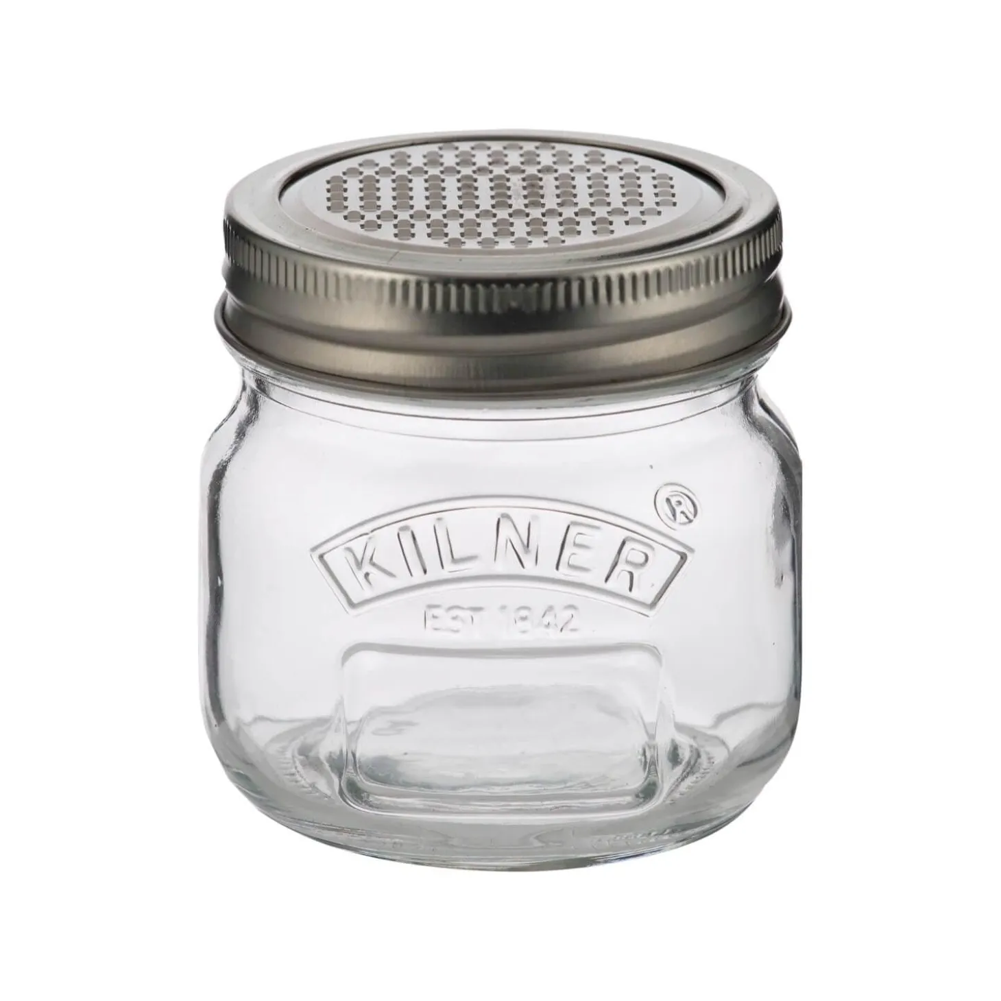 Grate, shave and preserve with the Kilner glass jar with grater lid. Created from high-quality glass with a stainless steel lid that features fine micro-blades that collects shavings in the preserve jar.