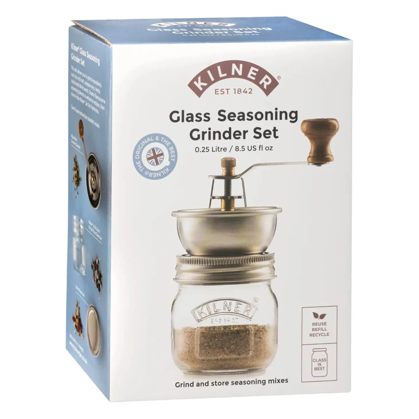 Kilner presents their Seasoning Grinder, the perfect kitchen gadget for grinding and storing ingredients. This device lets you create unique seasoning blends and rubs by grinding mixed ingredients together. It has a hand-operated grinding mechanism made from high-quality stainless steel and ceramic parts with adjustable settings. Keep your final mixture fresher for longer in the 250ml glass jar and one-piece lid.