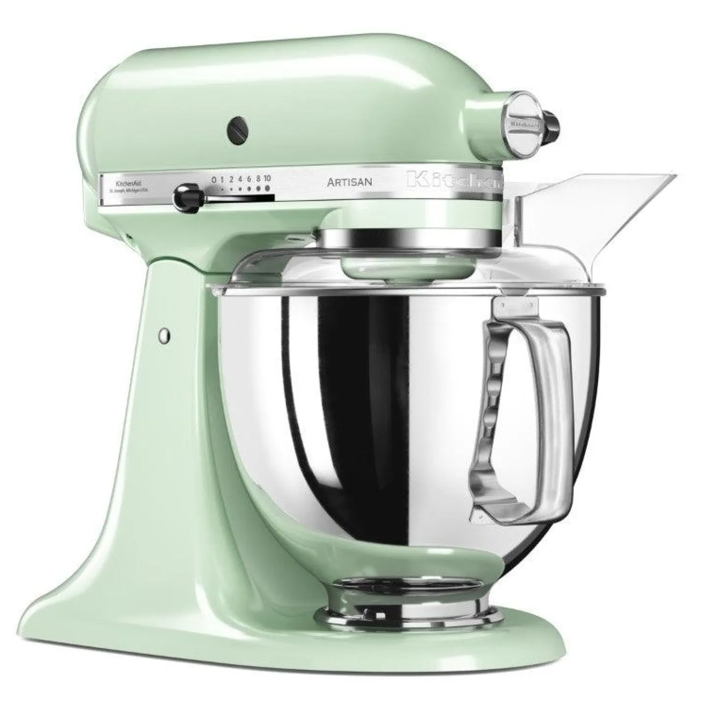 KitchenAid presents the 175 Artisan Tilt-Head Stand Mixer in Pistachio, designed to meet all your baking and mixing needs, allowing you to create a wide variety of recipes with endless possibilities. This mixer boasts several essential features, including a multipurpose attachment hub, a direct drive motor, and a robust metal body with a sleek pistachio pale green finish. It is an ideal food mixer for any baker’s kitchen.