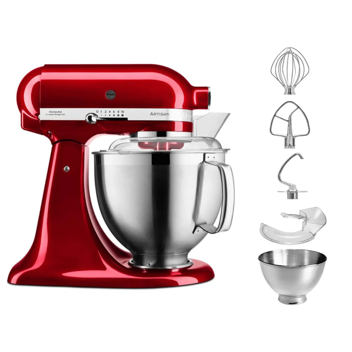KitchenAid presents the 185 Artisan Tilt-Head Stand Mixer in Candy Apple, ideal for all your baking needs. This mixer enables you to create a wide variety of recipes with endless possibilities. It features a multipurpose attachment hub, a direct drive motor, and a sturdy metal body finished in a stylish candy apple red. This stand mixer is a perfect addition to any baker’s kitchen!