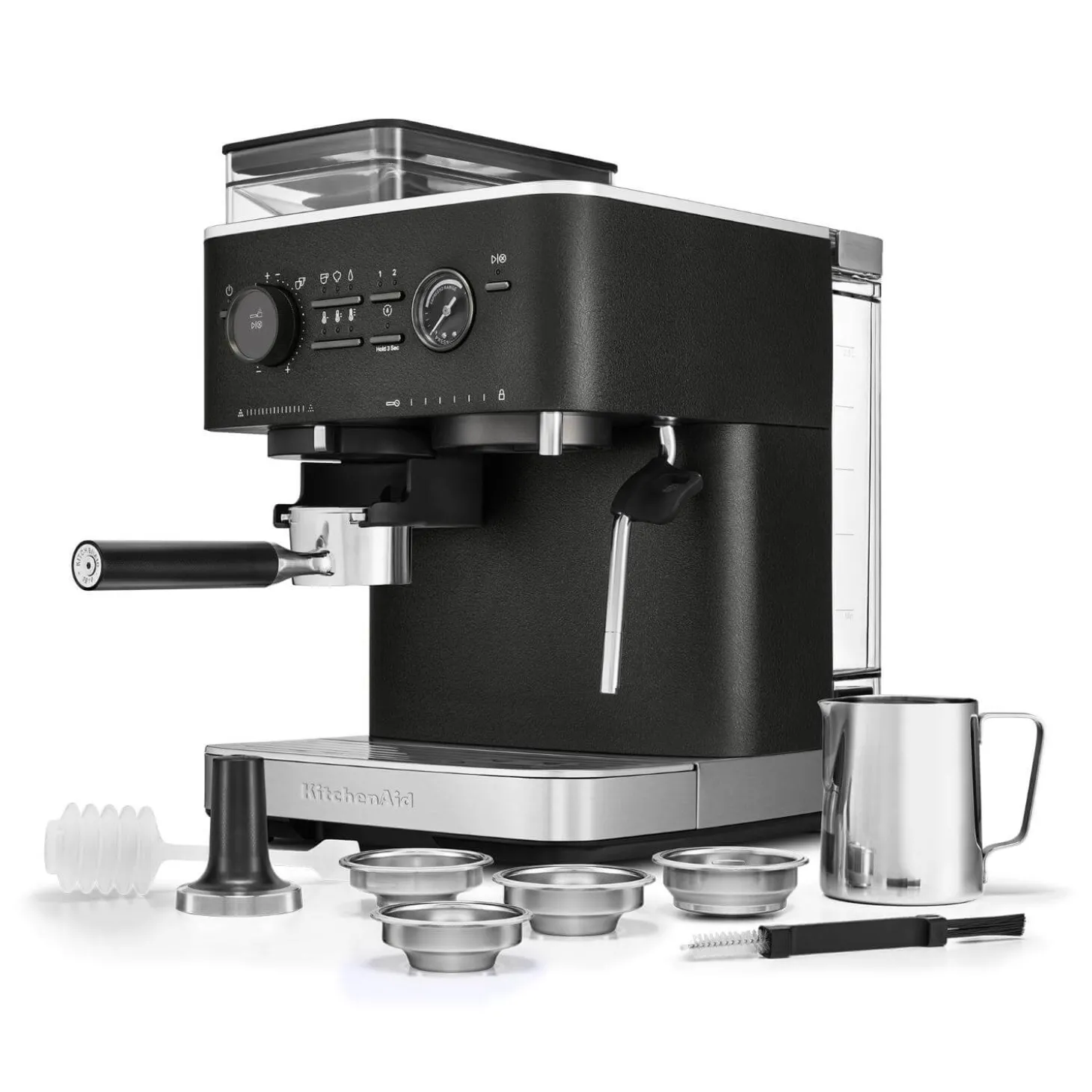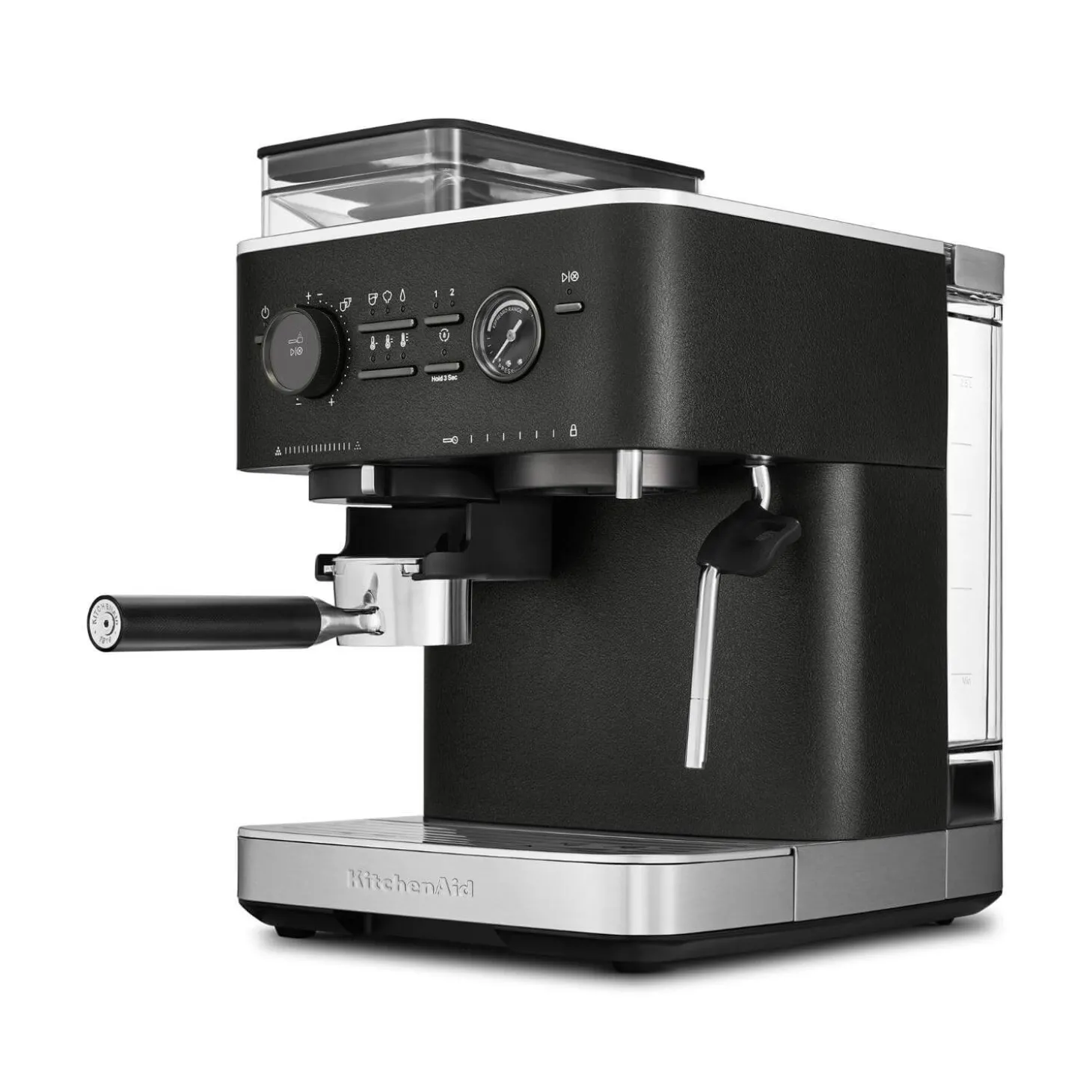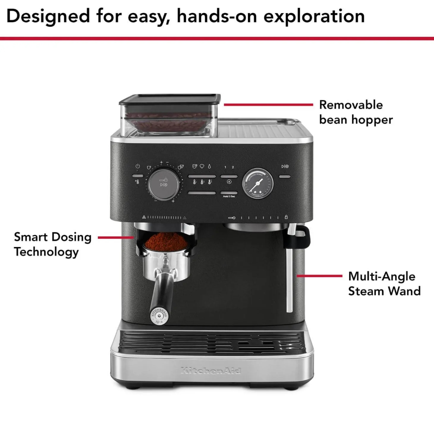 KitchenAid presents the Semi Automatic Bean to Cup Espresso Machine with Burr Grinder in Cast Iron Black. The smart dosing technology simplifies the preparation of espresso by producing the perfect volume and consistency for one or two shots at the push of a button. If you prefer, you can manually adjust the exact amount of coffee grounds in the portafilter. You’ll be able to brew coffee that caters to all your family and friends, making you your very own barista at home!