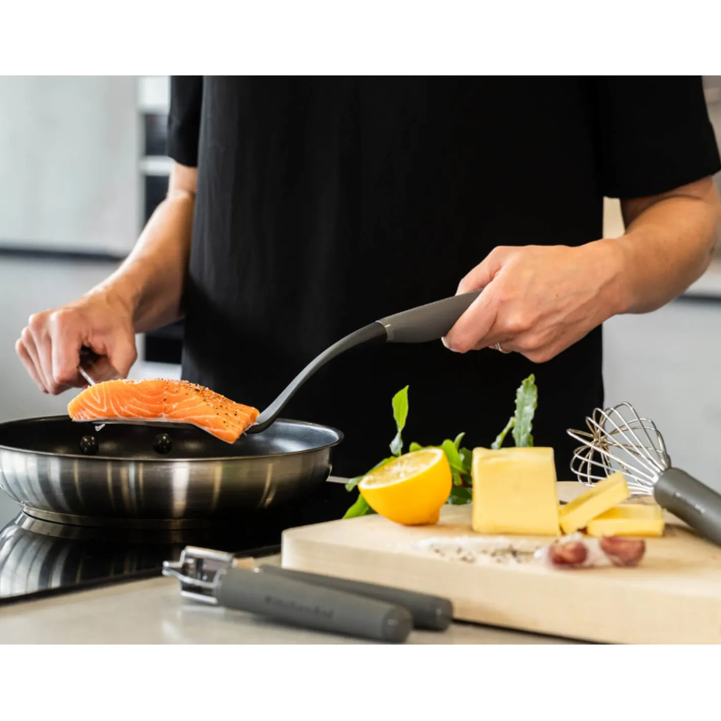 KitchenAid presents the Soft Grip Slotted Turner in Charcoal Grey, this turner is perfect for turning, flipping and straining when cooking. It is made of strong and durable material and can be safely used on all cookware, including non-stick ones. The handle has a soft grip and features an embossed logo, along with a satin chrome-plated bolster and a hanging loop.