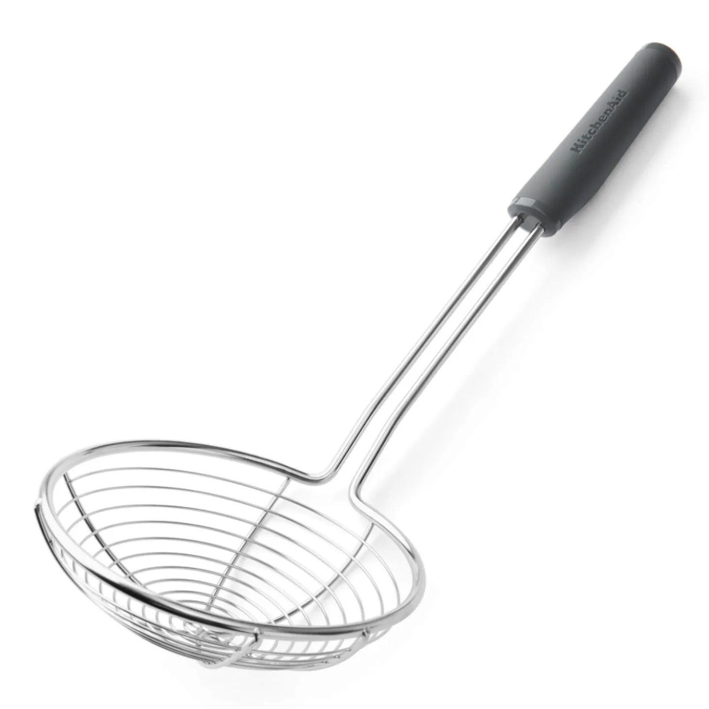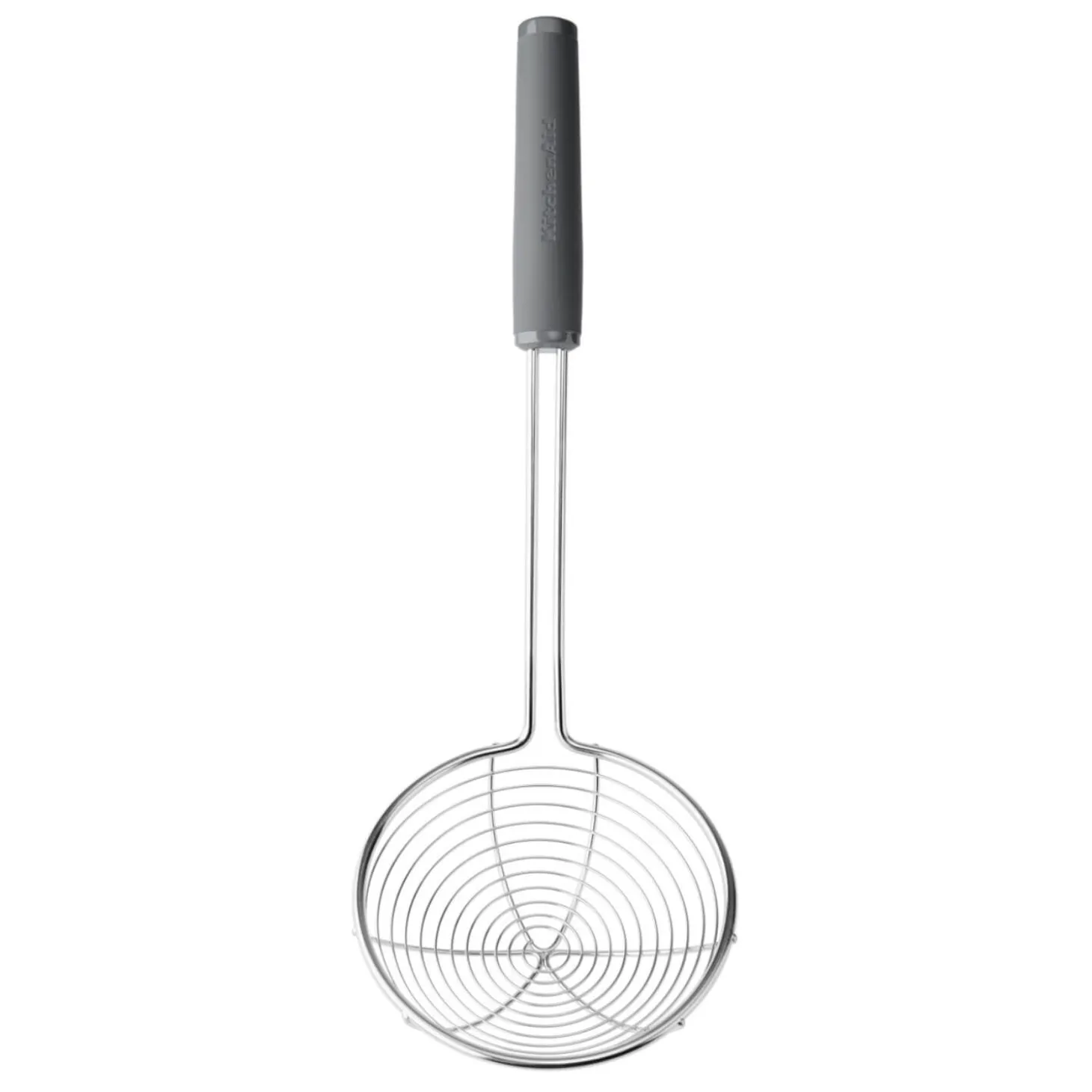 KitchenAid presents the Soft Grip Wire Skimmer in Charcoal Grey, perfect for picking up dumplings and wontons with ease. Its extra-wide stainless steel basket quickly drains liquids, which makes it great for stir-frying or using a wok. Additionally, it’s ideal for straining pasta, vegetables, and other foods. The handle has a soft grip and features an embossed logo, along with a satin chrome-plated bolster and a hanging loop.