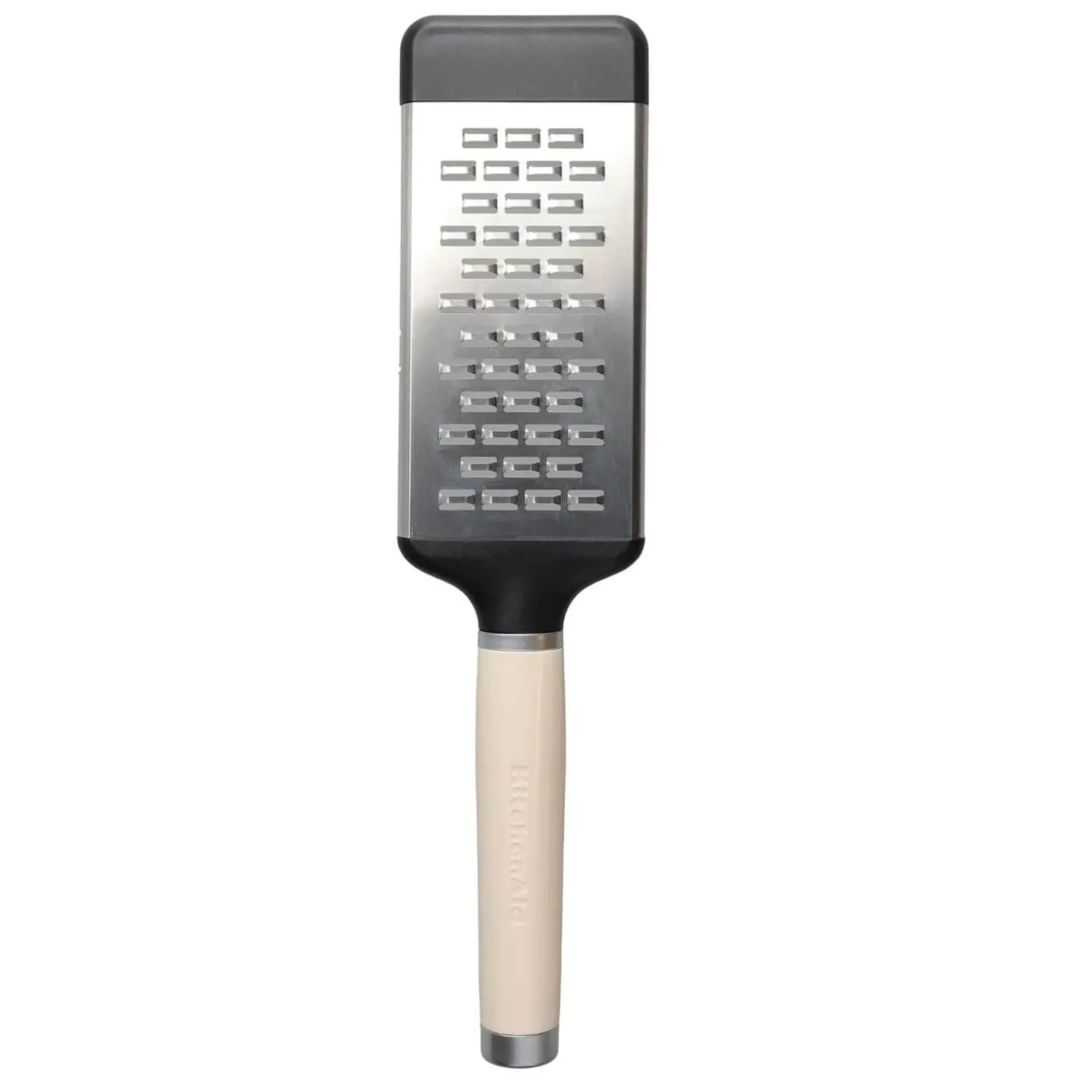 A simple but effective tool in the kitchen! KitchenAid presents this Stainless Steel Flat Grater in Almond Cream. With medium-sized grating holes, with the ability to grate in two directions, making this ideal for grating cheese, chocolate and vegetables at home for great tasting meals. Featuring a comfortable, ergonomic and soft-grip handle that allows you to grate with ease. This grater includes a protective blade cover for safe storage.Â