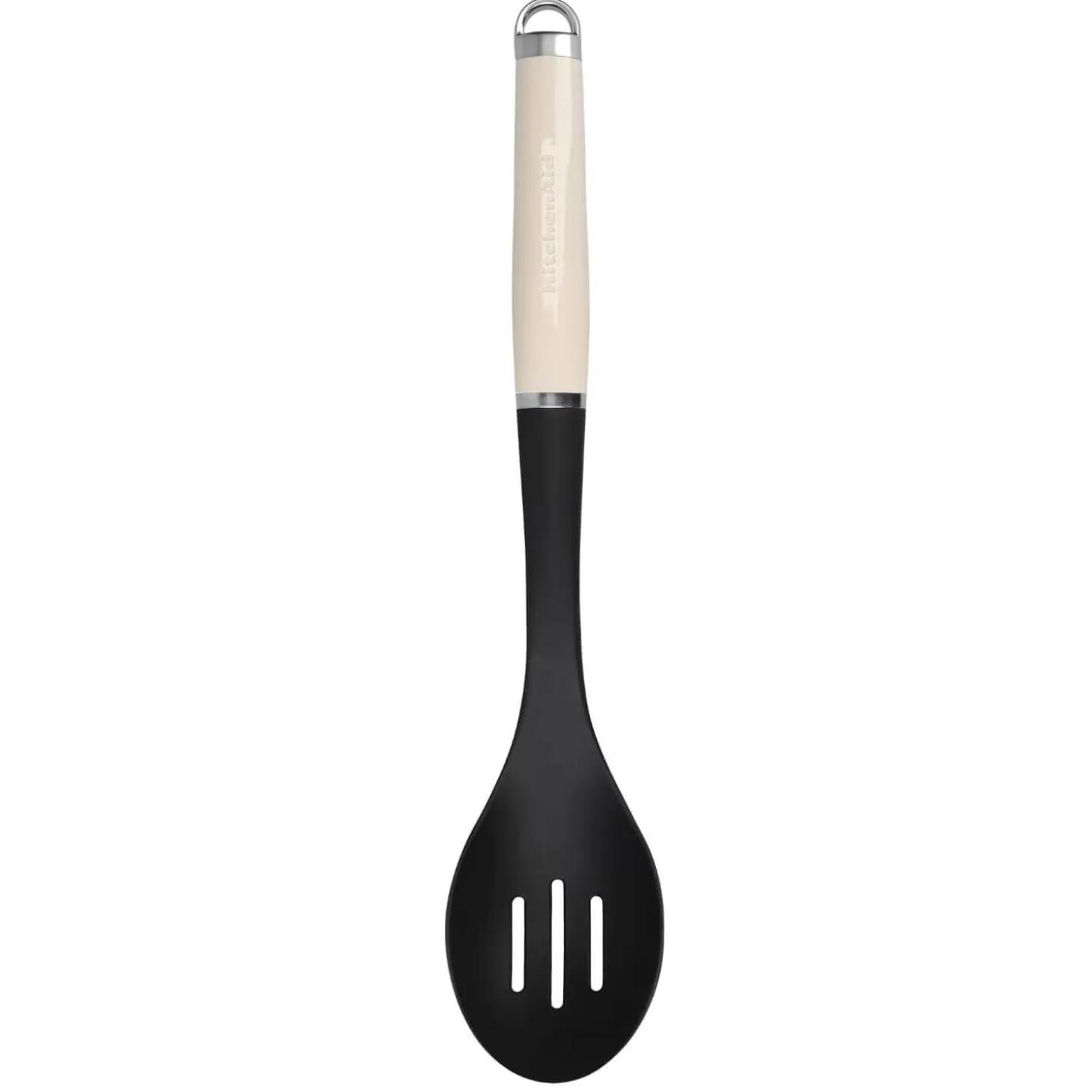 KitchenAid presents this Plastic Slotted Spoon in Almond Cream. Featuring a triple slotted head for scooping, stirring and draining ingredients quickly and efficiently. This spoon is safe to use on all types of cookware, including non-stick and is also heat resistant up to 232°C making this tool a kitchen essential!