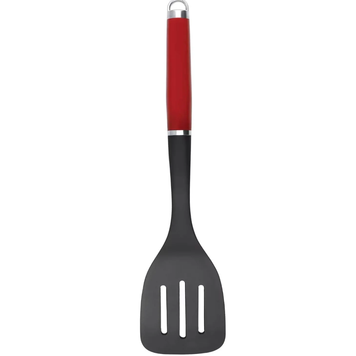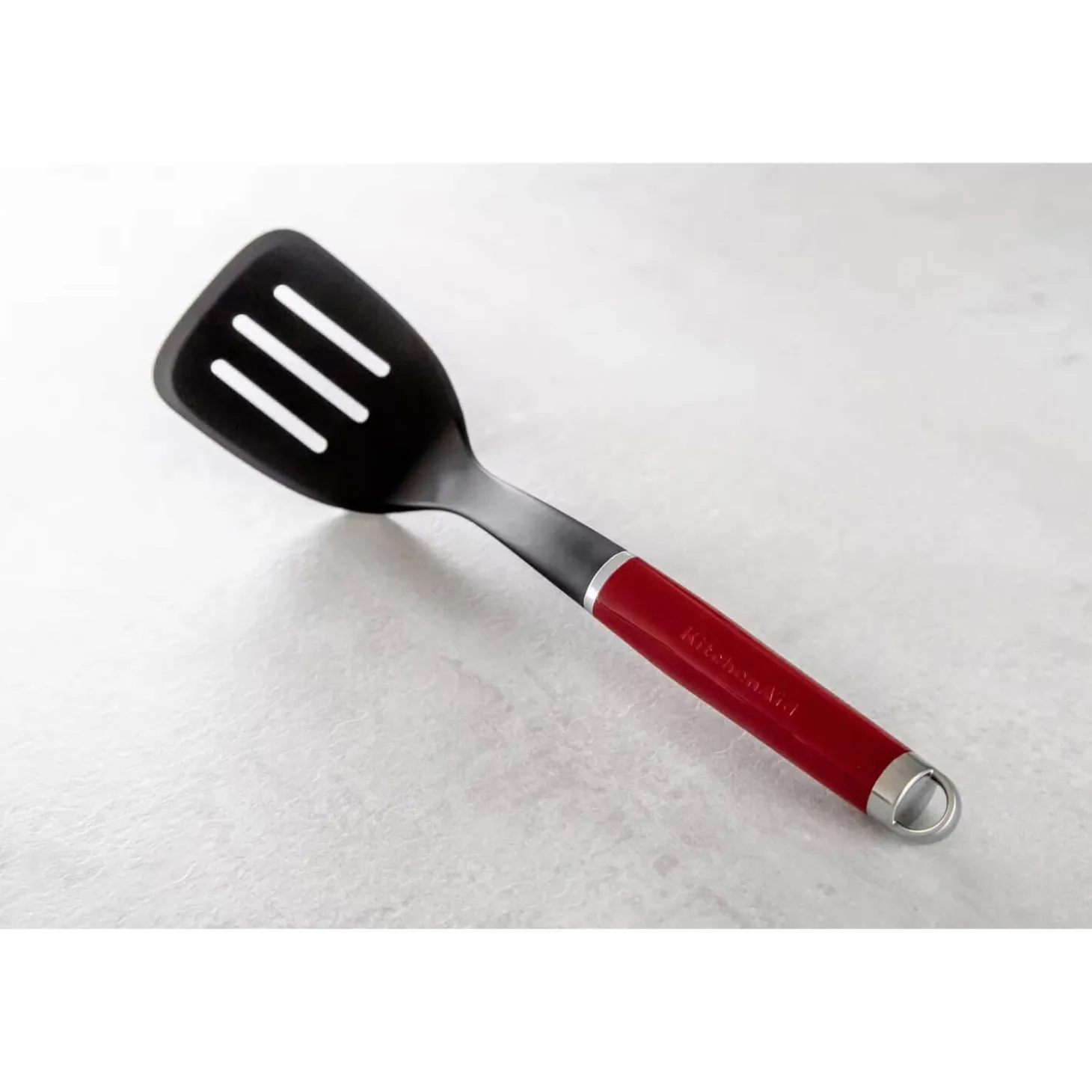KitchenAid presents this Plastic Slotted Turner in Empire Red. Featuring a triple slotted head for flipping and draining ingredients quickly and efficiently. This turner is safe to use on all types of cookware, including non-stick and is also heat resistant up to 232°C making this tool a kitchen essential!