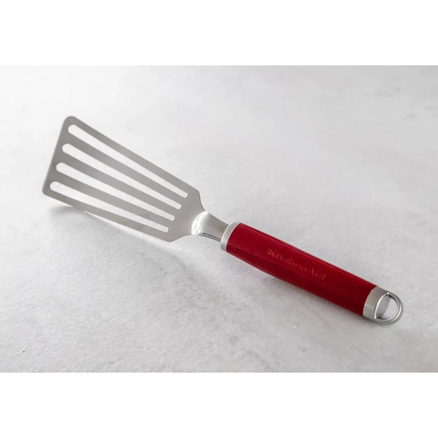 KitchenAid presents this Stainless Steel Flex Turner in Empire Red. Featuring a triple slotted head for flipping, lifting and draining delicate fish and other dishes quickly and efficiently. This turner features a balanced easy to grip comfortable handle which holds the 18/8 stainless steel head which is also dishwasher safe, for easy cleaning. Includes a 1-year guarantee.