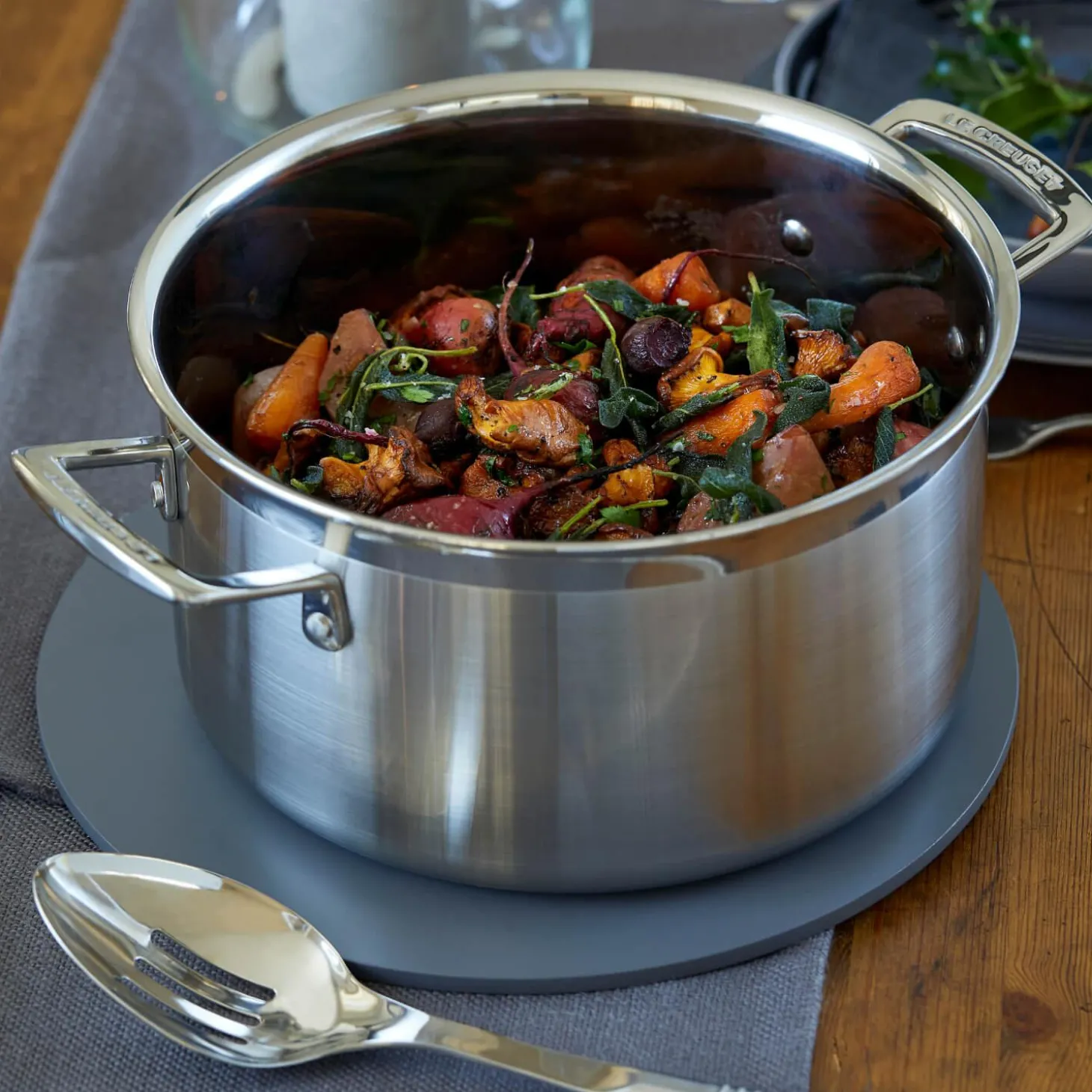 Create great-tasting casseroles and stews with this 24cm deep casserole dish which forms part of the 3-ply range of stylish stainless steel cookware by Le Creuset. Created using a durable multi-layering technique including a magnetic steel base, aluminium core and mirror polished stainless steel exterior for the ultimate heat distribution and is perfect for use in everyday cooking tasks! The added helper handle enables the pan to be moved easily and safely from hob to oven to accommodate a huge variety of dishes whilst also being compatible with induction hobs. An essential for any type and style of kitchen.