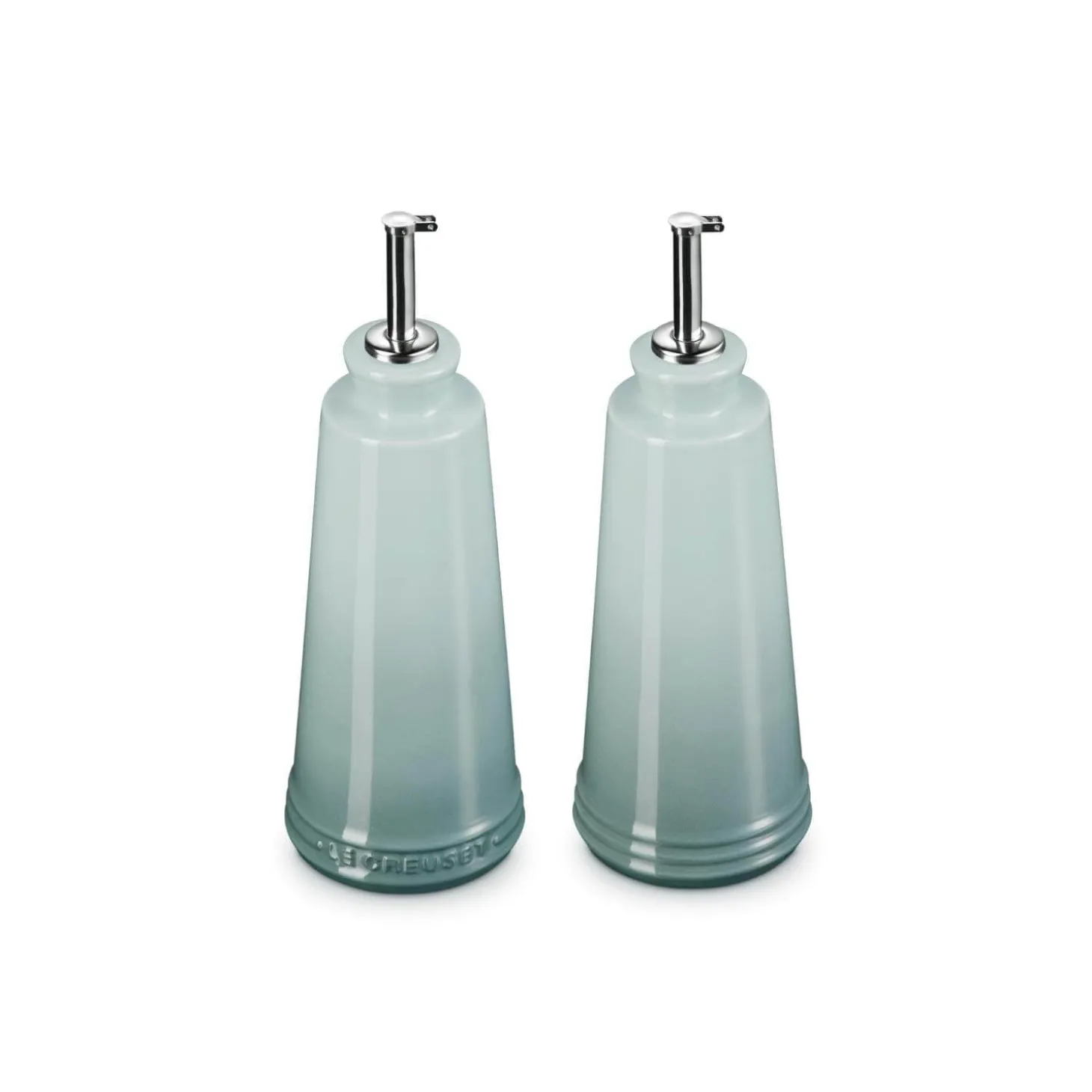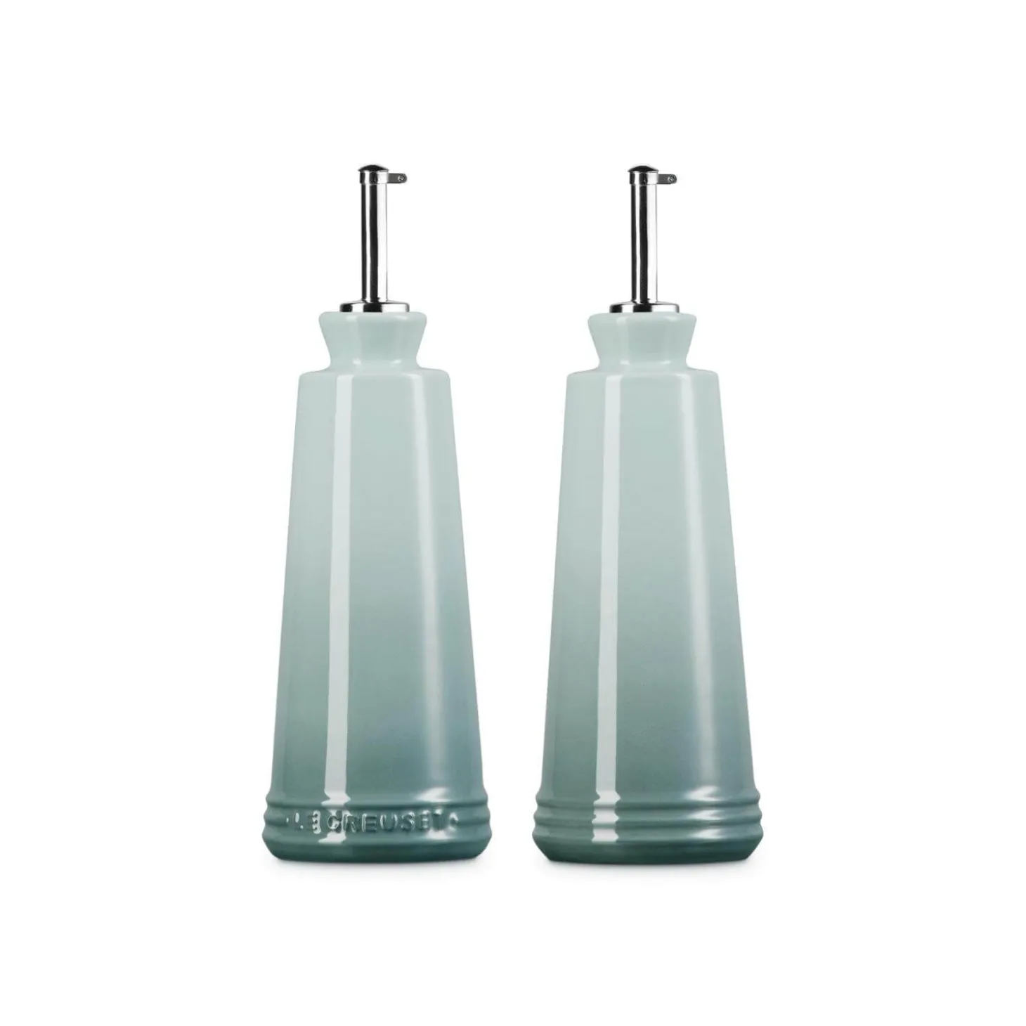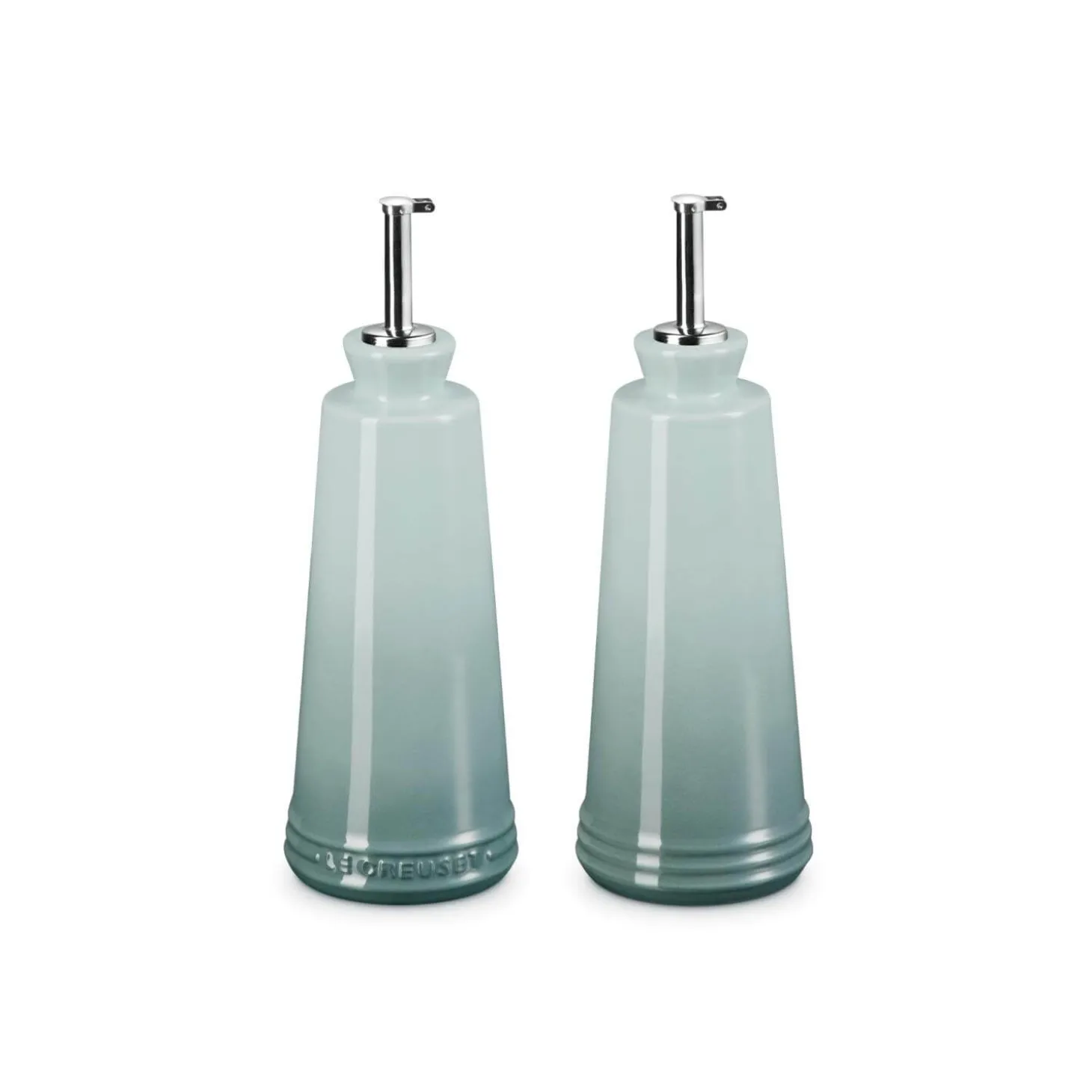 This Stoneware Oil & Vinegar Set by Le Creuset in Sea Salt is a stylish and contemporary kitchen edition ideal for everyday cooking and use at the table when entertaining. Created from specialist clays and fired at high temperatures to ensure unmatched quality and durability. Easy to clean scratch-resistant enamel coatings with stainless steel nozzles for precise pouring.