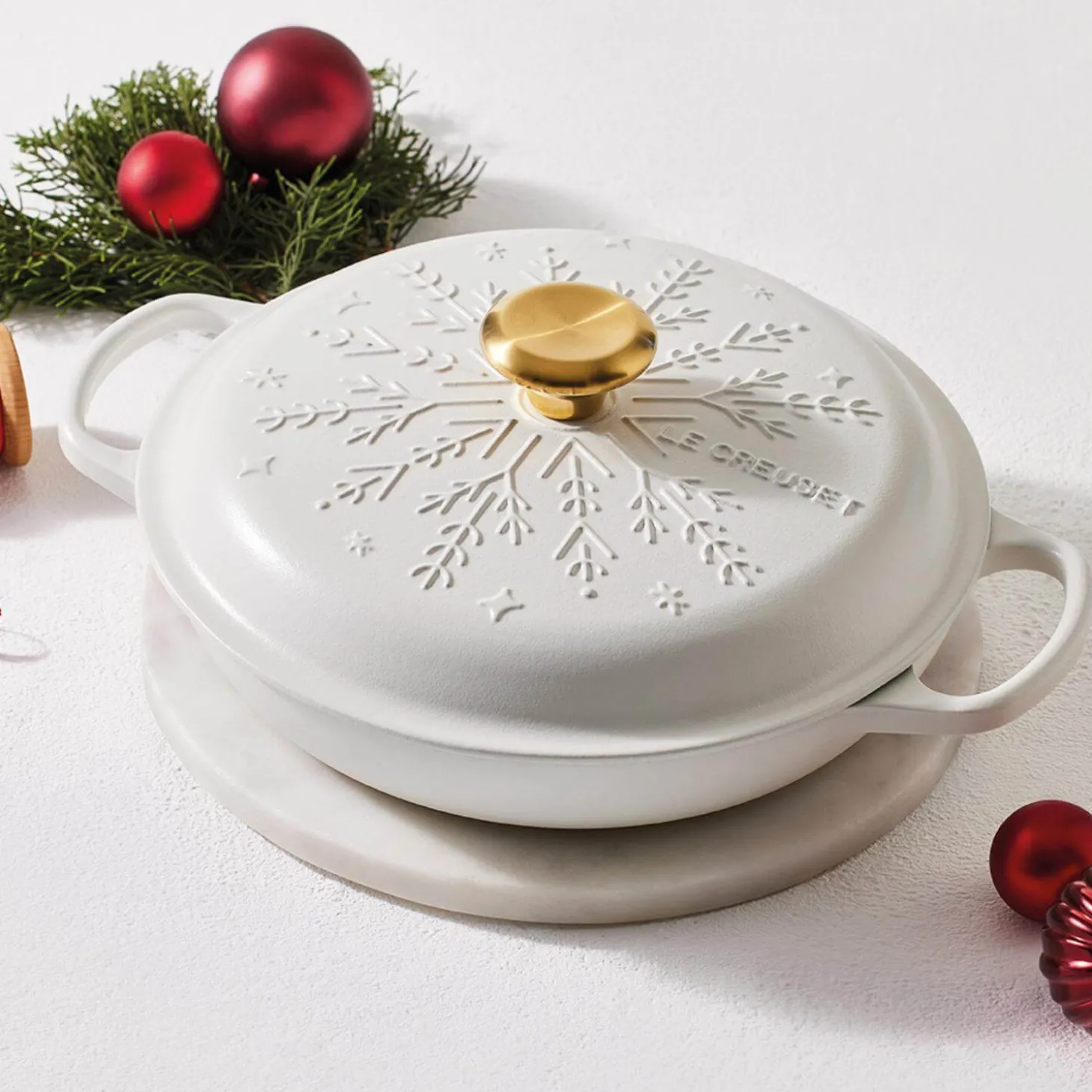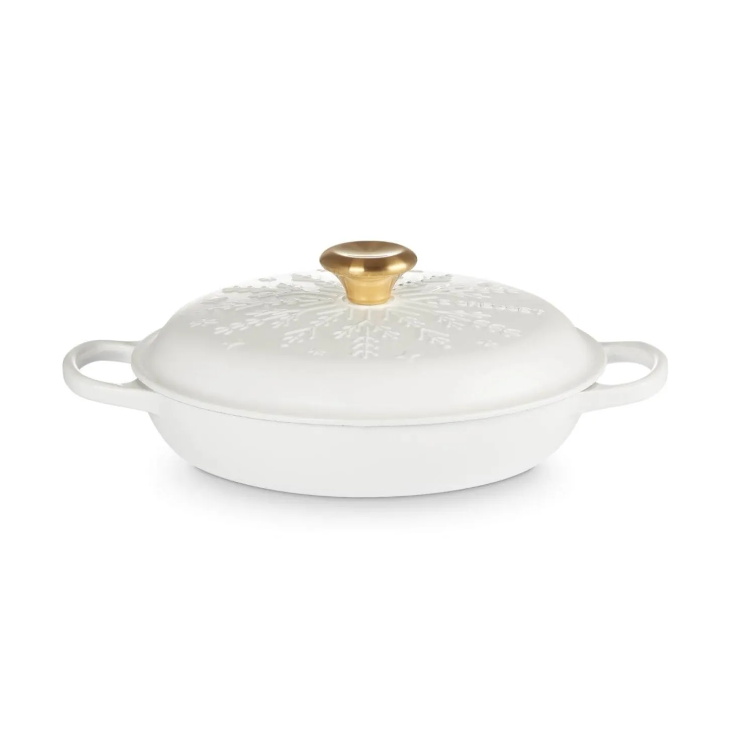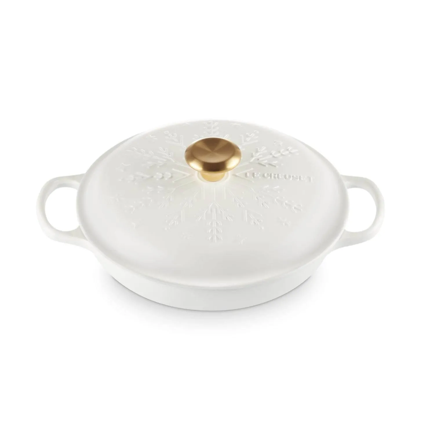 This Signature Snowflakes cast iron 26cm round casserole in White by Le Creuset forms part of their Christmas collection. A versatile and timeless choice this dish can be applied to a variety of recipes including stews, roasts, bread making, soups and much more. Each cast iron piece has been handcrafted in France by skilled craftsmen with an expert enamel finish that is easy to clean and does not absorb stains or odours. These dishes can be used on all hob types including induction and feature an ergonomic stainless steel gold knob with the Le Creuset logo visible on the top.Â