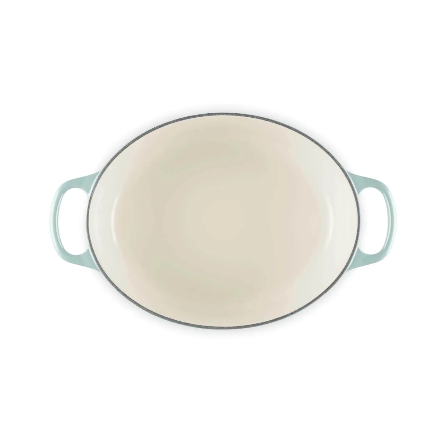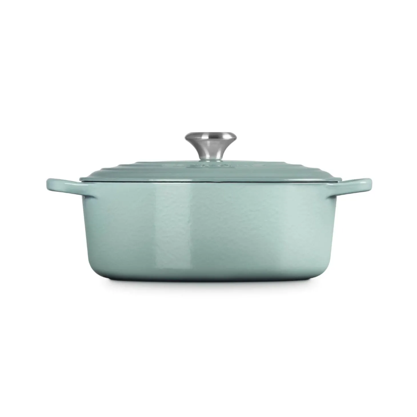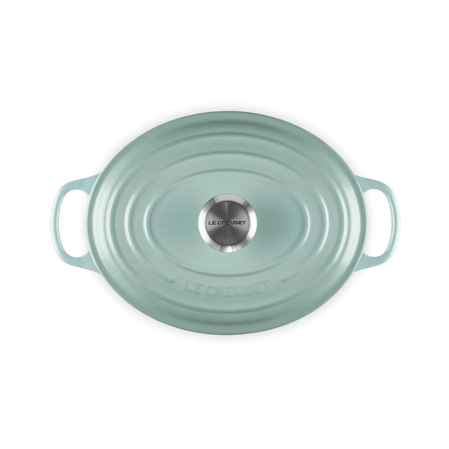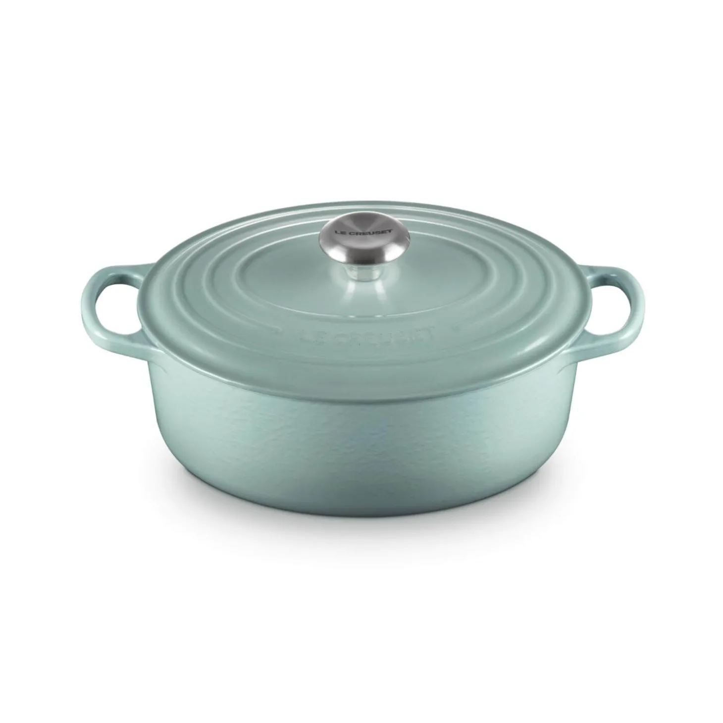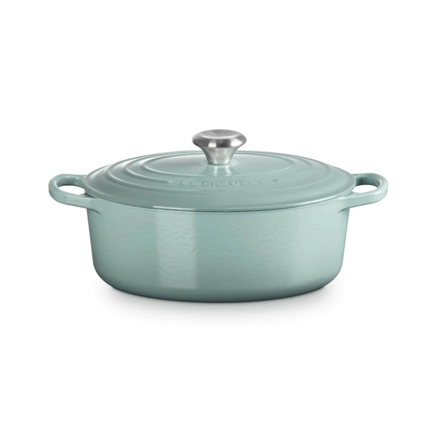 This on-trend Signature cast iron 27cm oval casserole by Le Creuset forms part of their Sea Salt colourway collection. A versatile and timeless choice this dish can be applied to a variety of recipes including stews, roasts, bread making, soups and much more. Each cast iron piece has been handcrafted in France by skilled craftsmen with an expert enamel finish that is easy to clean and does not absorb stains or odours. These dishes can be used on all hob types including induction and feature an ergonomic stainless steel knob with the Le Creuset logo visible on the top. Other shapes, sizes and colours are also available.