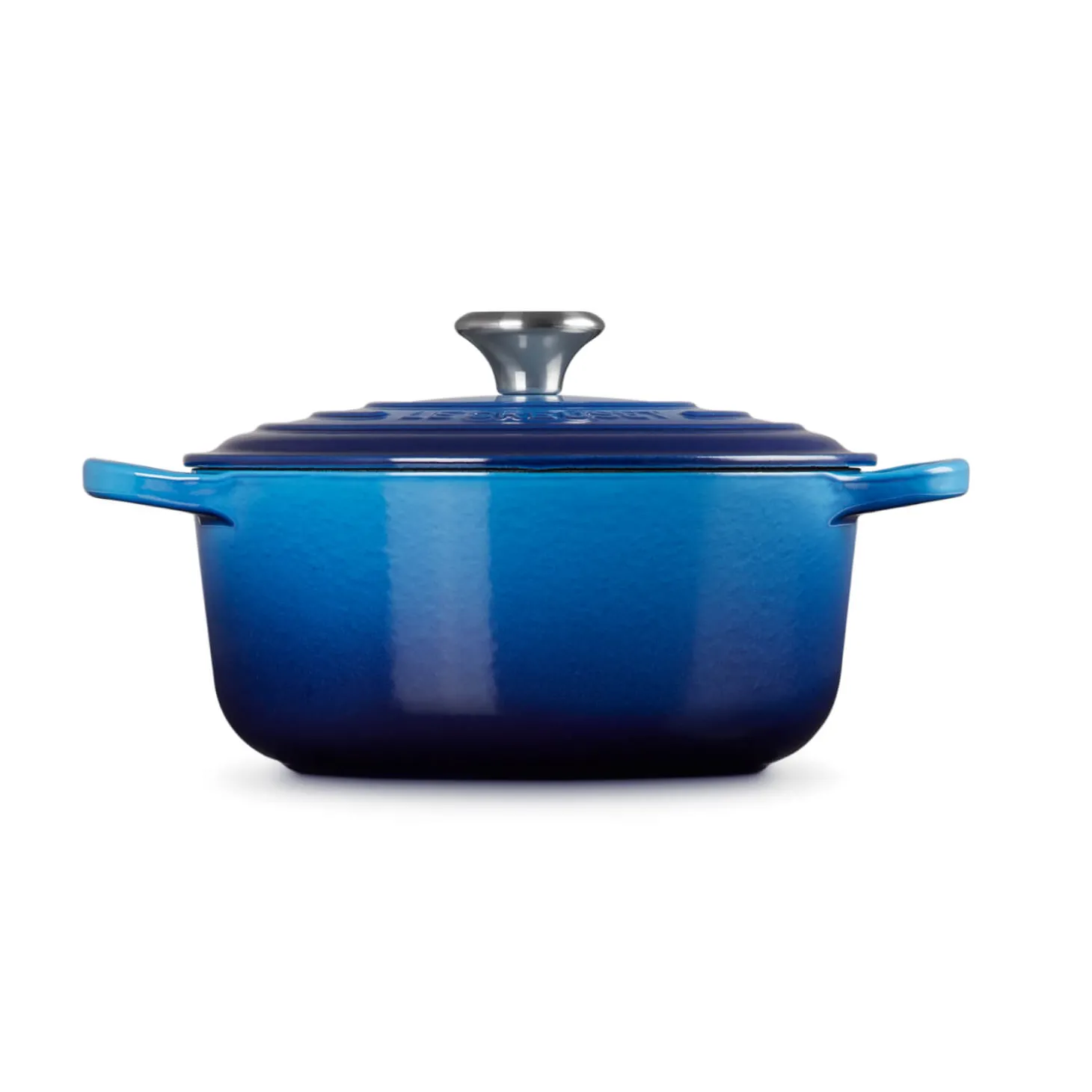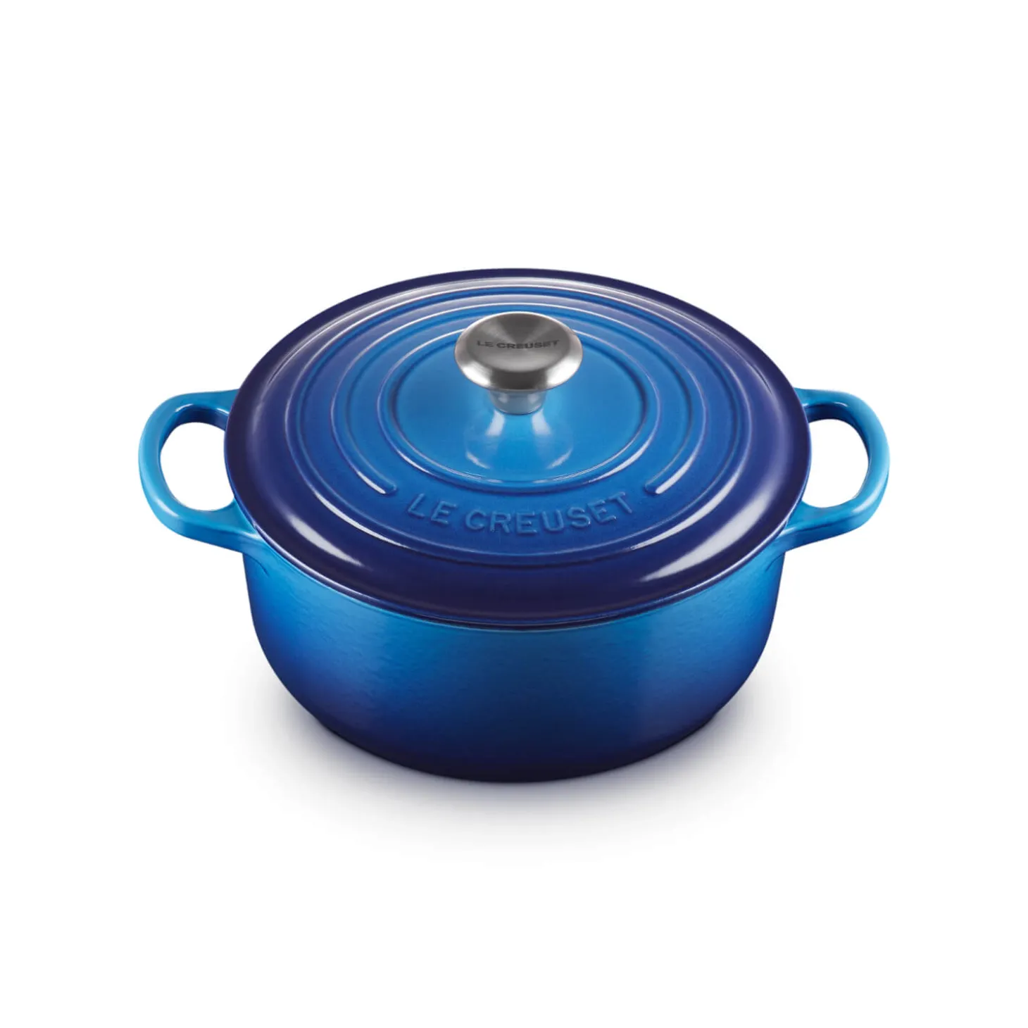 The Signature cast iron 20cm casserole dish in Azure by Le Creuset is a timeless kitchen essential. The dish can be applied to a whole variety of recipes ranging from stews, roasts, bread and much more. This casserole dish has been handcrafted in France using cast iron and can be used on all hob types including induction. The Signature range also features enamel easy clean interiors, ergonomic stainless steel knobs and a variety of vibrant colours.