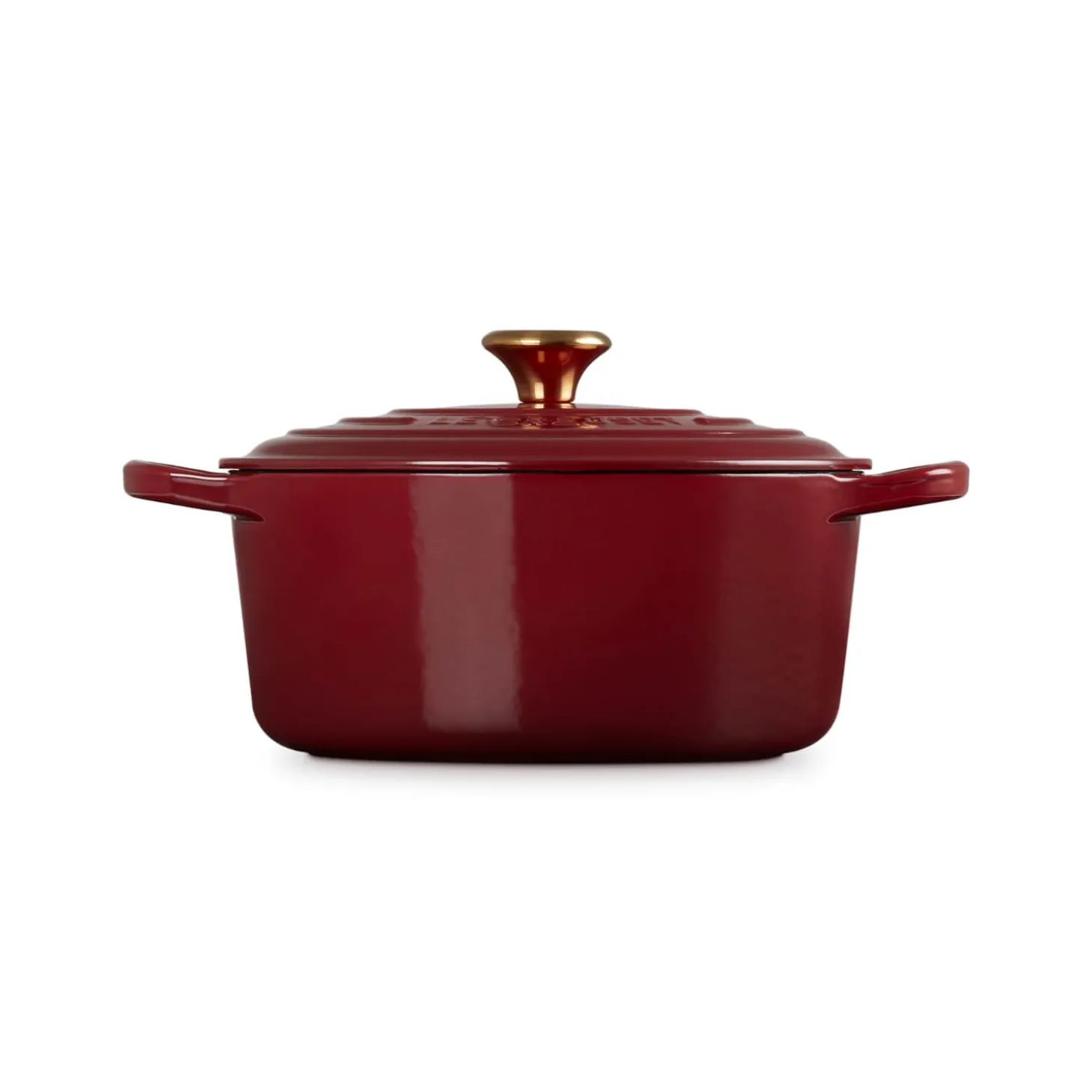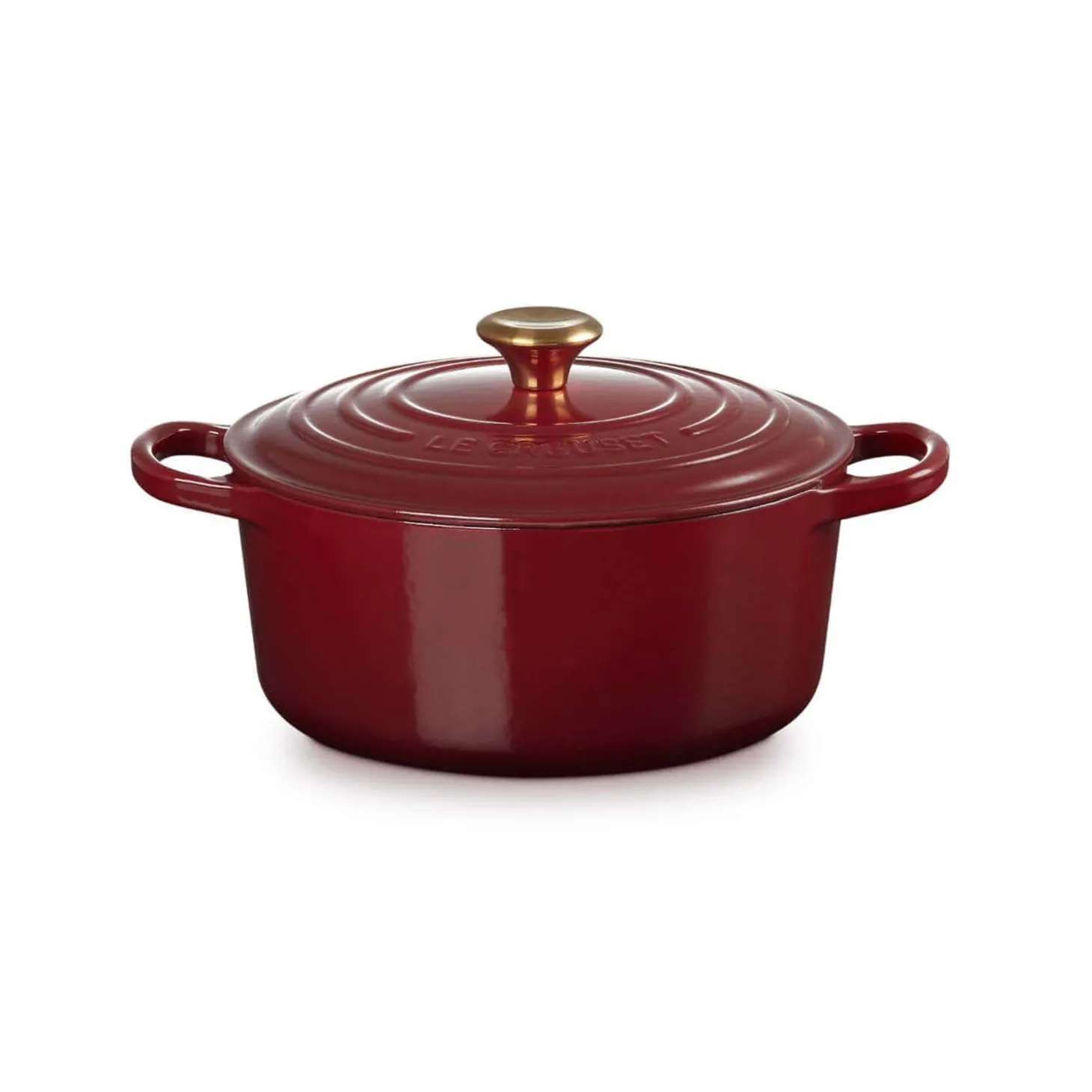 This on-trend Signature cast iron 22cm round casserole by Le Creuset forms part of their Garnet colourway collection. A versatile and timeless choice this dish can be applied to a variety of recipes including stews, roasts, bread making, soups and much more. Each cast iron piece has been handcrafted in France by skilled craftsmen with an expert enamel finish that is easy to clean and does not absorb stains or odours. These dishes can be used on all hob types including induction and feature an ergonomic stainless steel gold knob with the Le Creuset logo visible on the top. Indulge in the stunning Garnet colour a luxurious shade of deep red and experience a sense of sophistication and elegance like never before