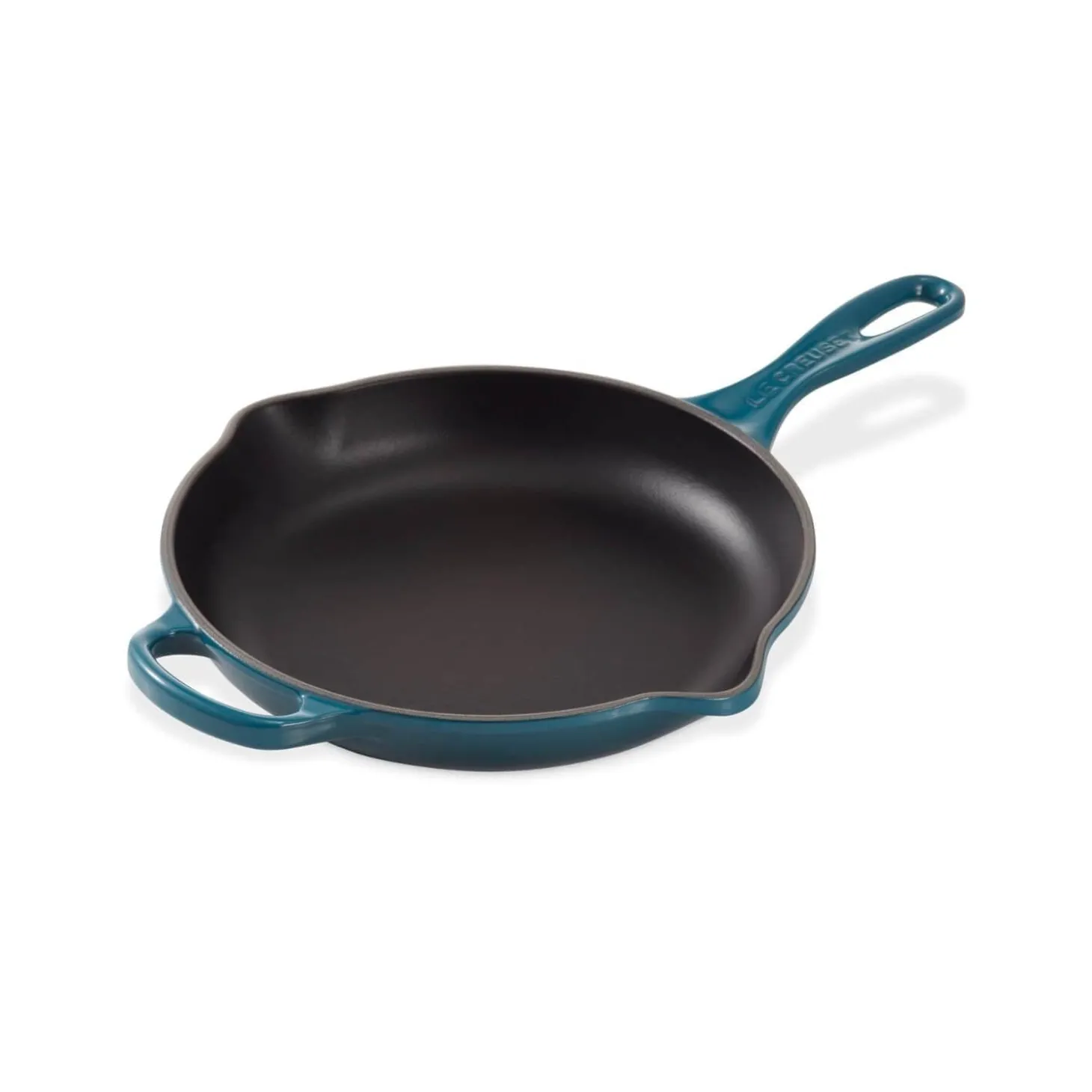Perfect for a variety of tasks this Signature cast iron 23cm skillet in Deep Teal from Le Creuset has been expertly crafted from using cast iron that has excellent heat distribution and retention qualities. With low to medium heat, you can sear and brown food quickly and the enamelled surface will develop a natural patina that will behave like a non-stick surface and add a unique flavour over time. This frying pan also has a useful helper handle for easy carrying from hob to table and has two drip-free pouring lips for added convenience. Each skillet pan in the range is covered by a lifetime guarantee and is available in a variety of vibrant colourways.