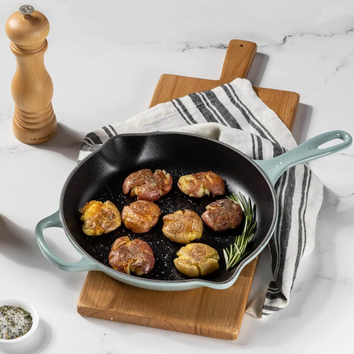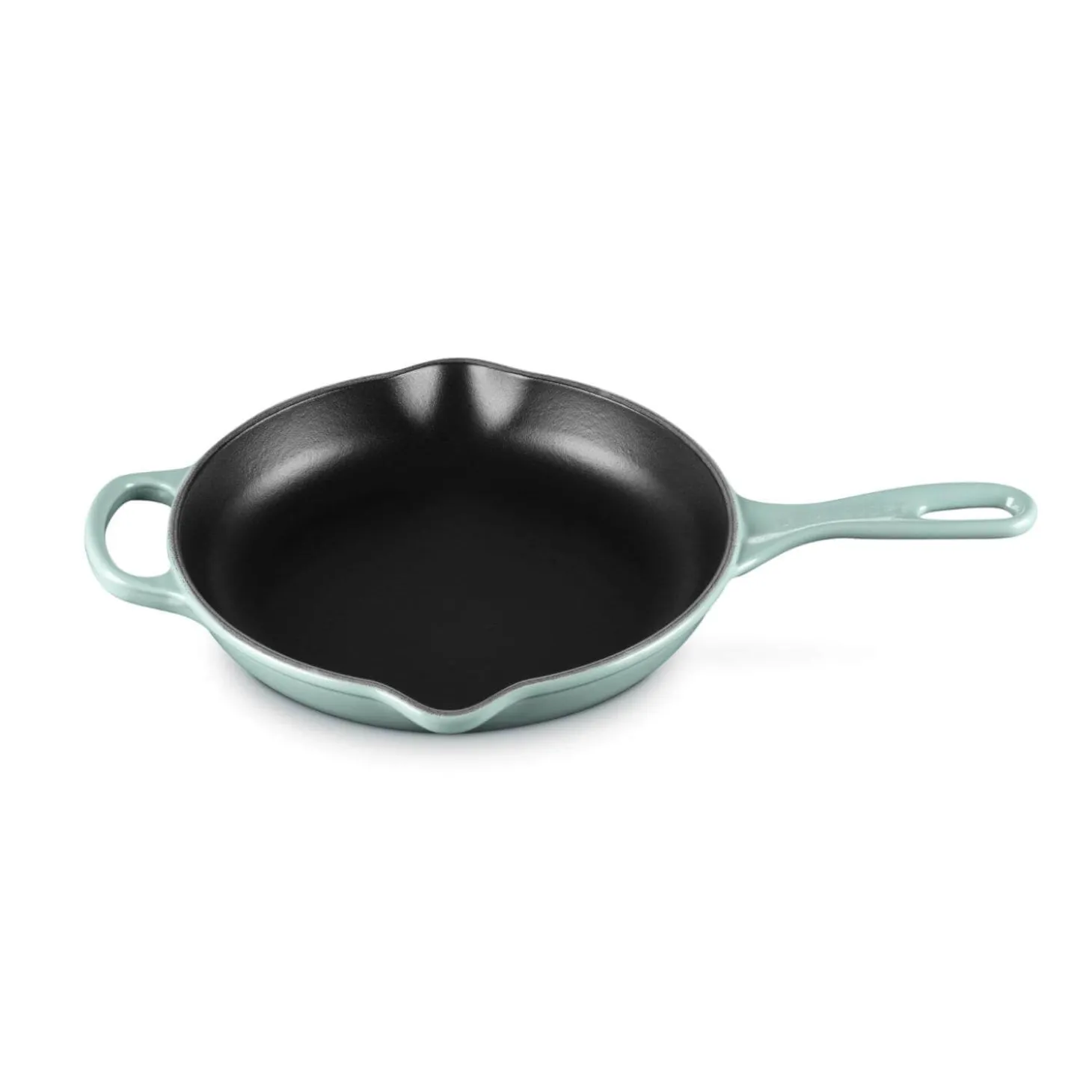 Perfect for a variety of tasks this Signature cast iron 23cm skillet in Sea Salt from Le Creuset has been expertly crafted from using cast iron that has excellent heat distribution and retention qualities. With low to medium heat, you can sear and brown food quickly and the enamelled surface will develop a natural patina that will behave like a non-stick surface and add a unique flavour over time. This frying pan also has a useful helper handle for easy carrying from hob to table and has two drip-free pouring lips for added convenience. Each skillet pan in the range is covered by a lifetime guarantee and is available in a variety of vibrant colourways.
