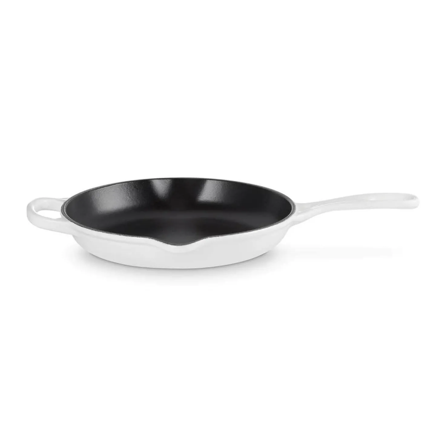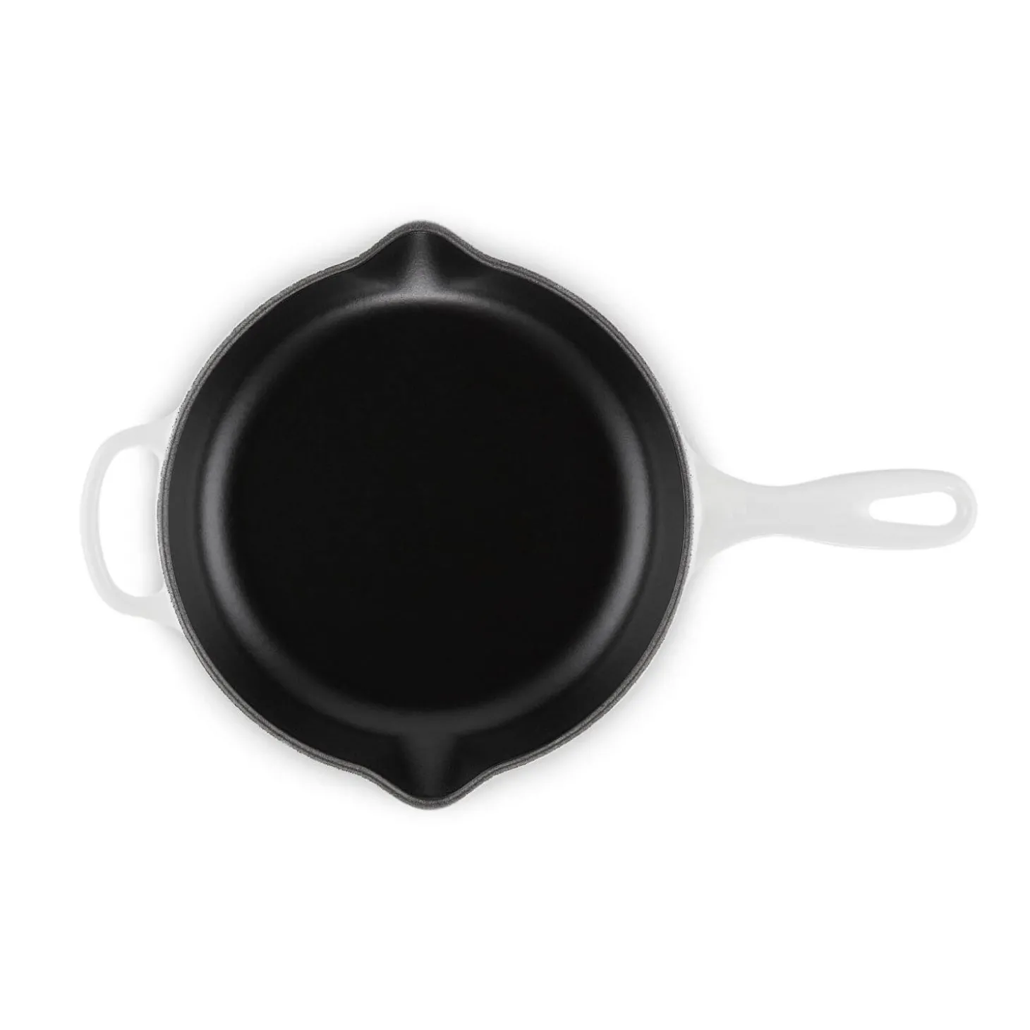 Perfect for a variety of tasks this Signature cast iron 23cm skillet in White from Le Creuset has been expertly crafted from using cast iron that has excellent heat distribution and retention qualities. With low to medium heat, you can sear and brown food quickly and the enamelled surface will develop a natural patina that will behave like a non-stick surface and add a unique flavour over time. This frying pan also has a useful helper handle for easy carrying from hob to table and has two drip-free pouring lips for added convenience.Â