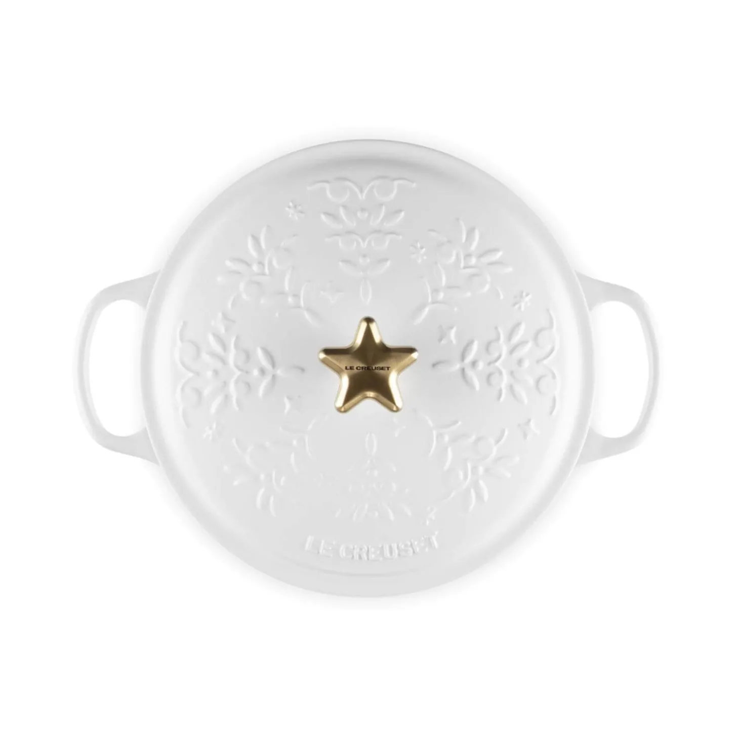 This Signature Noel cast iron 24cm round casserole in Cotton by Le Creuset forms part of their Christmas collection. A versatile and timeless choice this dish can be applied to a variety of recipes including stews, roasts, bread making, soups and much more. Each cast iron piece has been handcrafted in France by skilled craftsmen with an expert enamel finish that is easy to clean and does not absorb stains or odours. These dishes can be used on all hob types including induction and feature an ergonomic stainless steel gold knob with the Le Creuset logo visible on the top. Perfect for presenting all your delicious meals this coming festive season.