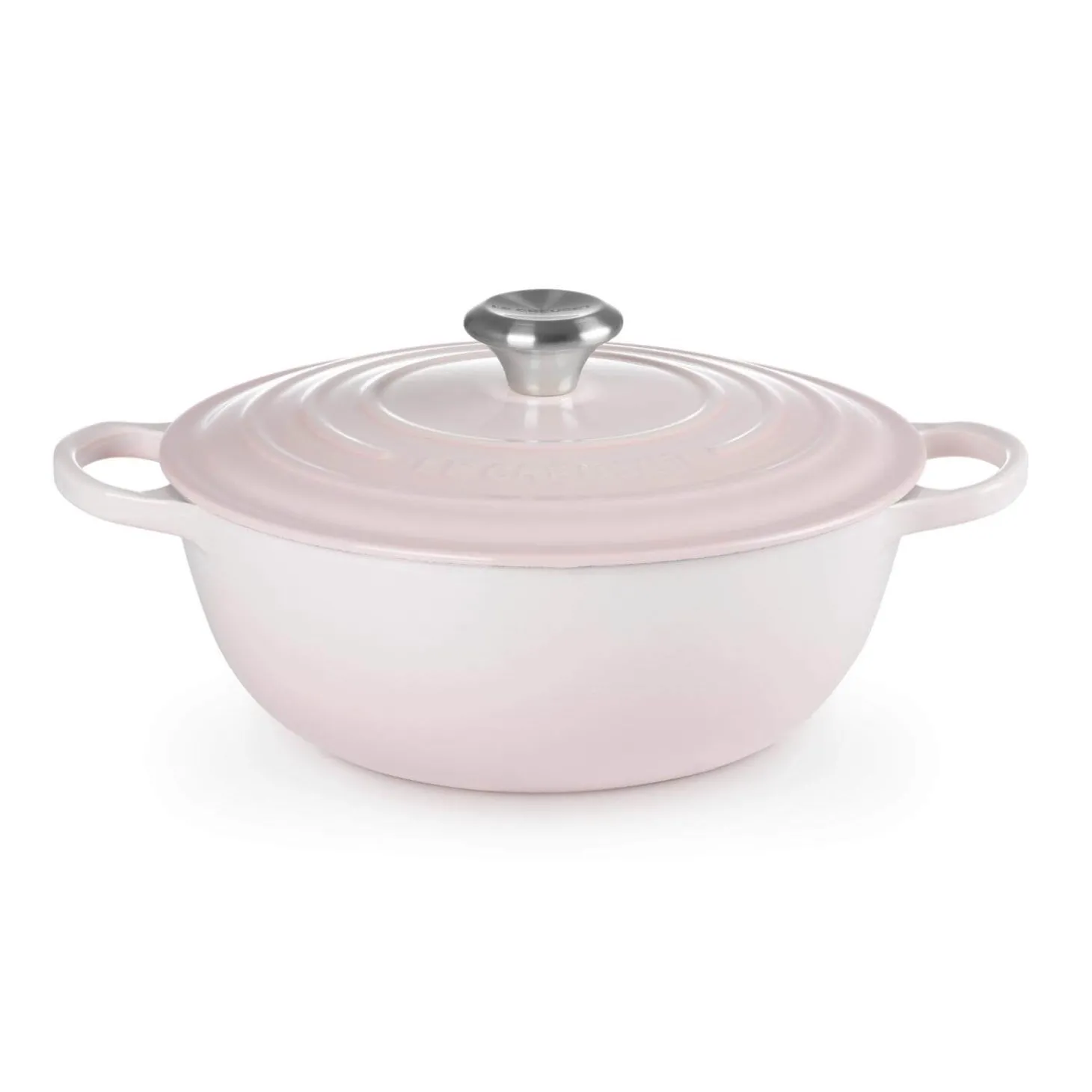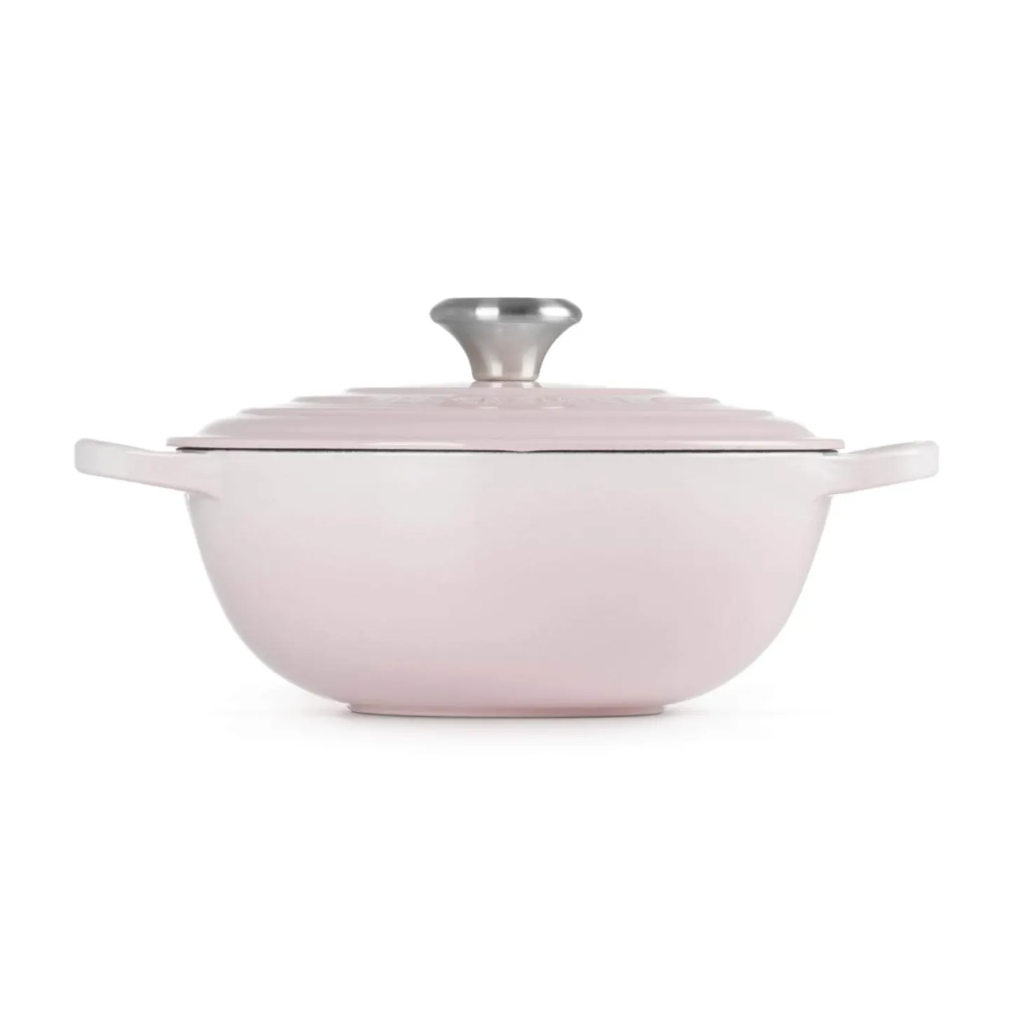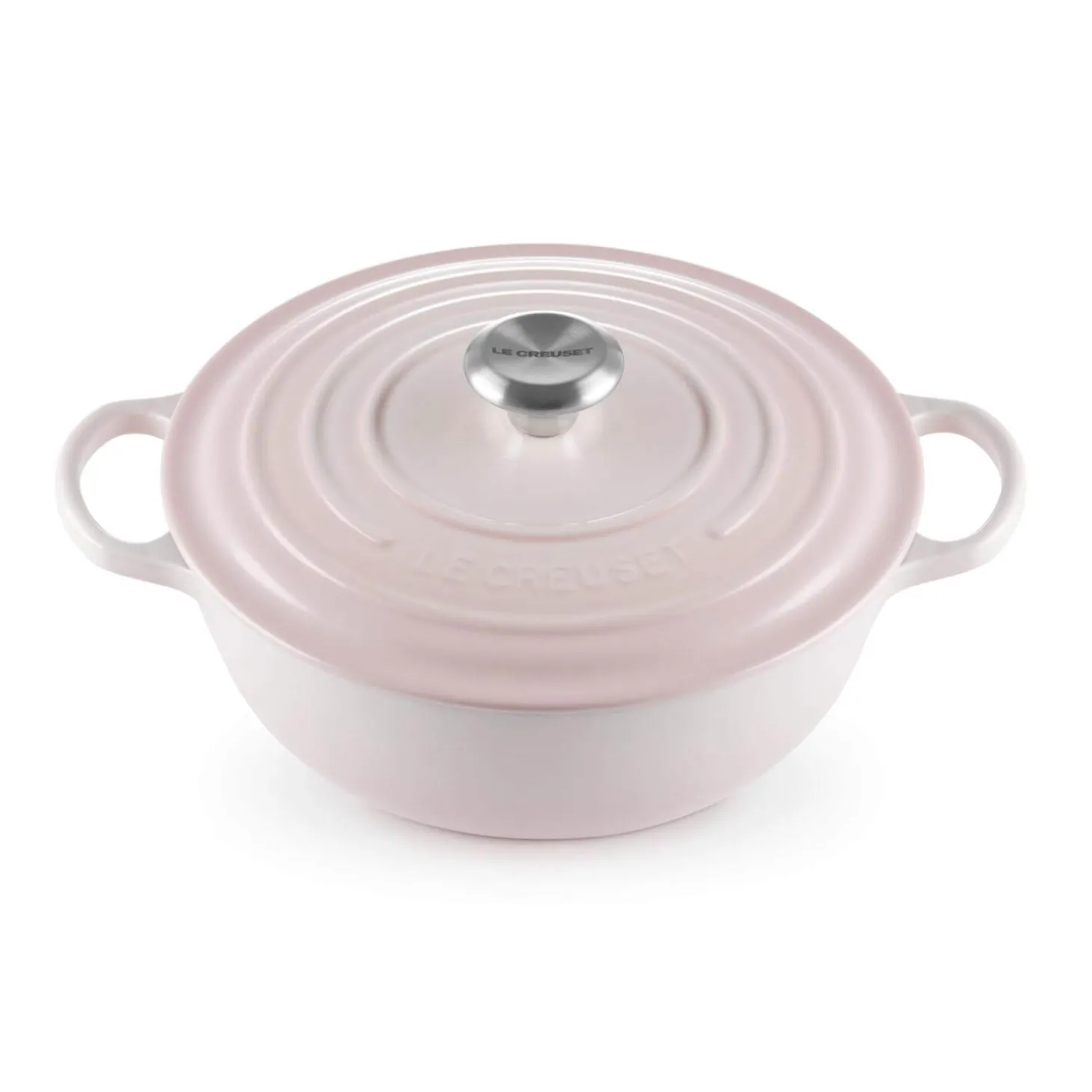 This cast iron 24cm Soup Pot in Shell Pink by Le Creuset forms part of their Signature collection. A versatile and timeless choice this pot can be applied to a variety of recipes including soups, beef bourguignon, bouillabaisse, casseroles, one-pot cooking and much more. Each cast iron piece has been handcrafted in France by skilled craftsmen with an expert enamel finish that is easy to clean and does not absorb stains or odours. These pots can be used on all hob types including induction and feature an ergonomic stainless steel knob with the Le Creuset logo visible on the top.Â