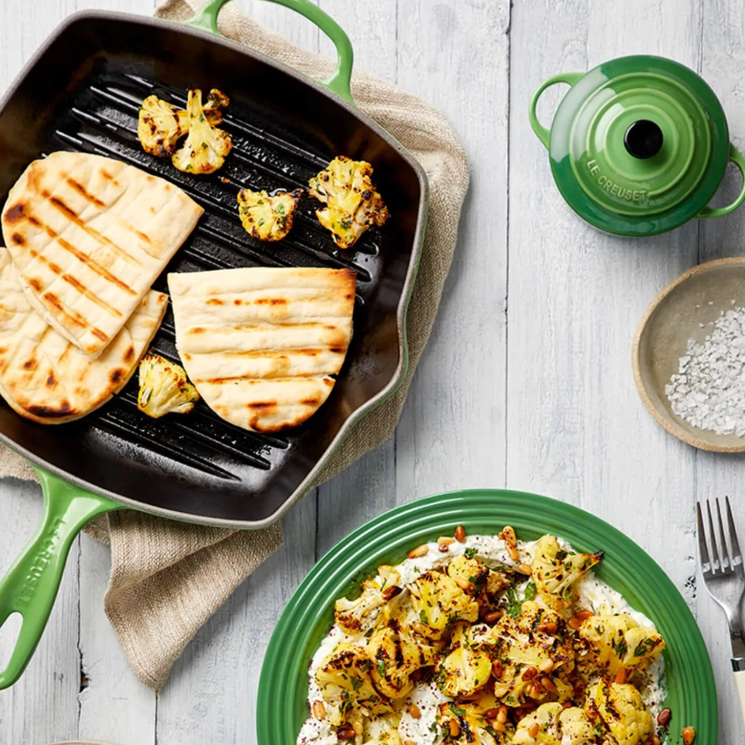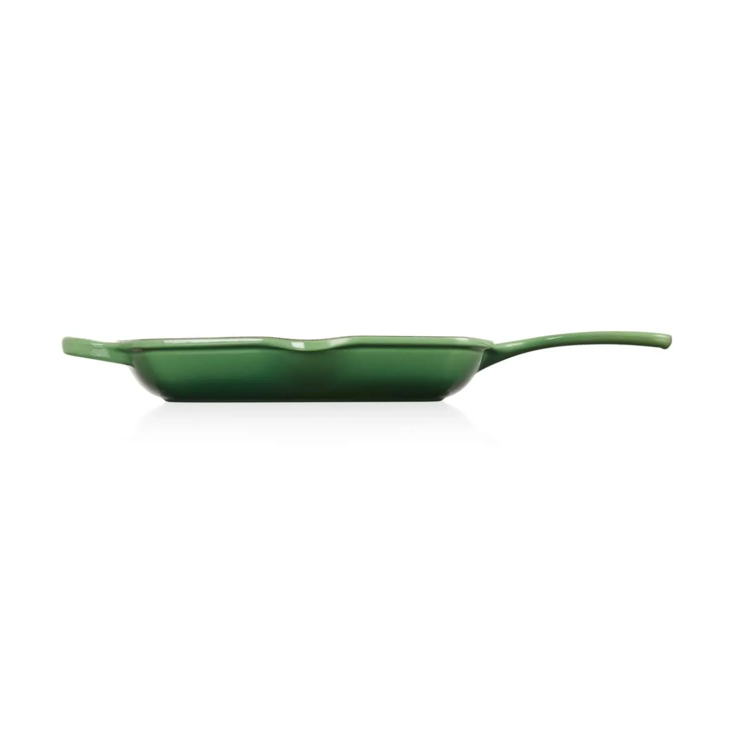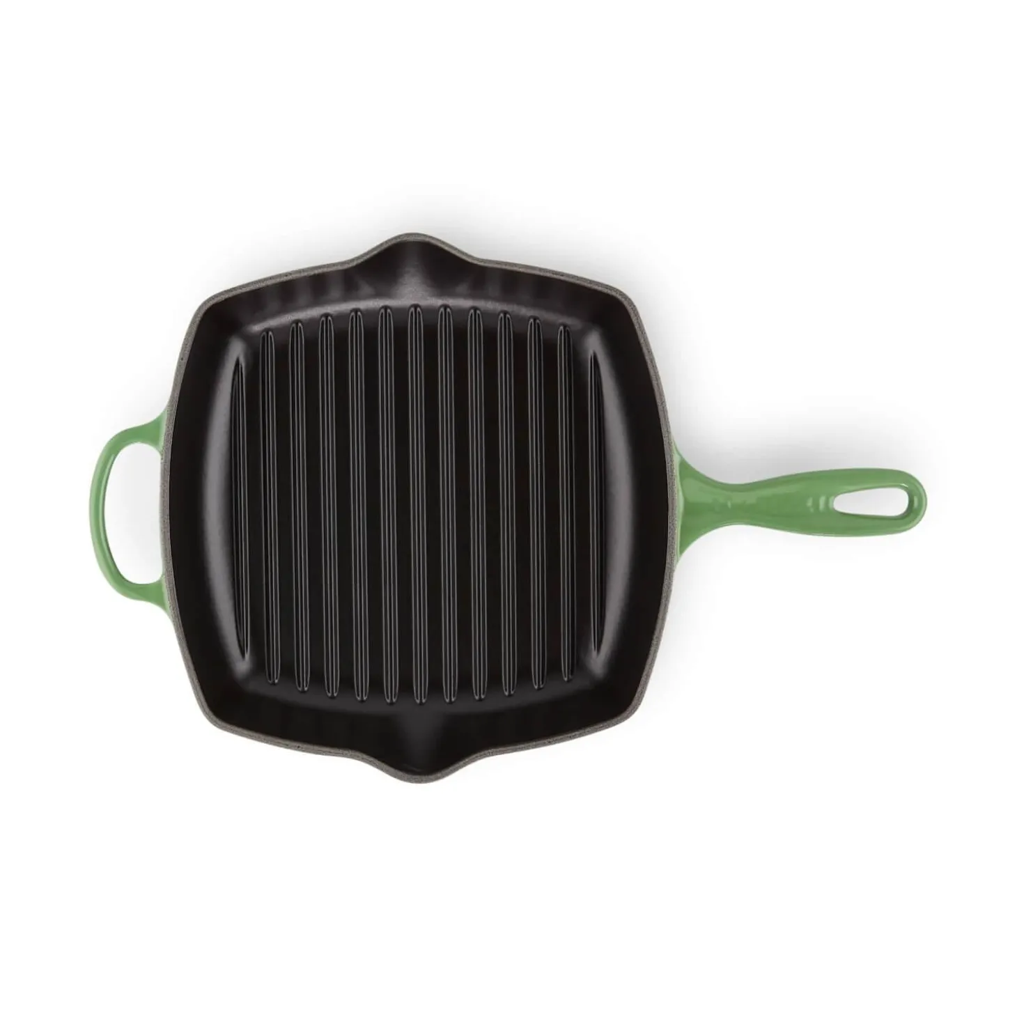 This Signature 26cm square cast iron grill pan in Bamboo (green) by Le Creuset is ideal for grilling and searing a variety of ingredients such as chicken, steak, fish, vegetables and much more. The grill features a ridged cooking surface that allows excess fat and oil to drain away allowing for a healthier way of cooking and achieving those signature char lines. Created from cast iron the grill also has an enamelled coating which over time will achieve a natural patina and enhance flavour.