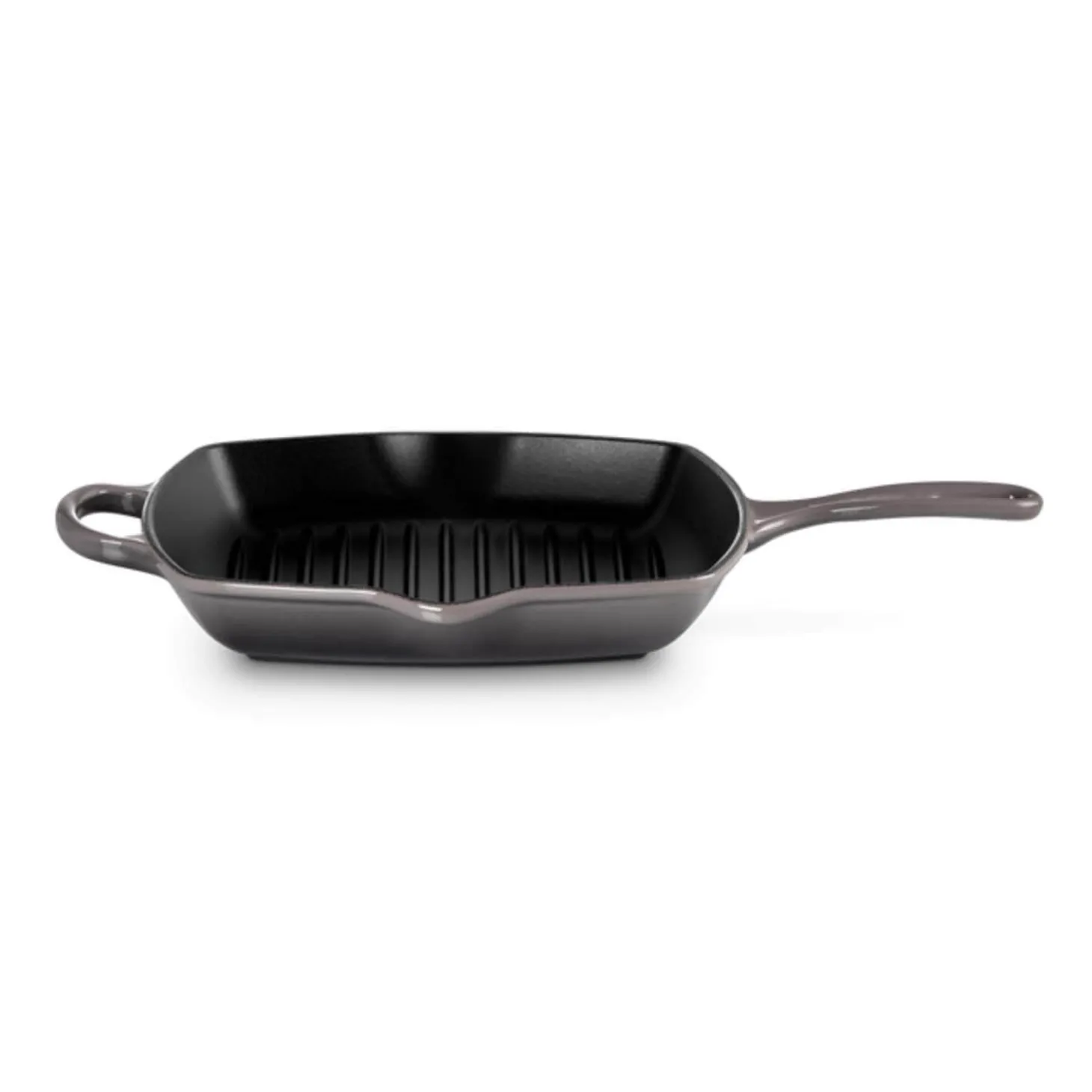 This Signature 26cm square cast iron grill pan in Grey by Le Creuset is ideal for grilling and searing a variety of ingredients such as chicken, steak, fish, vegetables and much more. The grill features a ridged cooking surface that allows excess fat and oil to drain away allowing for a healthier way of cooking and achieving those signature char lines. Created from cast iron the grill also has an enamelled coating which over time will achieve a natural patina and enhance flavour. Available in a Flint finish.