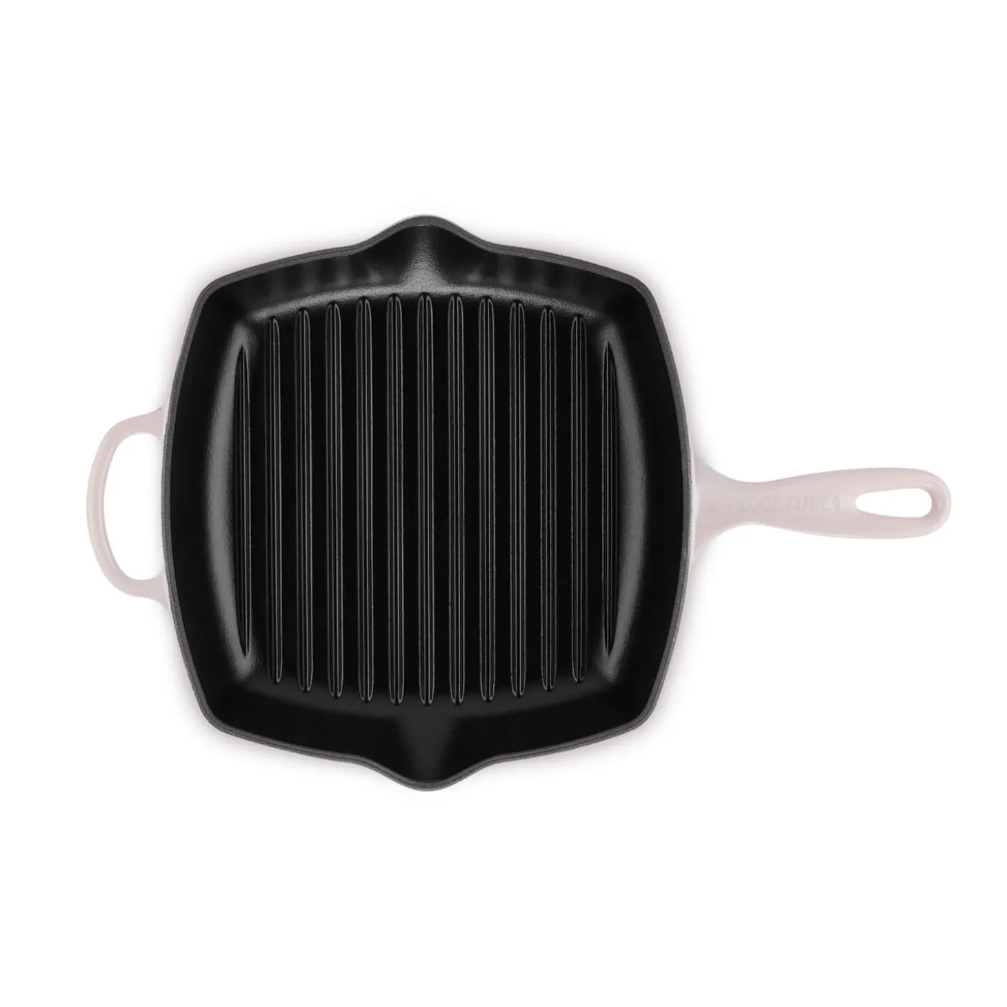 This Signature 26cm square cast iron grill pan in Shell Pink from Le Creuset is ideal for grilling and searing a variety of ingredients such as chicken, steak, fish, vegetables and much more. The grill features a ridged cooking surface that allows excess fat and oil to drain away allowing for a healthier way of cooking and achieving those signature char lines. Created from cast iron the grill also has an enamelled coating which over time will achieve a natural patina and enhance flavour.