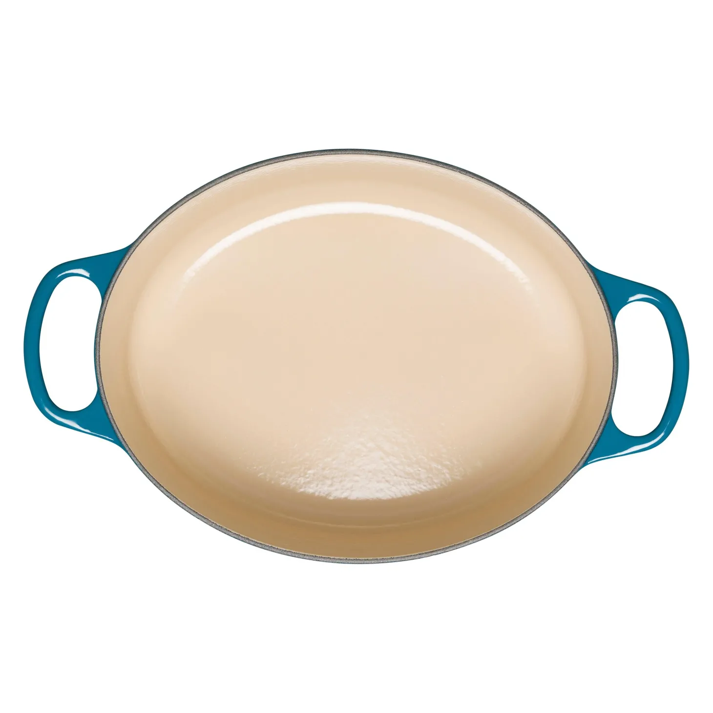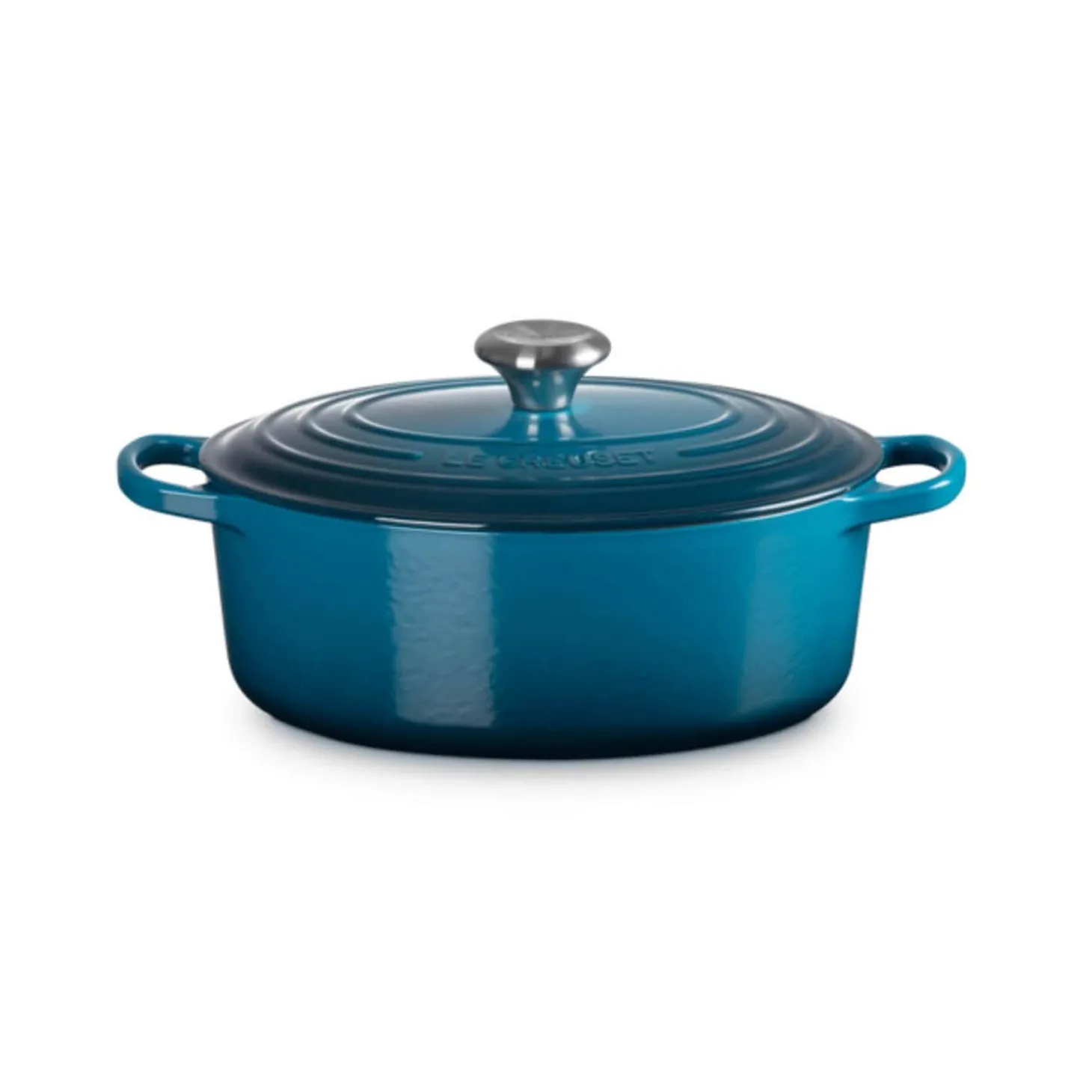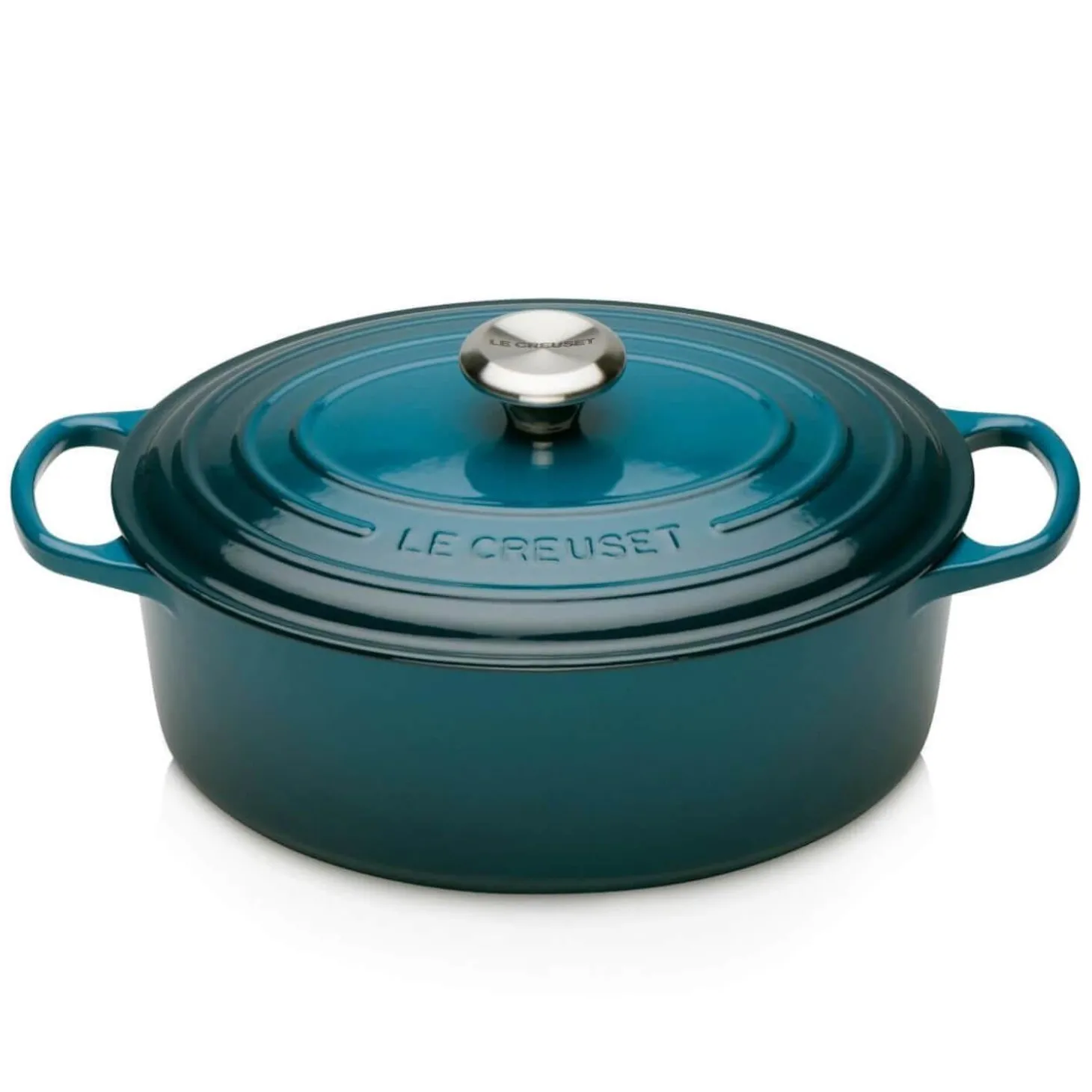 This on-trend Signature cast iron 27cm oval casserole in Deep Teal by Le Creuset forms part of the Signature collection. A versatile and timeless choice this dish can be applied to a variety of recipes including stews, roasts, bread making, soups and much more. Each cast iron piece has been handcrafted in France by skilled craftsmen with an expert enamel finish that is easy to clean and does not absorb stains or odours. These dishes can be used on all hob types including induction and feature an ergonomic stainless steel knob with the Le Creuset logo visible on the top. Other shapes, sizes and colours are also available.