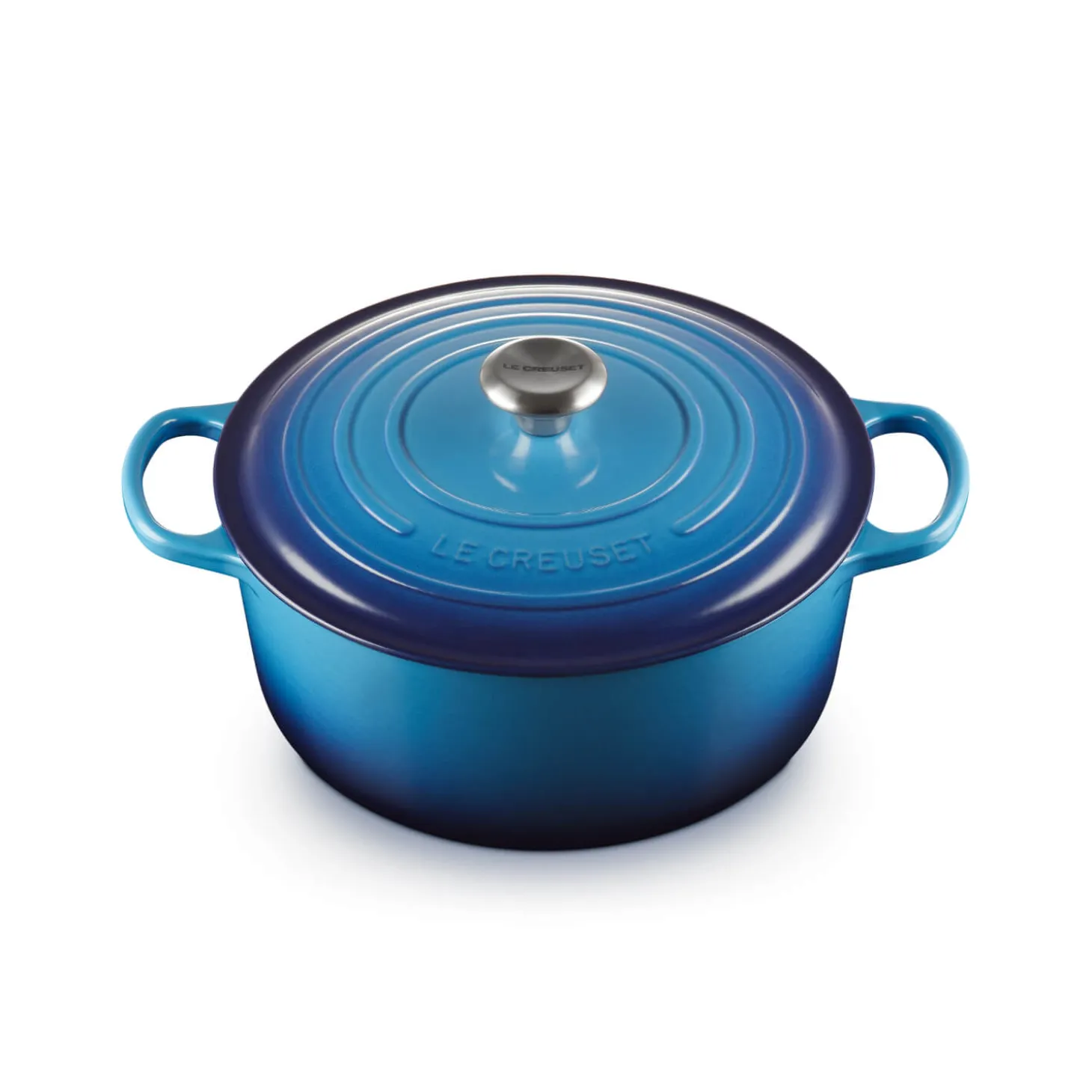 This on-trend Signature cast iron 28cm round casserole by Le Creuset forms part of their Azure colourway collection. A versatile and timeless choice this dish can be applied to a variety of recipes including stews, roasts, bread making, soups and much more. Each cast iron piece has been handcrafted in France by skilled craftsmen with an expert enamel finish that is easy to clean and does not absorb stains or odours. These dishes can be used on all hob types including induction and feature an ergonomic stainless steel knob with the Le Creuset logo visible on the top. Other shapes, sizes and colours are also available.