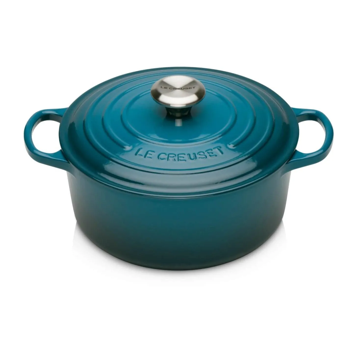 This on-trend Signature cast iron 28cm round casserole by Le Creuset forms part of their Deep Teal colourway collection. A versatile and timeless choice this dish can be applied to a variety of recipes including stews, roasts, bread making, soups and much more. Each cast iron piece has been handcrafted in France by skilled craftsmen with an expert enamel finish that is easy to clean and does not absorb stains or odours. These dishes can be used on all hob types including induction and feature an ergonomic stainless steel knob with the Le Creuset logo visible on the top. Other shapes, sizes and colours are also available.