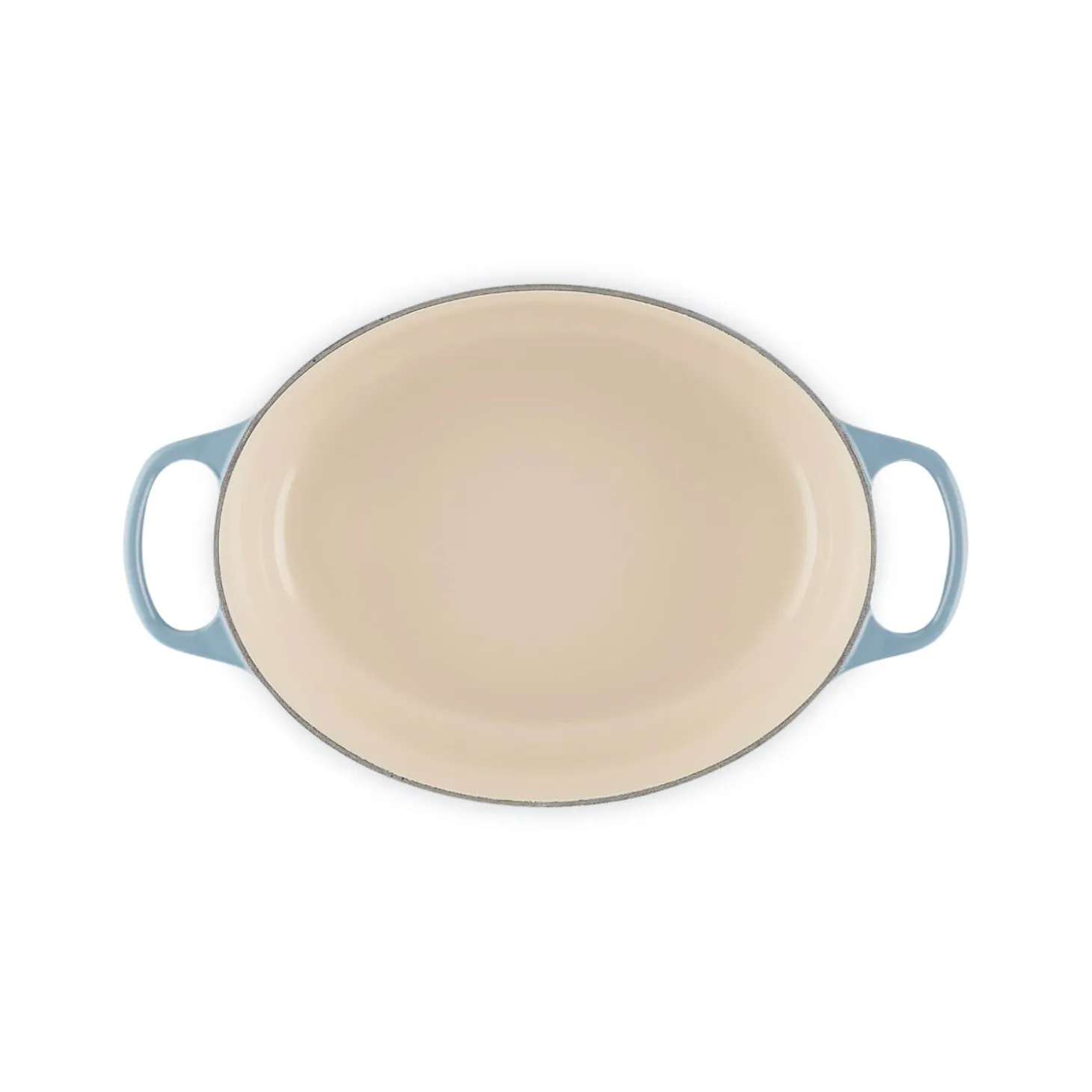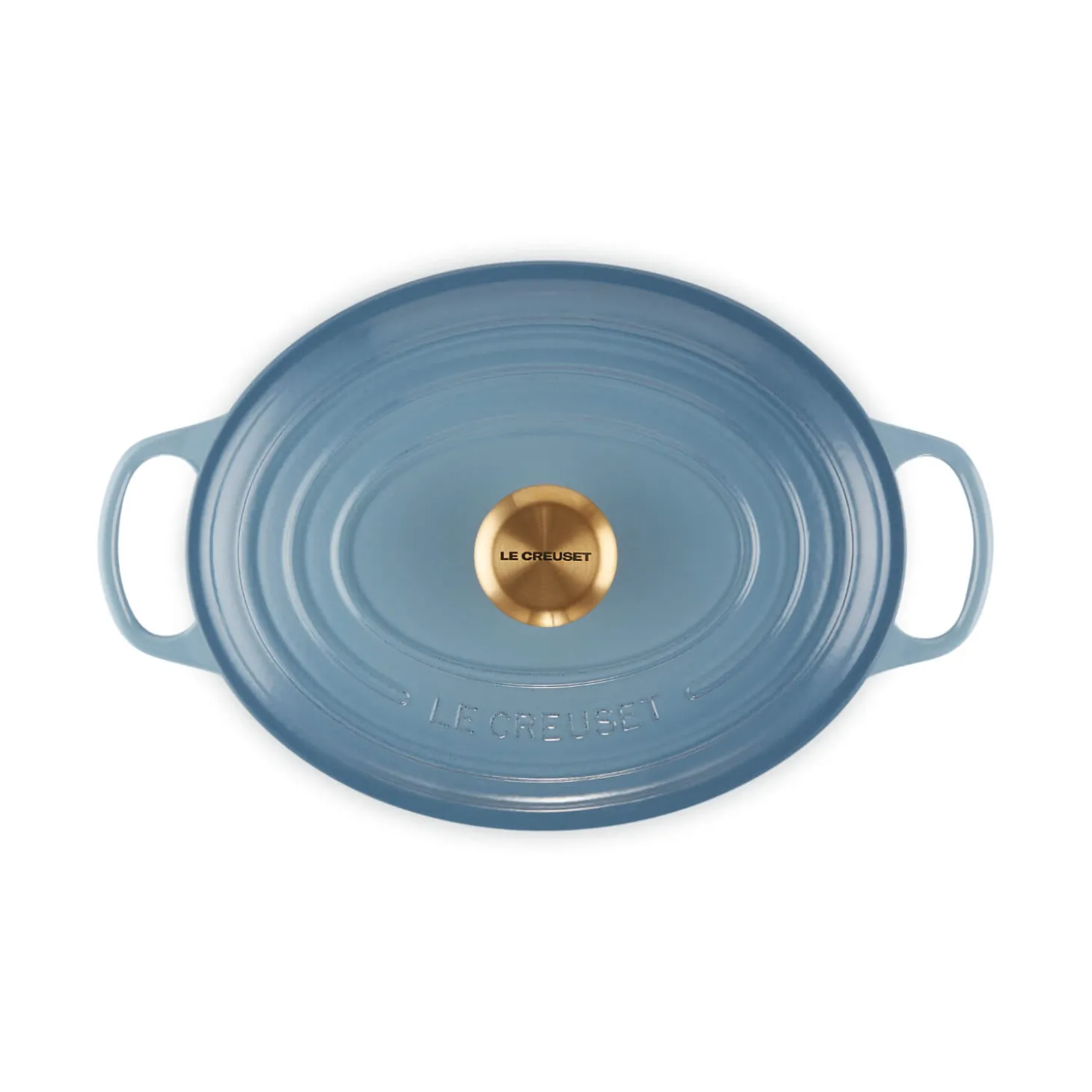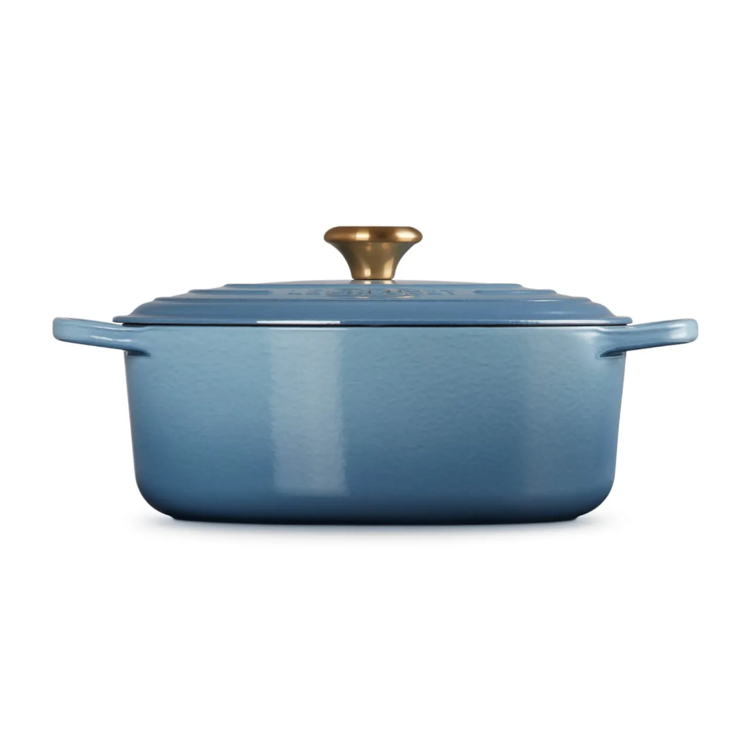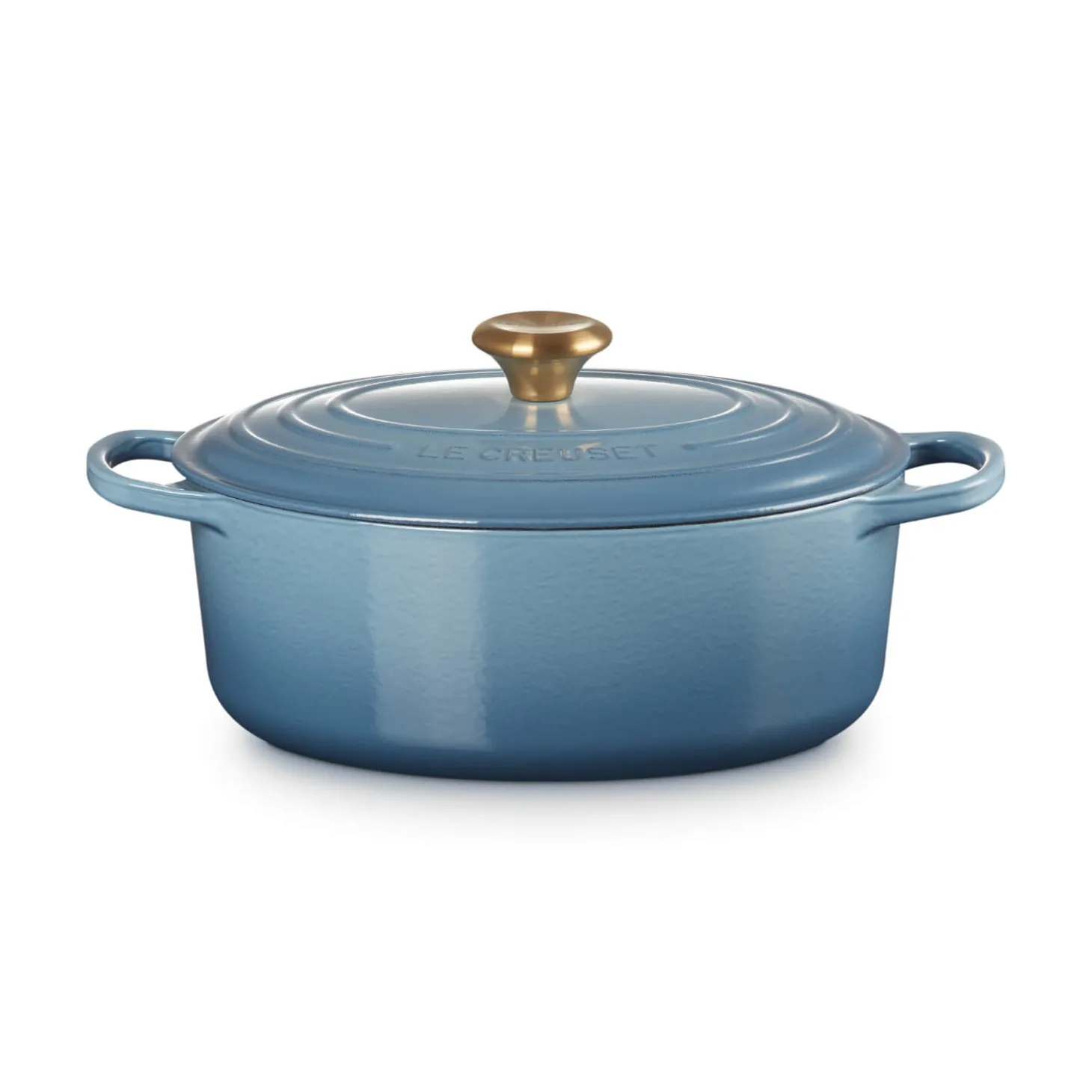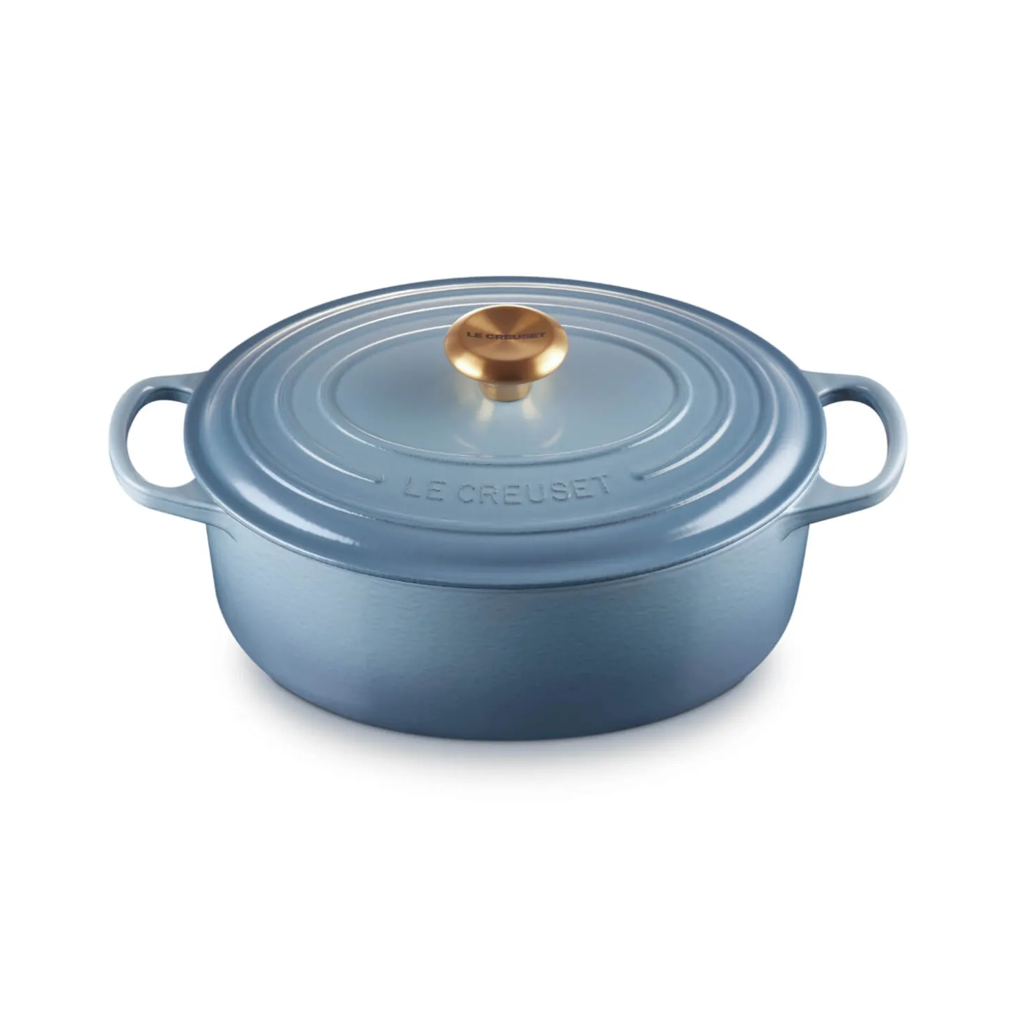 This on-trend Signature cast iron 29cm oval casserole by Le Creuset forms part of their Chambray colourway collection, a stunning colour, indulge in the serene ambience of Chambray Blue creating a calming and soothing atmosphere, perfect for a relaxing cooking and dining experience. A versatile and timeless choice this dish can be applied to a variety of recipes including stews, roasts, bread making, soups and much more. Each cast iron piece has been handcrafted in France by skilled craftsmen with an expert enamel finish that is easy to clean and does not absorb stains or odours. These dishes can be used on all hob types including induction and feature an ergonomic stainless steel gold knob with the Le Creuset logo visible on the top. Other shapes, sizes and colours are also available.