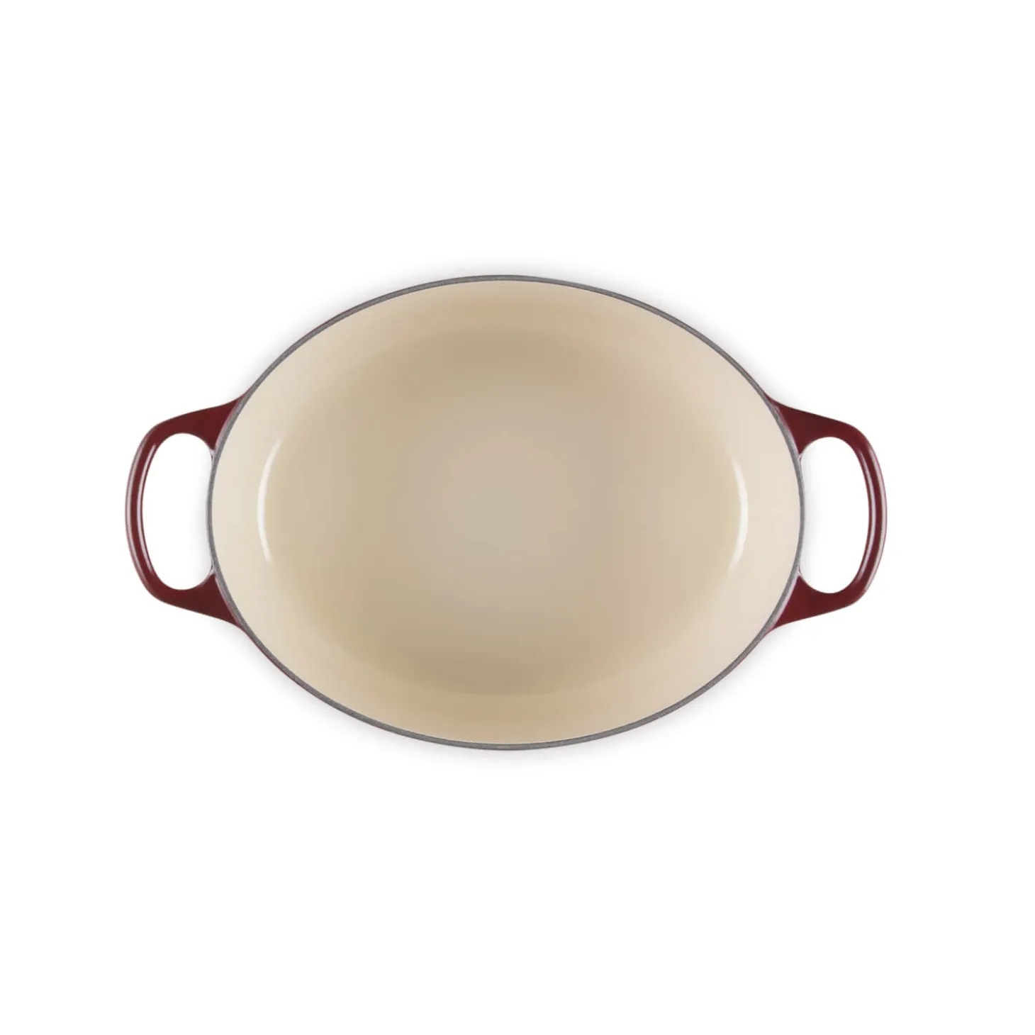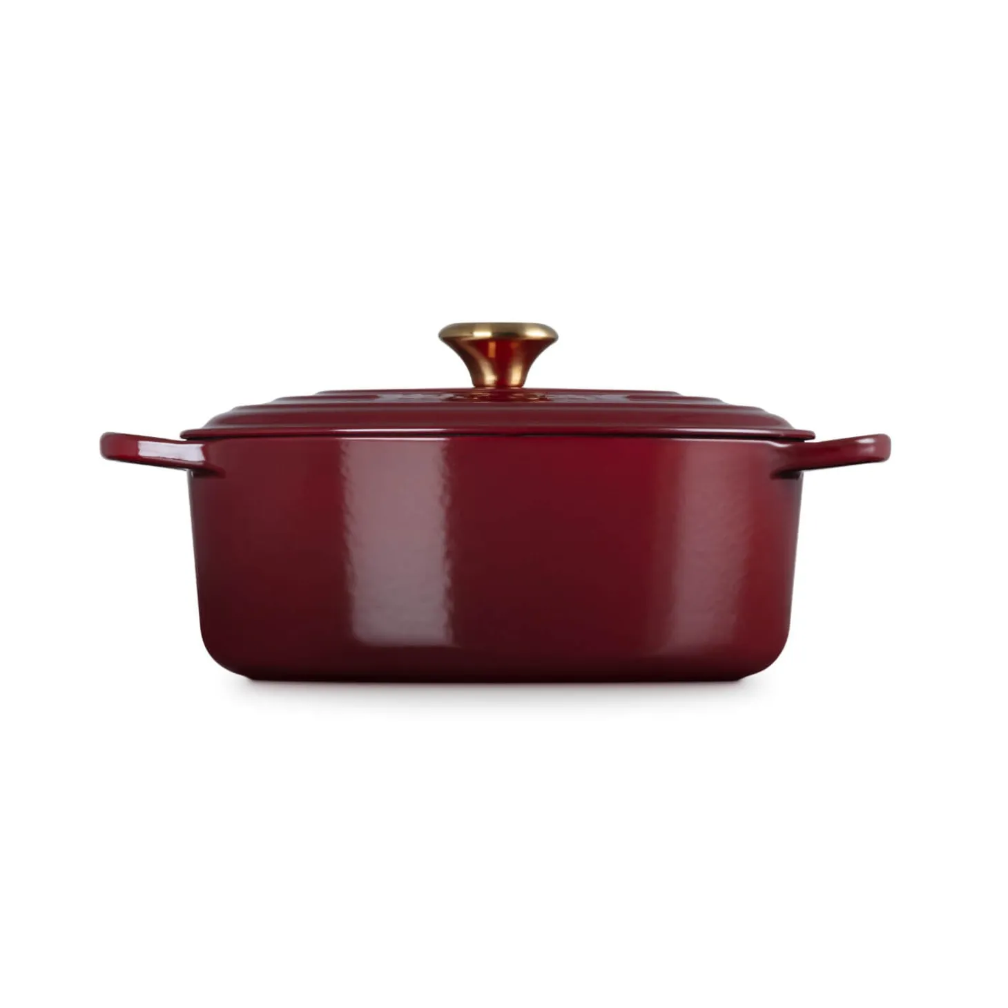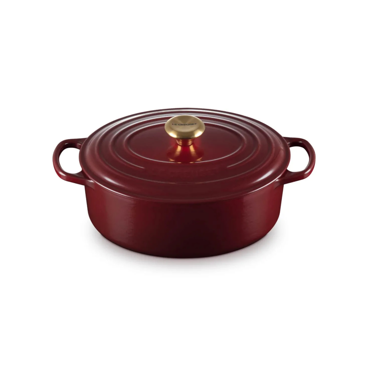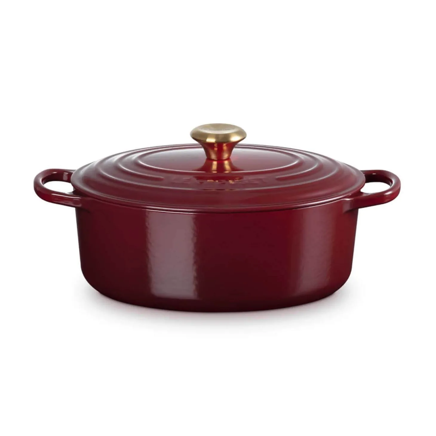 This on-trend Signature cast iron 29cm oval casserole by Le Creuset forms part of their Garnet colourway collection, a stunning colour, indulge in the stunning and luxurious shade of deep red jewels and experience a sense of sophistication and elegance like never before. A versatile and timeless choice this dish can be applied to a variety of recipes including stews, roasts, bread making, soups and much more. Each cast iron piece has been handcrafted in France by skilled craftsmen with an expert enamel finish that is easy to clean and does not absorb stains or odours. These dishes can be used on all hob types including induction and feature an ergonomic stainless steel gold knob with the Le Creuset logo visible on the top. Other shapes, sizes and colours are also available.