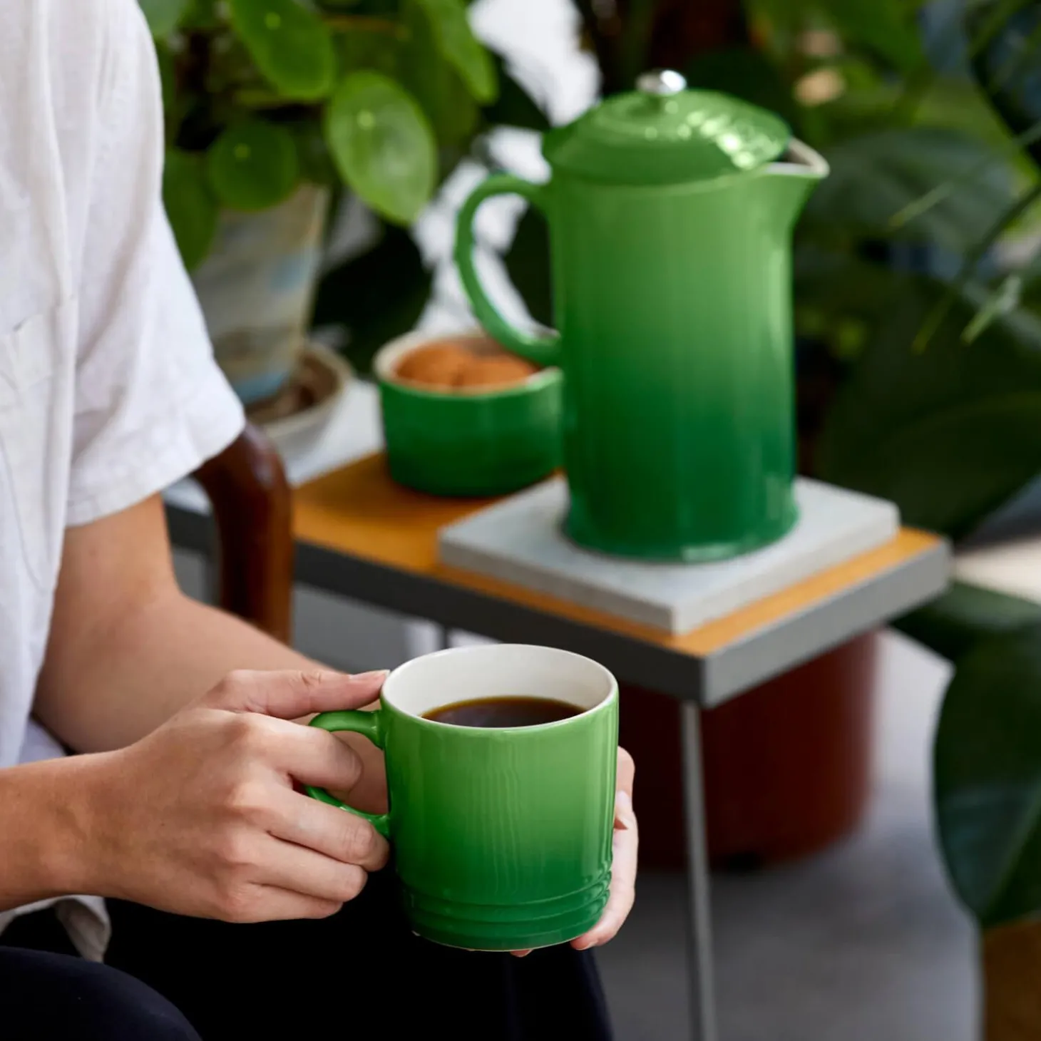 Enjoy your favourite hot beverages with the Le Creuset Mug in Bamboo Green. Created using high-quality stoneware that retains heat thus keeping drinks warm for longer. This versatile item can be used for single servings of soup and even desserts. On the exterior, there are the 3 iconic rings with an embossed logo that is instantly recognisable. Each mug in the series has a superior enamel coating that resists scratches, stains and odours.