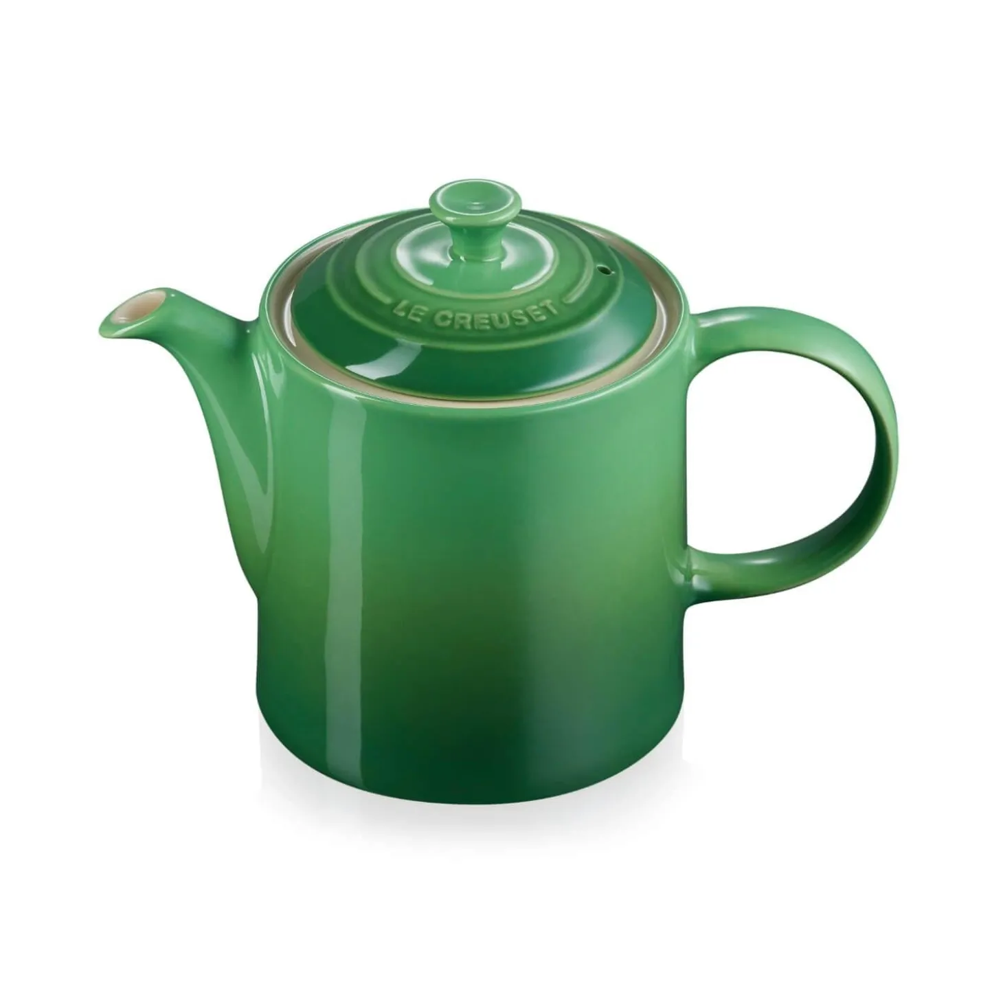 Perfect for enjoying cups of tea this 4 cup teapot in Bamboo (green) forms part of the Grand Teapot collection by Le Creuset. Each teapot has been created using high-quality clays that are fired at high temperatures providing excellent thermal resistance and strength. The lid of the pot has an iconic three-ring design with an embossed logo plus a steam hole, locking lid and an anti-drip spout to avoid spillages.