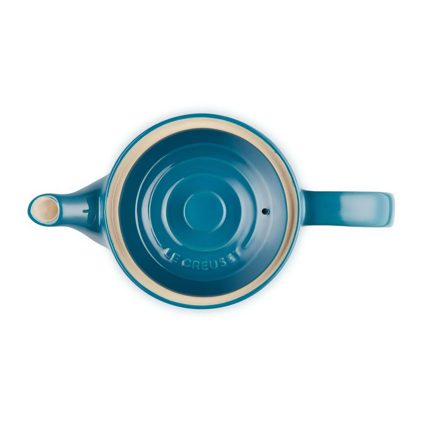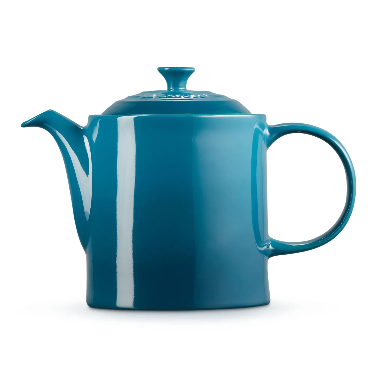 Perfect for enjoying cups of tea this 4 cup teapot in Deep Teal forms part of the Grand Teapot collection by Le Creuset. Each teapot has been created using high-quality clays that are fired at high temperatures providing excellent thermal resistance and strength. The lid of the pot has an iconic three-ring design with an embossed logo plus a steam hole, locking lid and an anti-drip spout to avoid spillages.