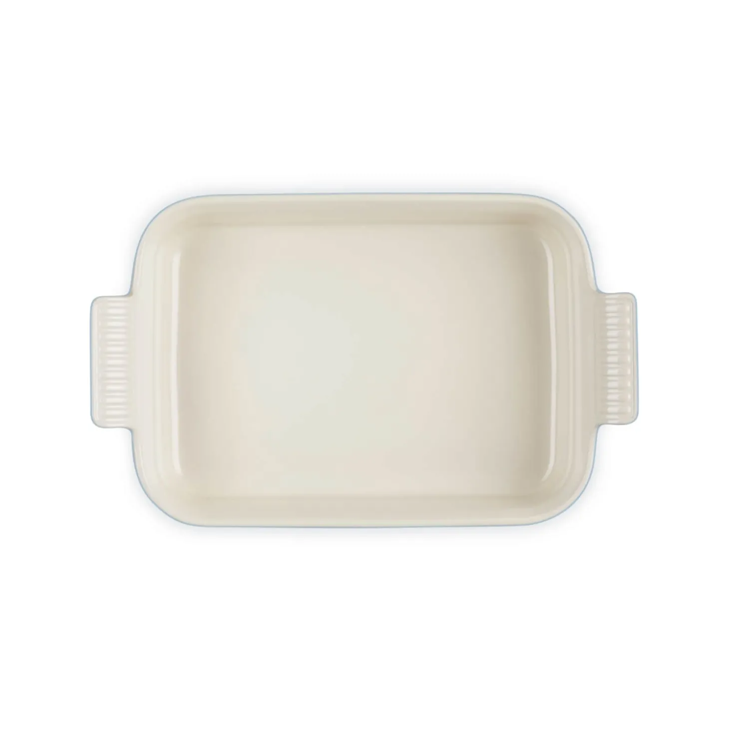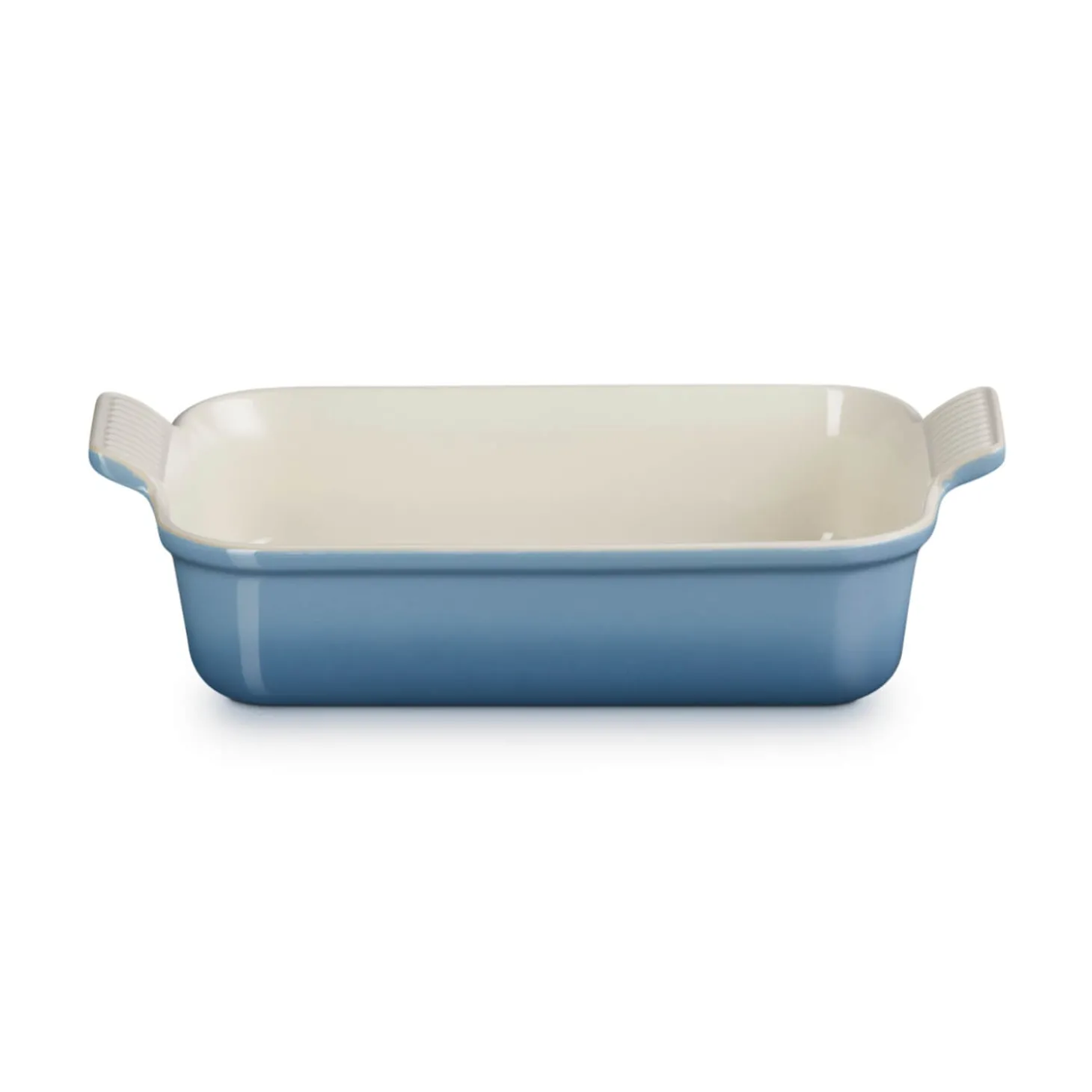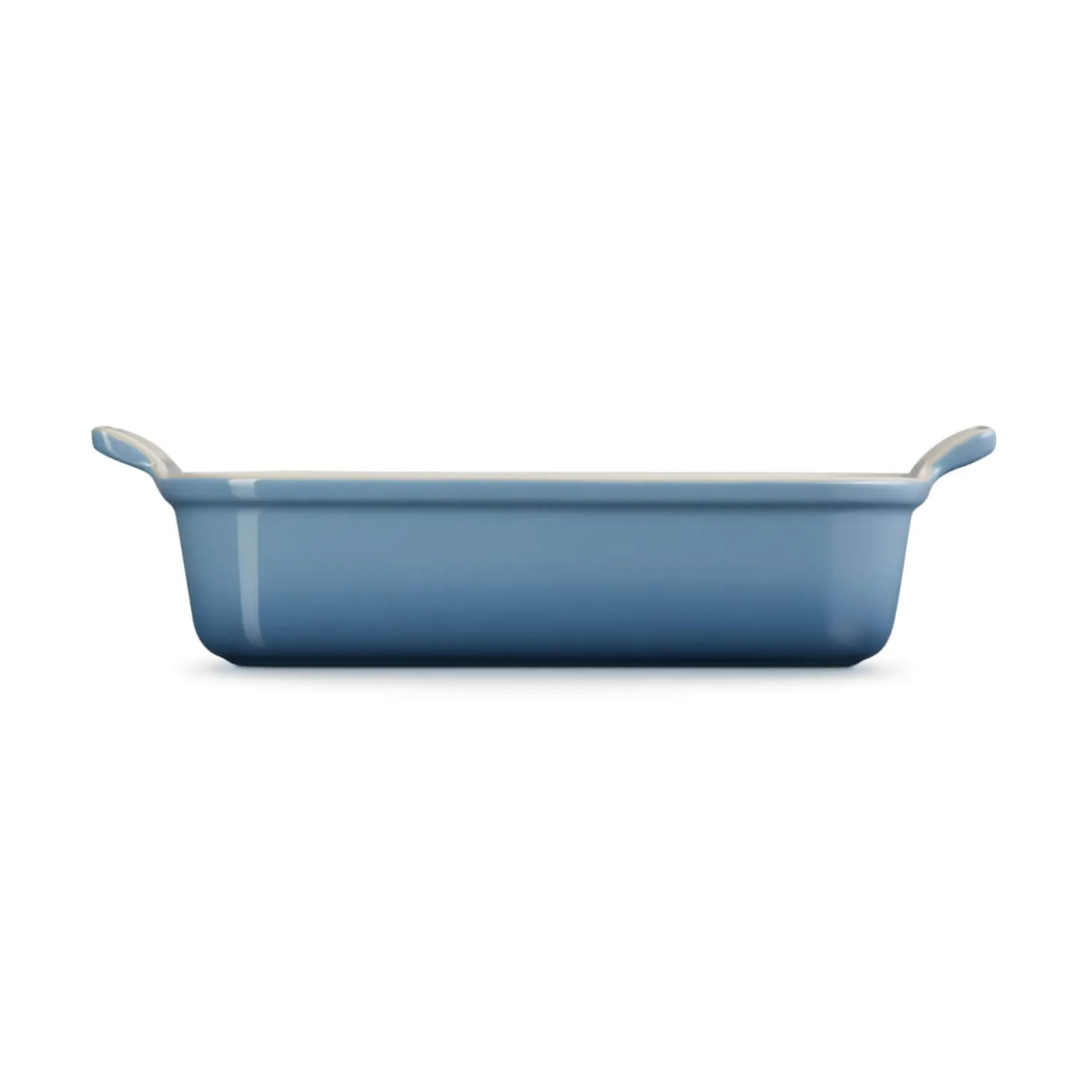 Le Creuset presents the Stoneware Heritage 26cm rectangular deep oven dish in Chambray. Indulge in the serene ambience of Chambray Blue creating a calming and soothing atmosphere, perfect for a relaxing cooking and dining experience. A stylish and versatile kitchen edition ideal for everyday cooking. Created from specialist clays and fired at high temperatures to ensure unmatched quality and durability. Each dish in the Heritage collection has easy grip scalloped handles, deep walls and an easy to clean scratch-resistant enamel coating.