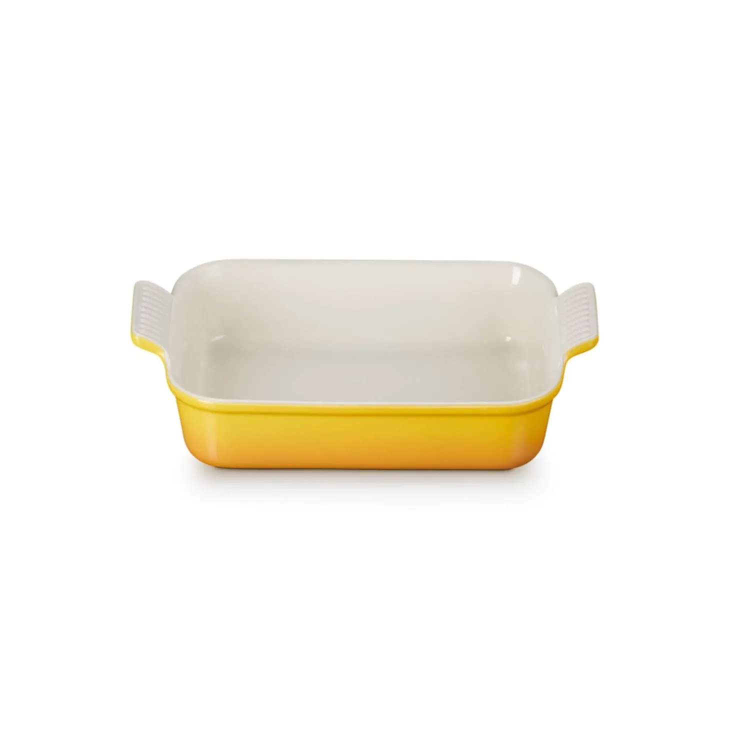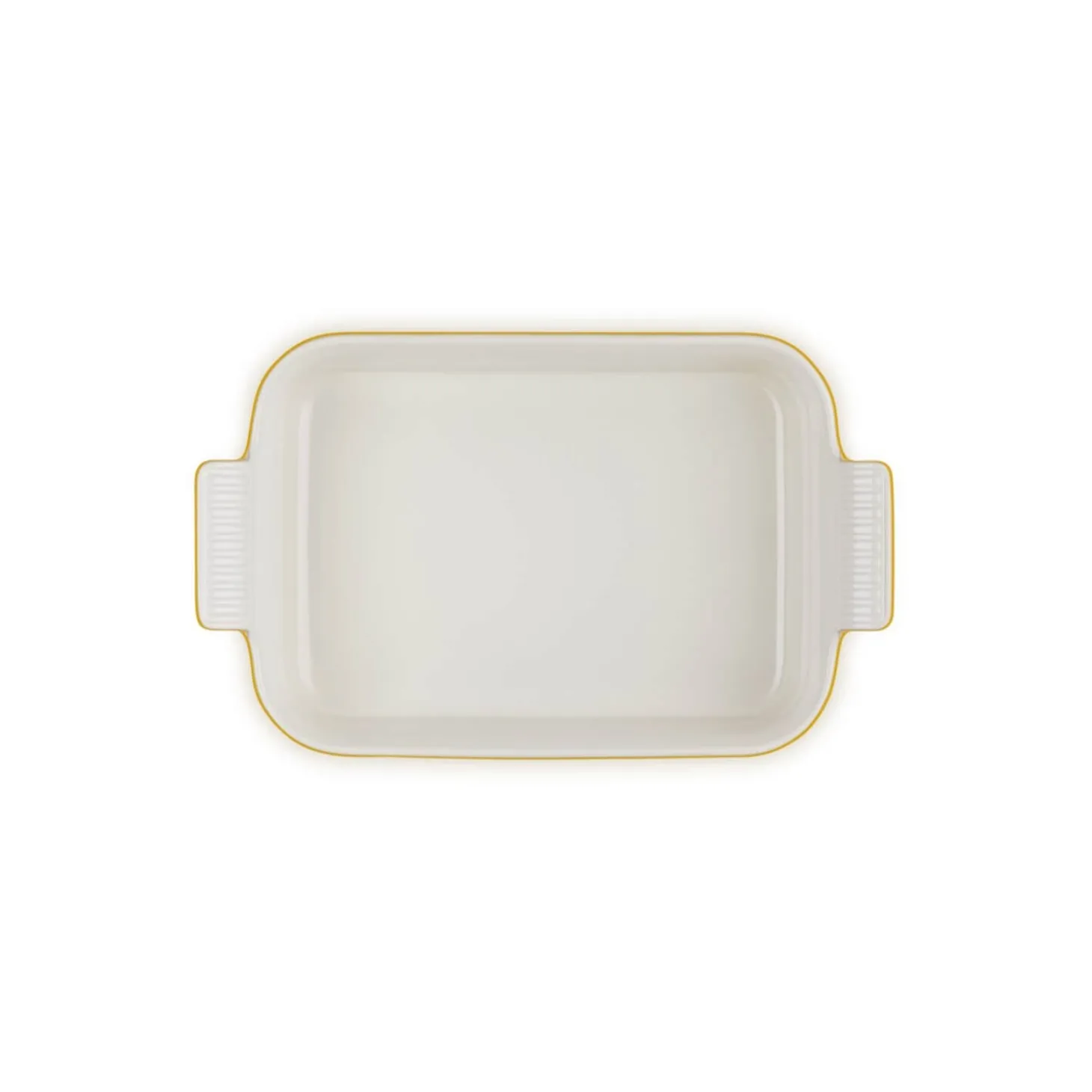 The Stoneware Heritage Medium rectangular deep oven dish by Le Creuset in Nectar is a stunning colour that Le Creuset describe as ‘a ray of sunshine swirled with honey and a hint of caramel’ is a stylish and versatile kitchen edition ideal for everyday cooking. Created from specialist clays and fired at high temperatures to ensure unmatched quality and durability. Each dish in the Heritage collection has easy grip scalloped handles, deep walls and an easy to clean scratch-resistant enamel coating.