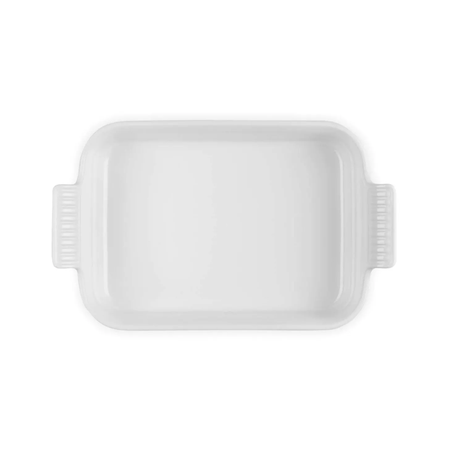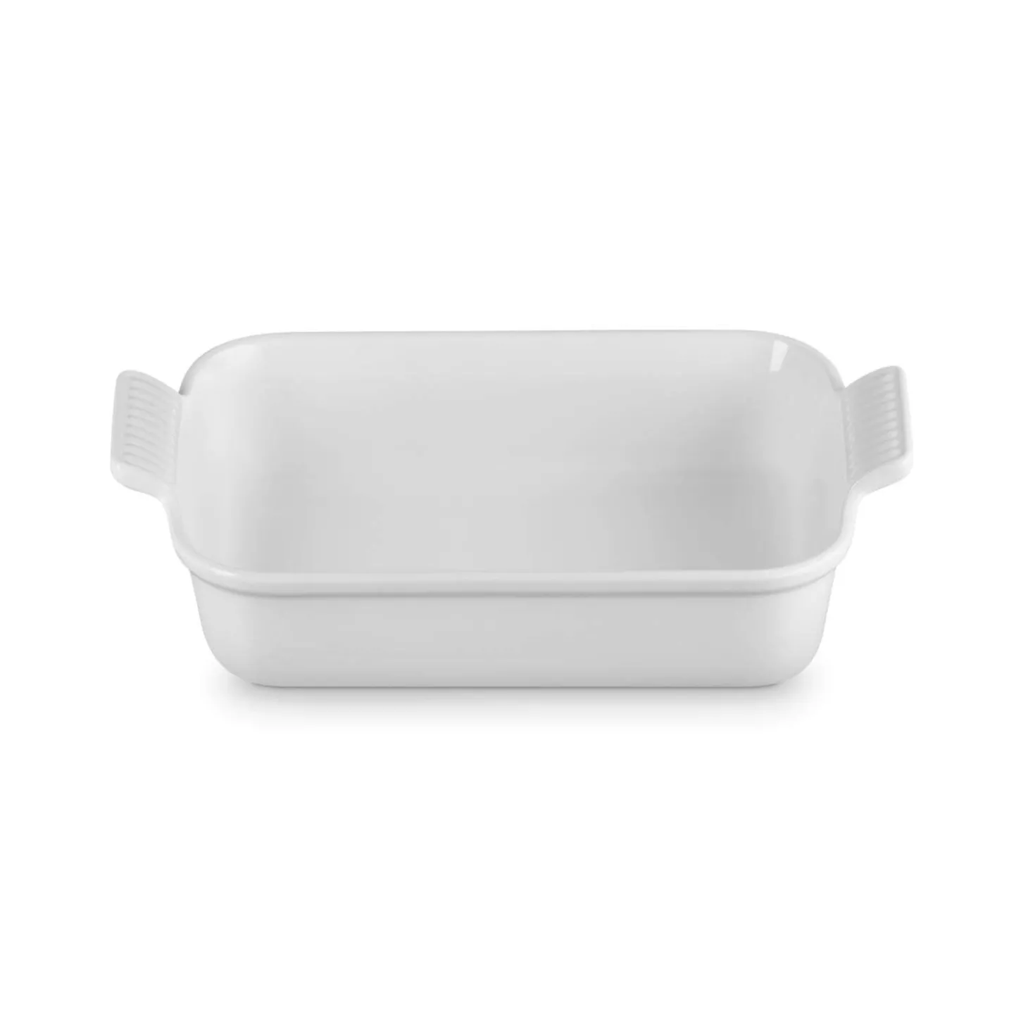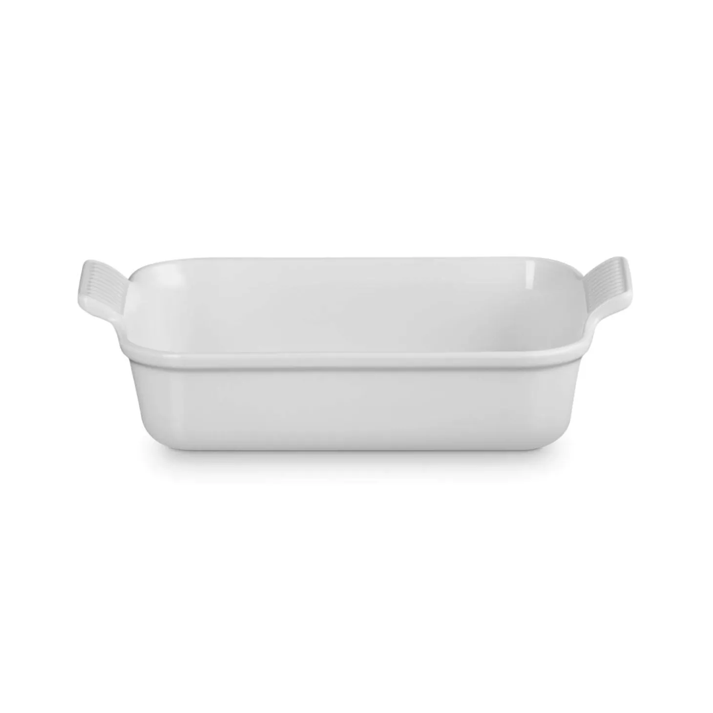 Le Creuset presents the Stoneware Heritage 26cm rectangular deep oven dish in White, to bring a crisp freshness to your kitchen and table. A stylish and versatile kitchen edition ideal for everyday cooking. Created from specialist clays and fired at high temperatures to ensure unmatched quality and durability. Each dish in the Heritage collection has easy grip scalloped handles, deep walls and an easy to clean scratch-resistant enamel coating.