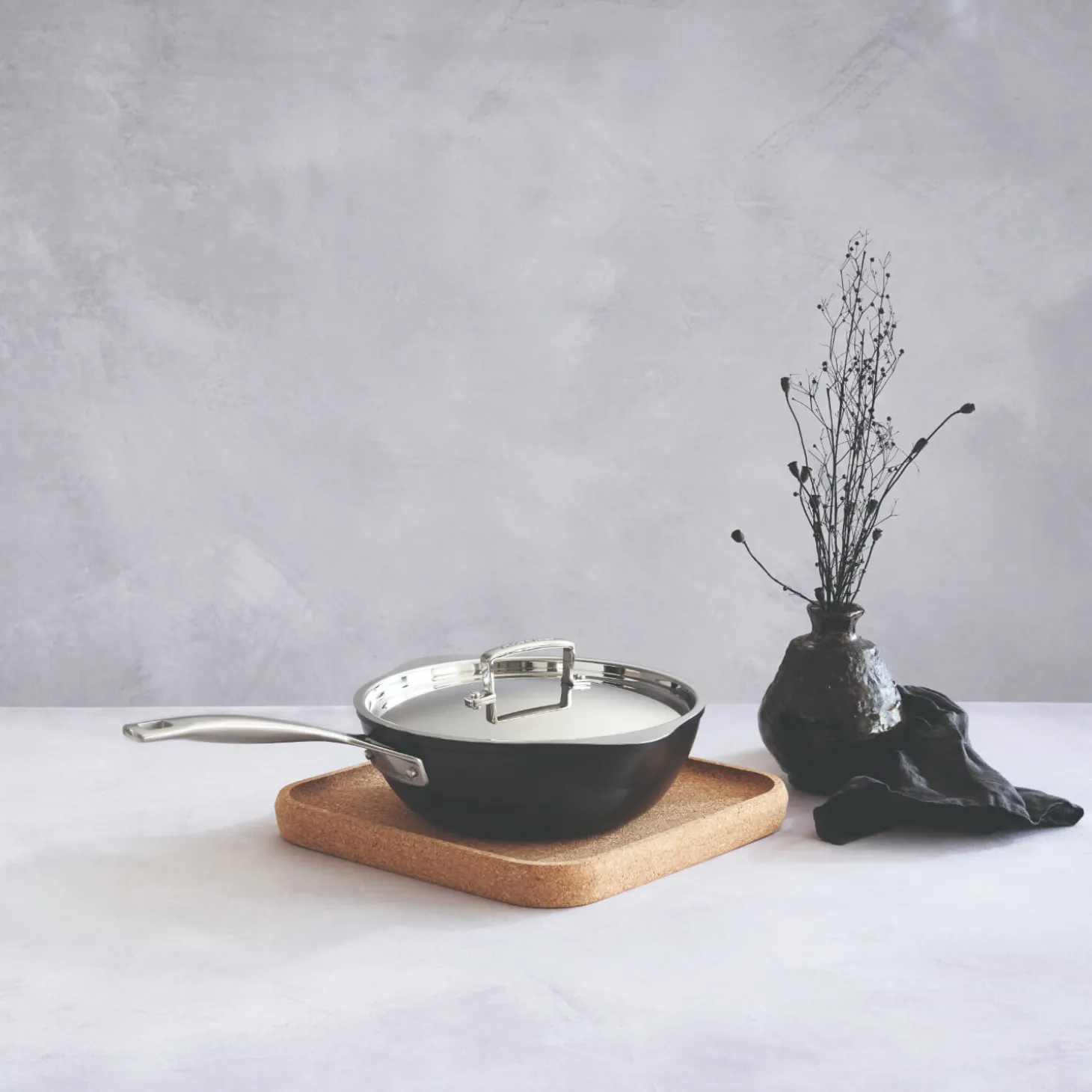 Le Creuset presents the Chefs Pan with Pouring spouts made from hard anodised forged aluminium, which makes this pan their best non-stick as it is now 4x stronger with its construction being hard anodised to create efficient heat conduction and distribution for even cooking. This chefs pan is suitable for all hobs including induction, PFOA-free non-stick surface can handle all types of frying – even without oil or fat. The spouts enable you to efficiently pour away any unwanted liquids, the sides are high to help prevent any spilling or mess as you cook, the lid is shaped to cover the spouts to ensure the contents of the pan do not lose any moisture. A great chefs pan for all cooks kitchens.