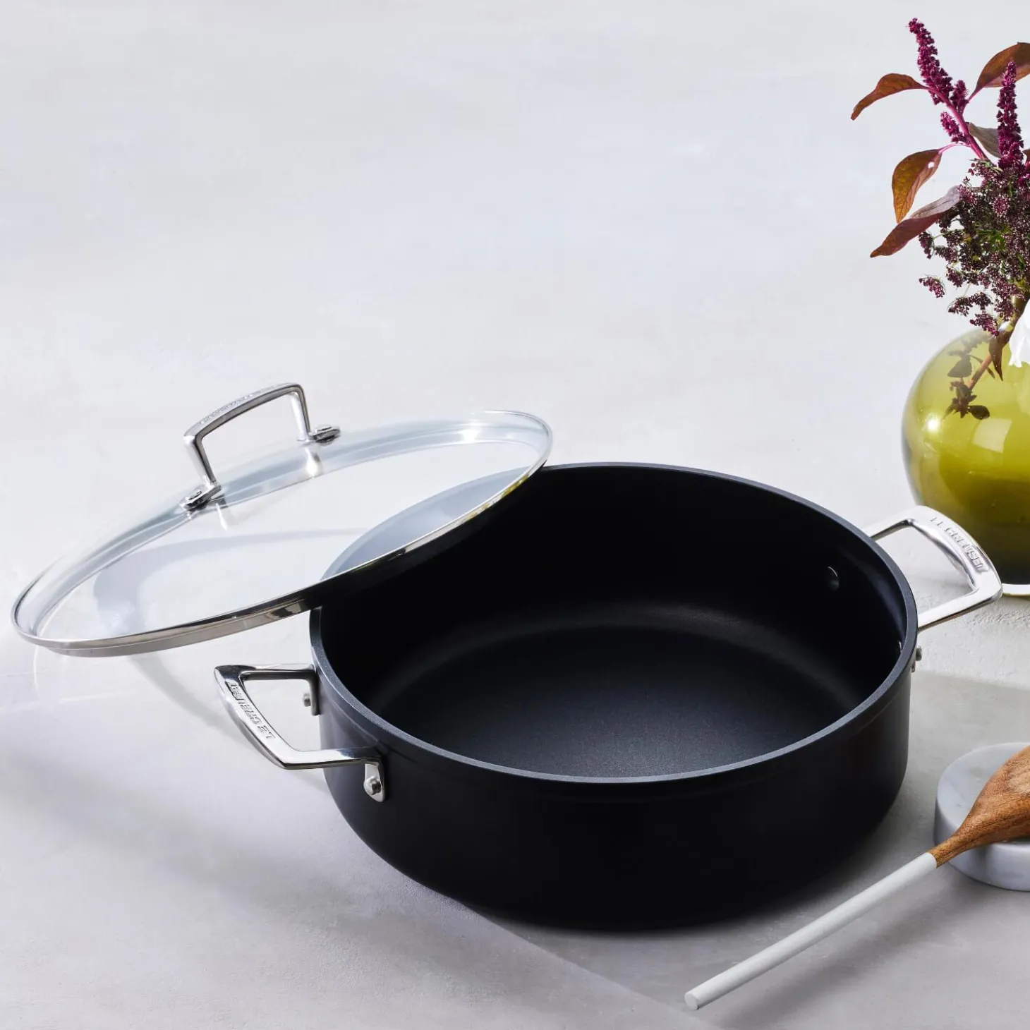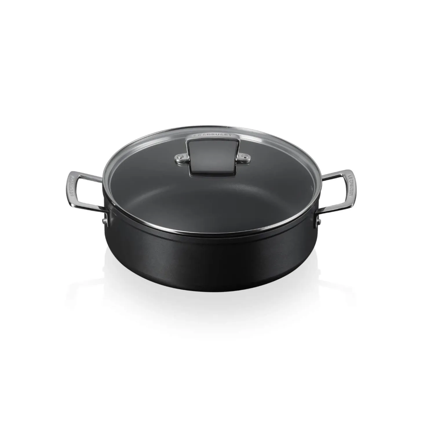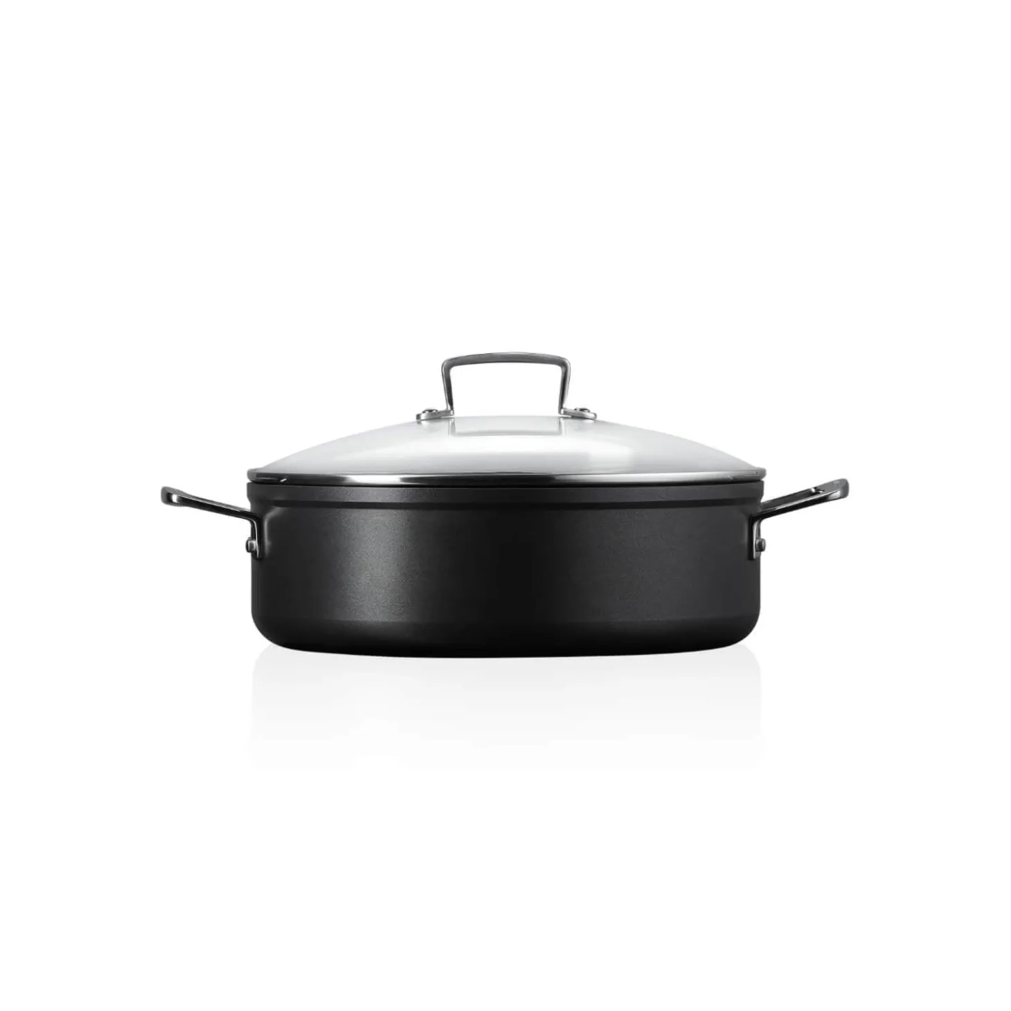 Perfect for a multitude of cooking tasks this versatile 28cm saute pan by Le Creuset forms parts of their improved Toughened Non-Stick range which now feature 4x* as much strength as the previous edition thanks to a 3-layer PFOA free coating. This saute pan also provides excellent heat distribution due to being created using hard anodised aluminium making this saute pan compatible across all hob types including induction. The stainless steel helper handles allow for comfort and easy use with guaranteed stability.