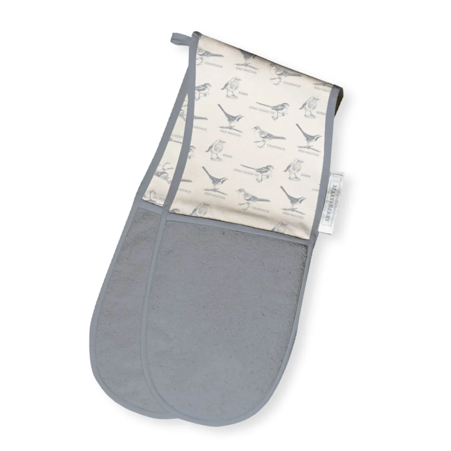Mary Berry presents their range of English Garden double oven gloves which include this set with a bird print. Created with the purpose of keeping hands and fingers safe whilst removing dishes from the oven. Made from 100% cotton, the English Garden collection features beautiful, simple designs which are subtle but still a staple piece for any house. The additional hanging loop is ideal to keep the countertop neat and tidy in between uses.Â