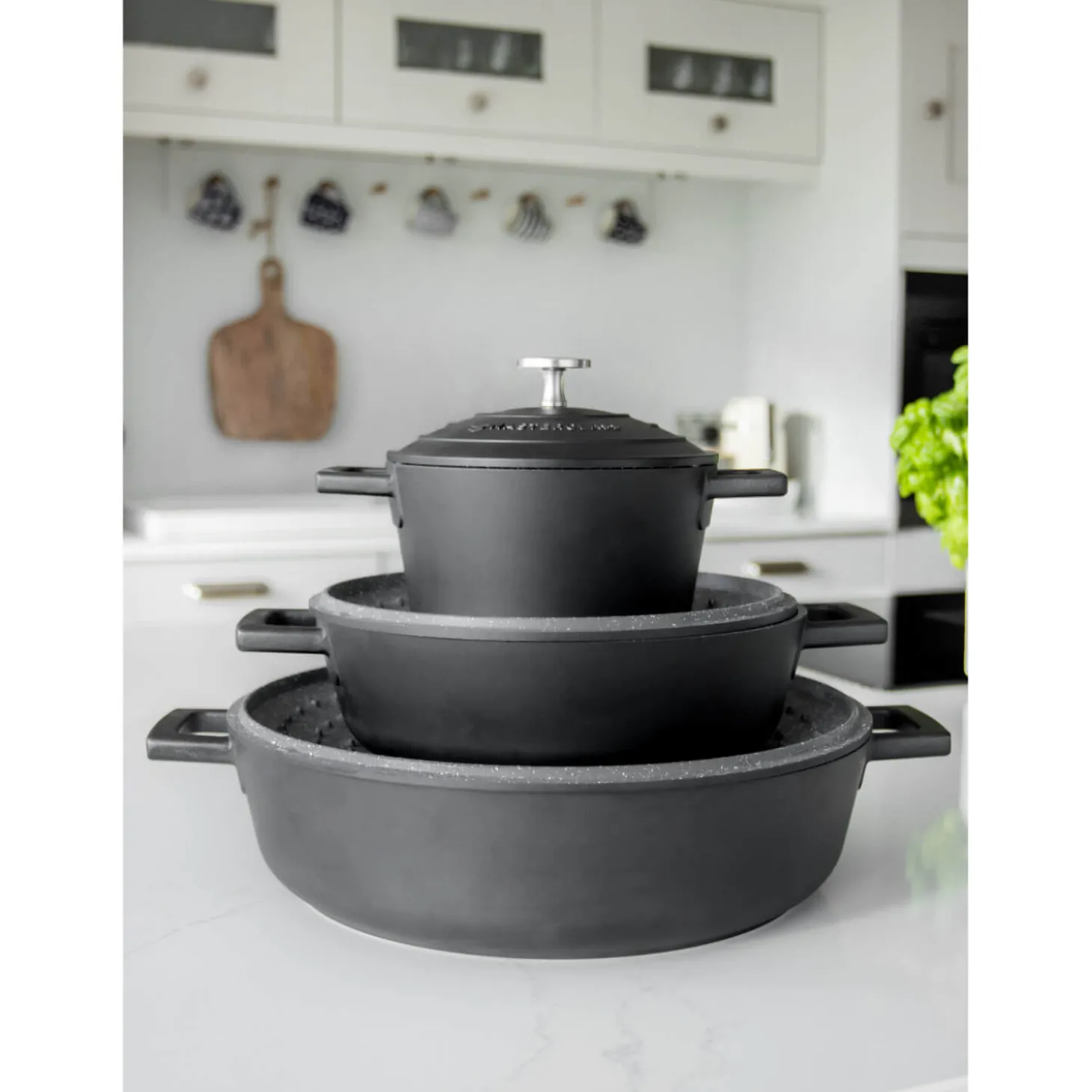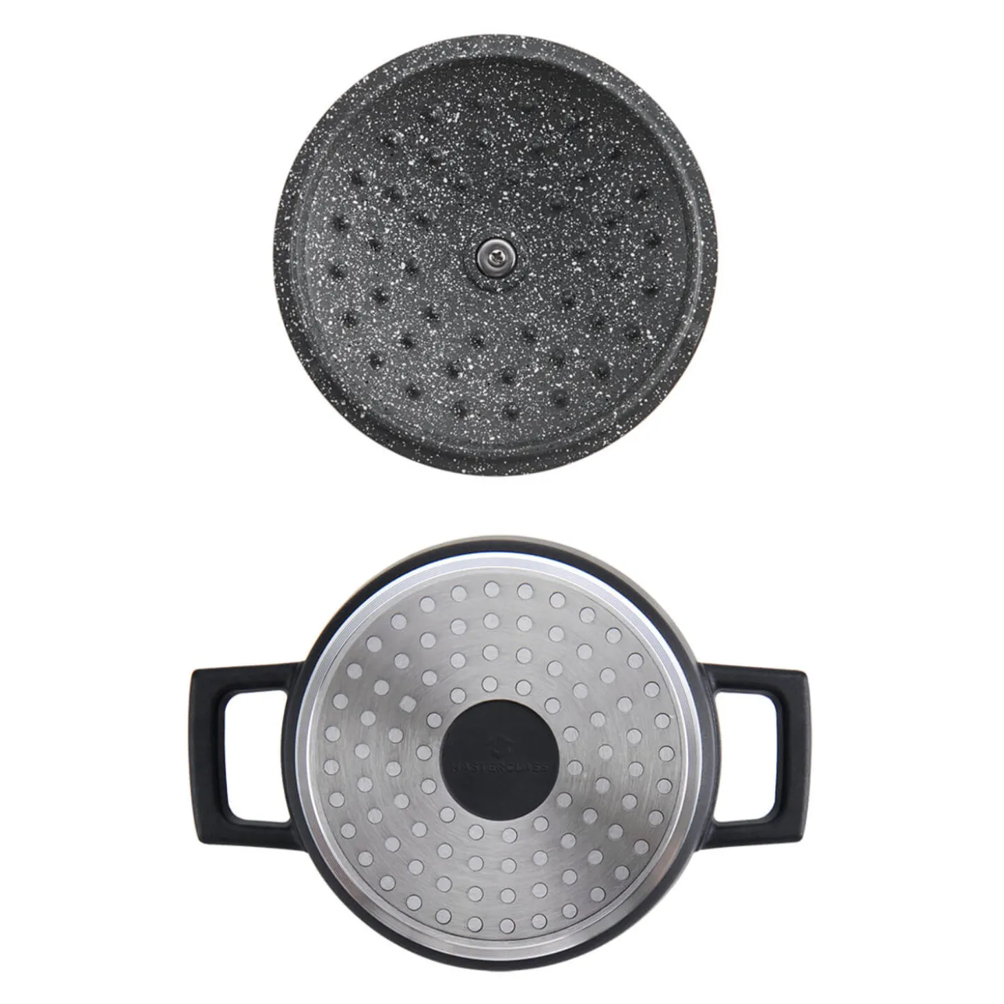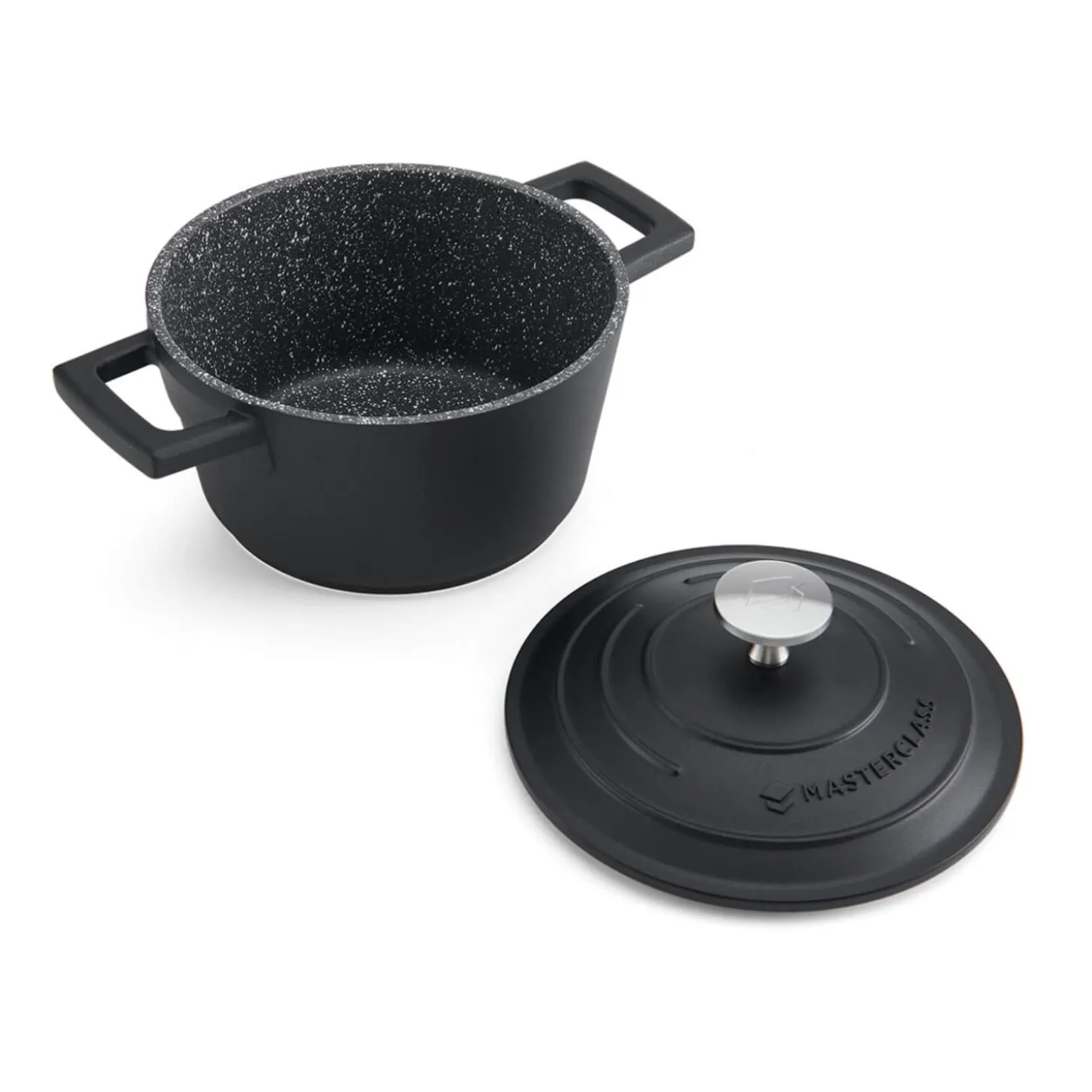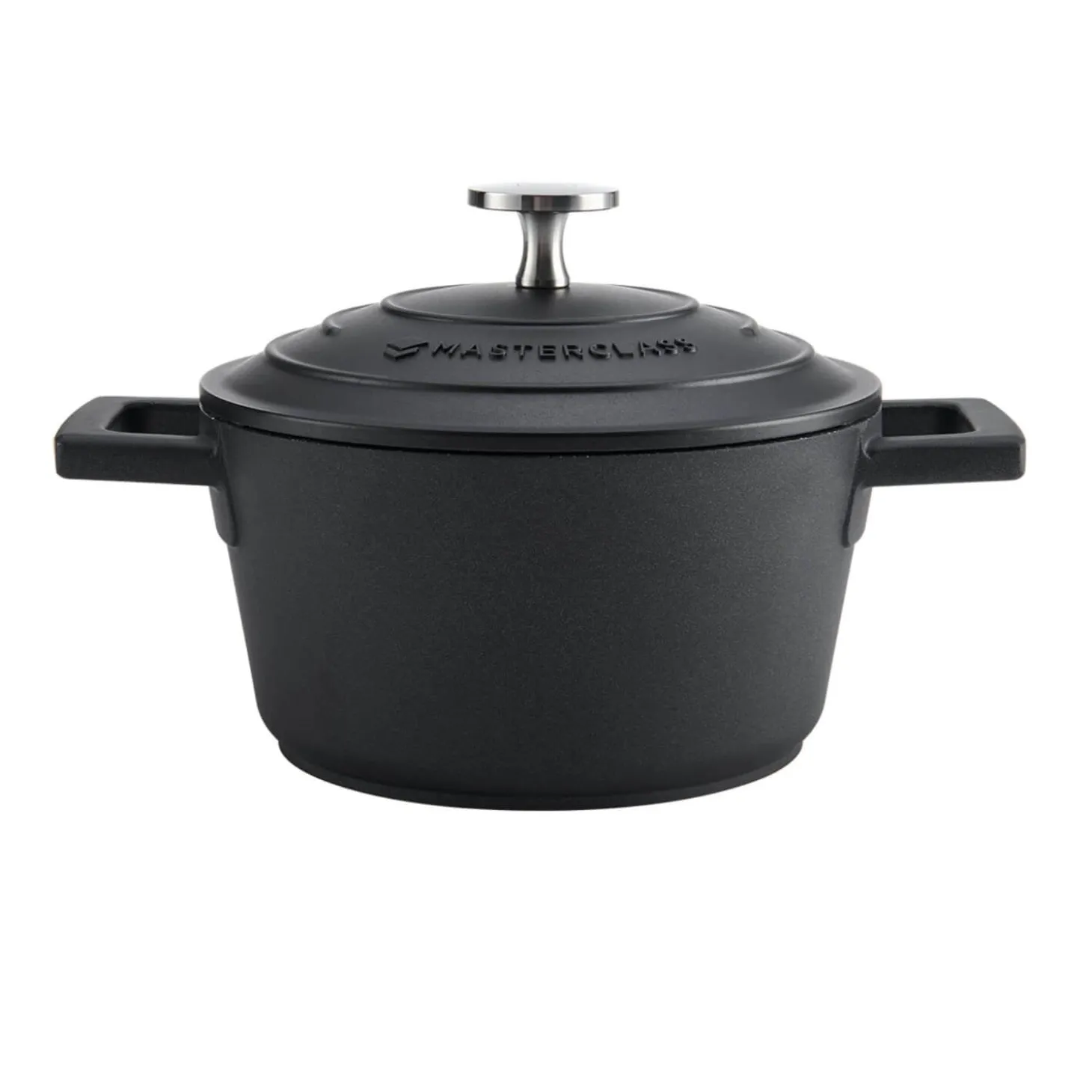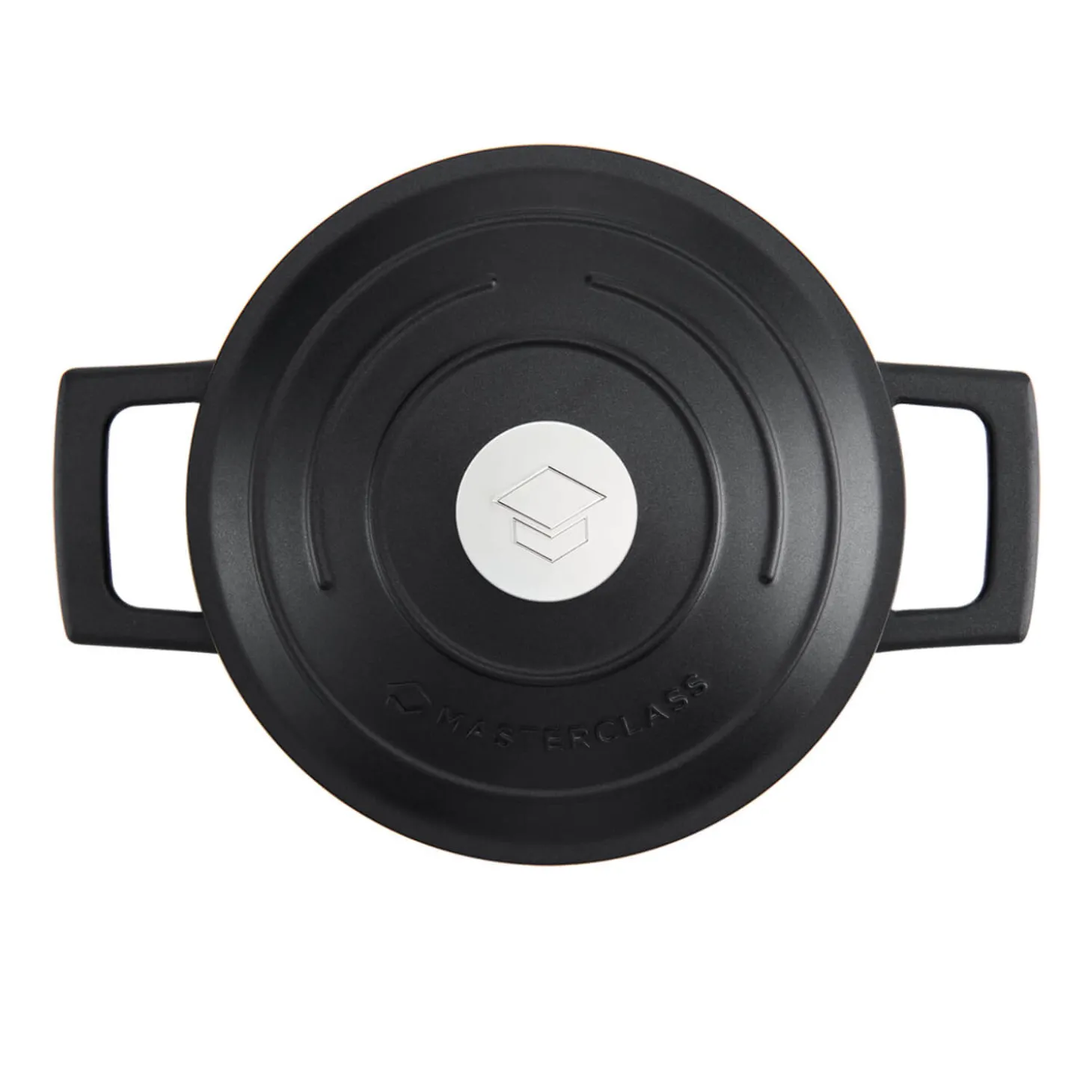 Masterclass presents the 16cm Cast Aluminium Round Casserole Dish in Black from their Lightweight range. Designed to be much lighter than traditional cast iron while maintaining exceptional strength, this dish is perfect for oven or hob cooking, including induction, ensuring fast and even heat distribution. The self-basting lid locks in moisture for rich, flavourful meals, while the durable, reinforced non-stick coating allows effortless food release. An essential casserole for any type and style of kitchen.Â