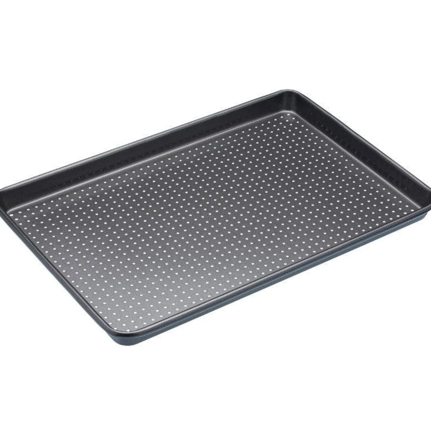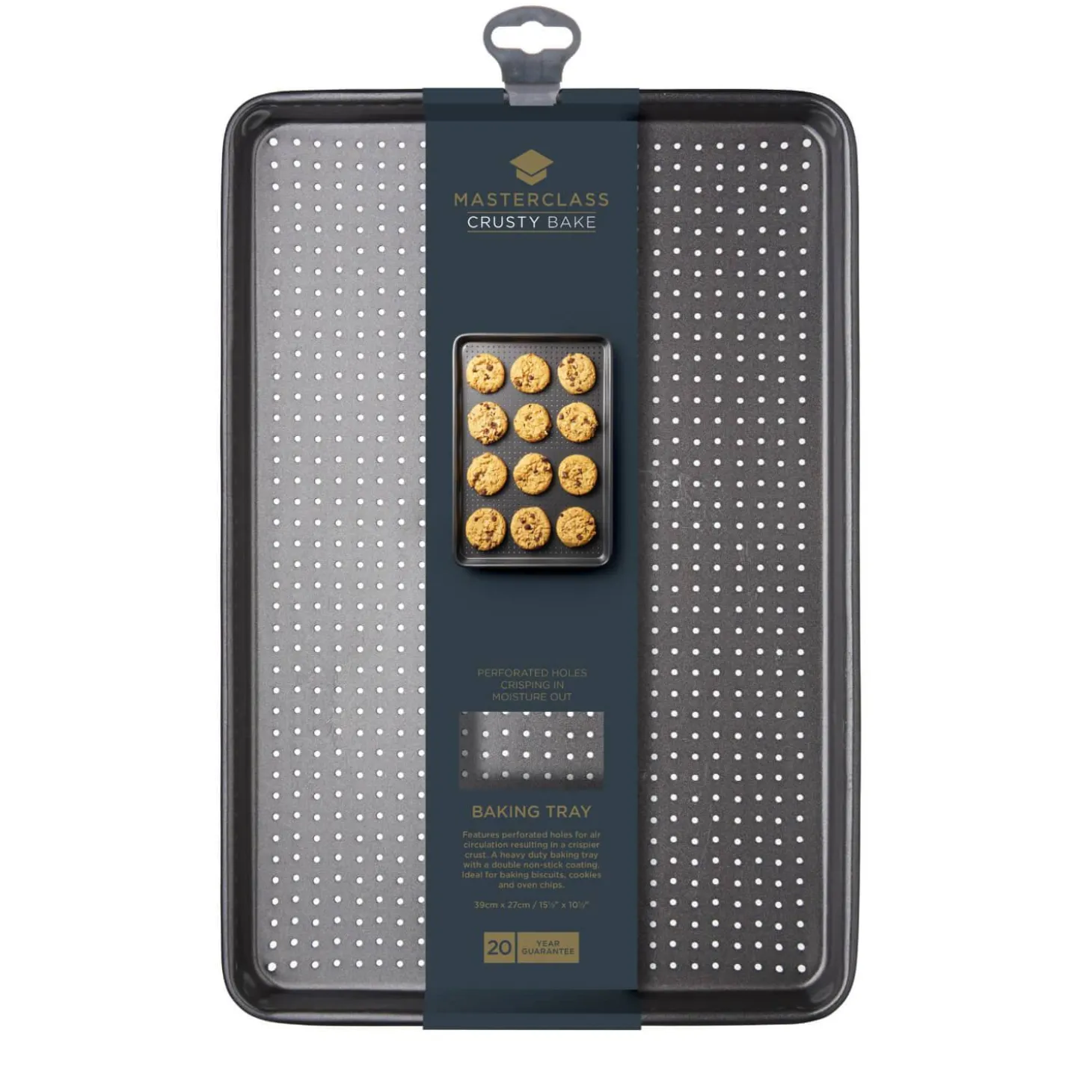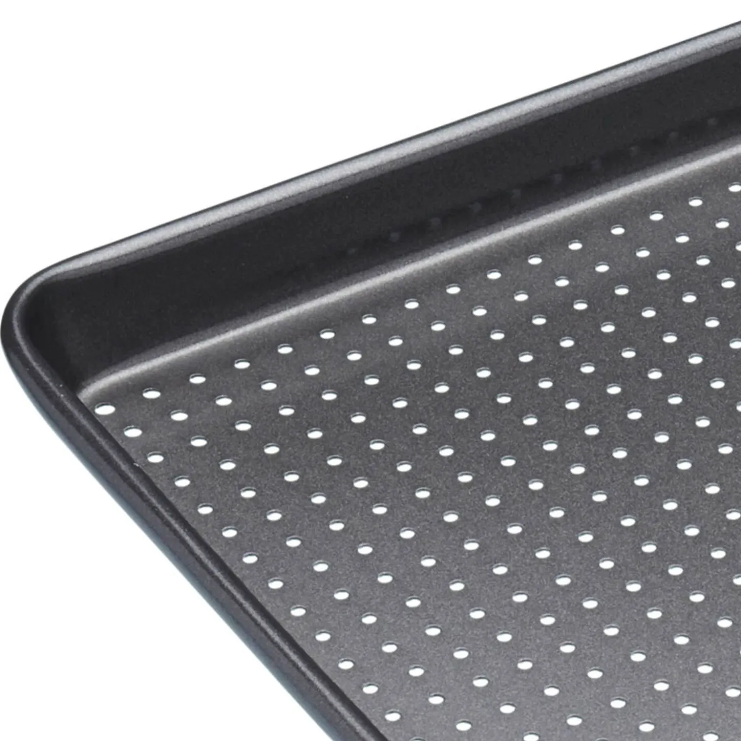 The perforations in the heavy duty carbon steel of the Kitchencraft Masterclass 39cm Rectangle Non-Stick Crusty Bake Baking Sheet allow air to circulate during the cooking process, ensuring that your food items are crisped to perfection. It’s ideal for baking brownies, flapjacks and biscuits.