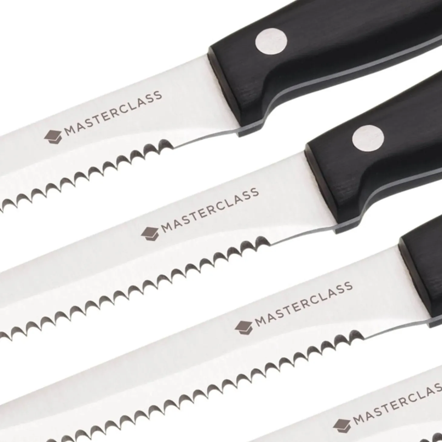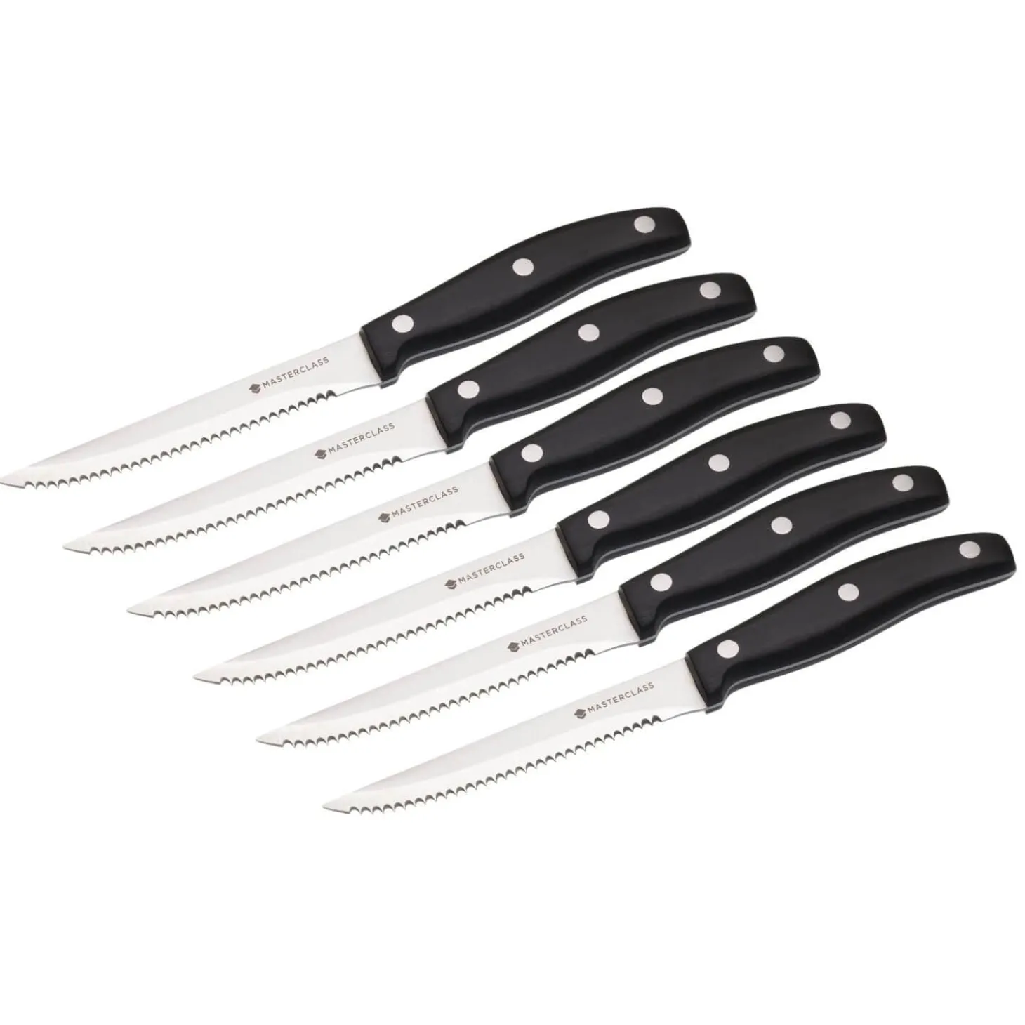 Masterclass presents the 6 piece steak knife set which forms part of the Deluxe range. Created from premium serrated stainless steel, these knives are guaranteed to cut through any steak or pizza no matter how it is cooked. Featuring a triple-riveted handle and full-length tangs which will provide you with ample comfort whilst cutting.
