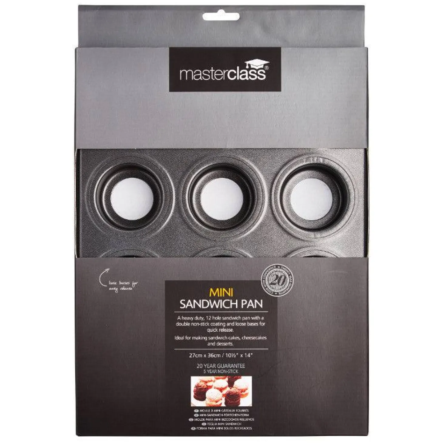 The Kitchencraft Masterclass 12 Hole Non-Stick Mini Sandwich Tin allows you to make a selection of delicious individual sandwich cakes, cheesecakes and desserts. The sturdy carbon steel construction with non-stick coating and the handy loose-base design help to ensure an even bake and the quick and simple release of your culinary creations.