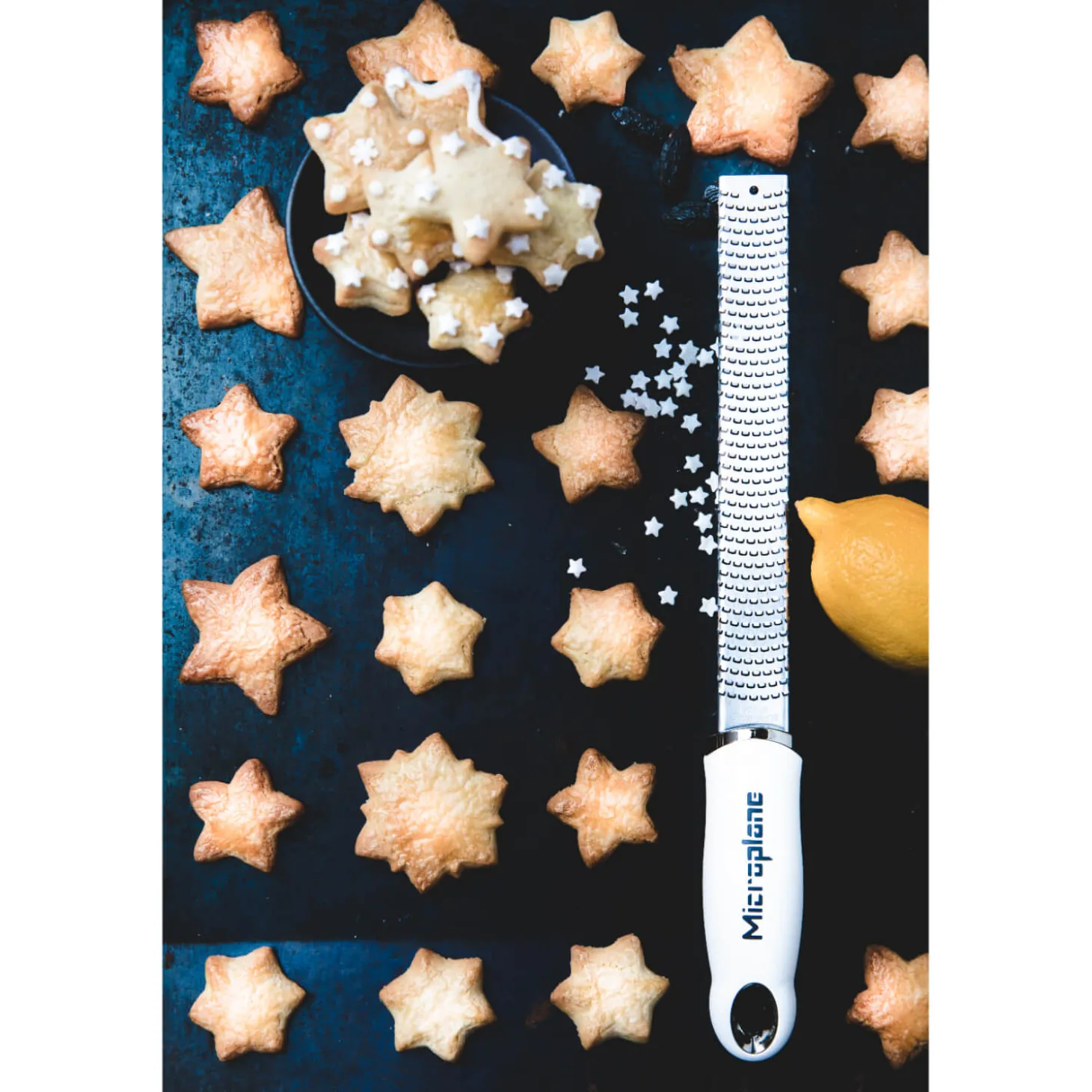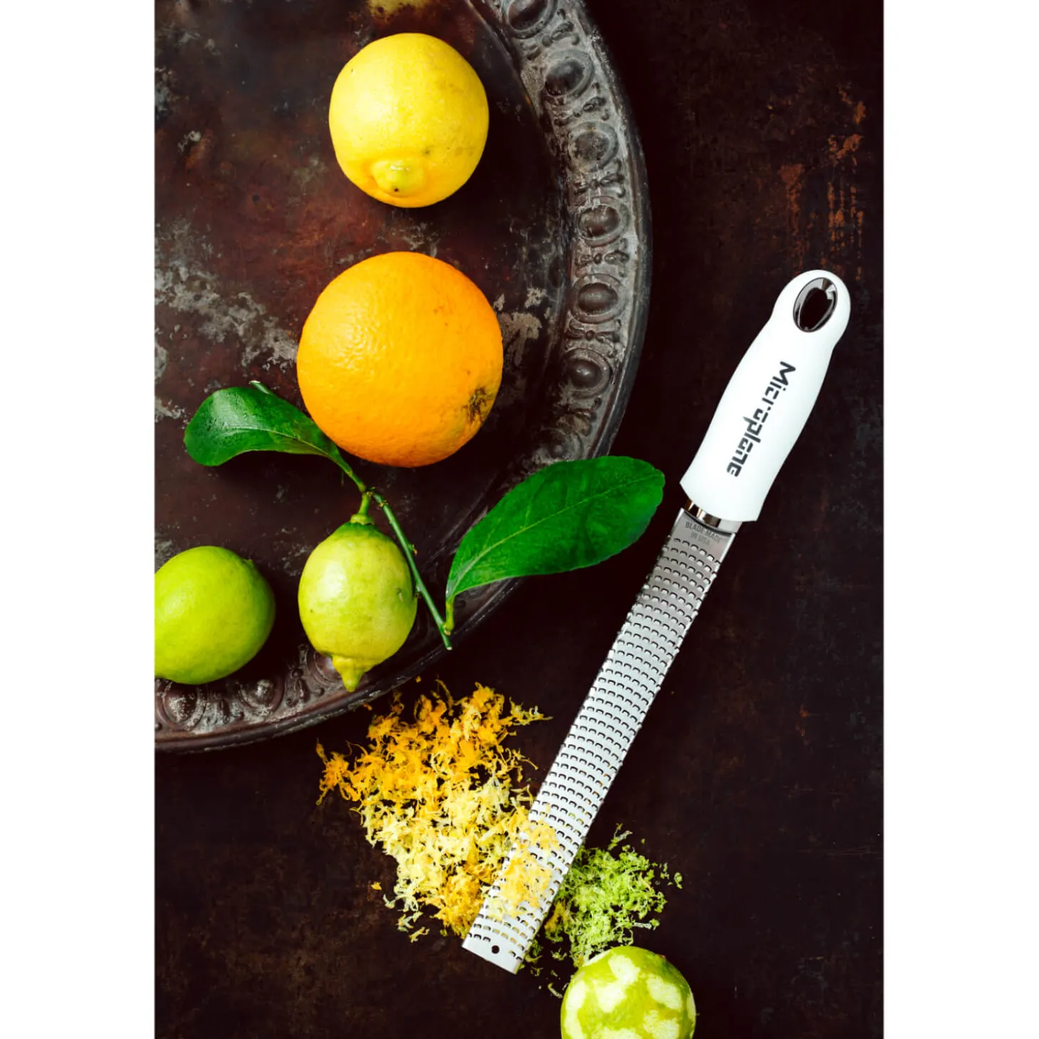 Microplane presents the Premium Classic Series Zester in White. This innovative zester is both effective and durable with ultra-sharp cutting edges that cut precisely without shredding or tearing. The 400 micro-teeth, which are photo-etched and angled just right, produce the perfect zest for flavouring your home-made dishes and drinks.
