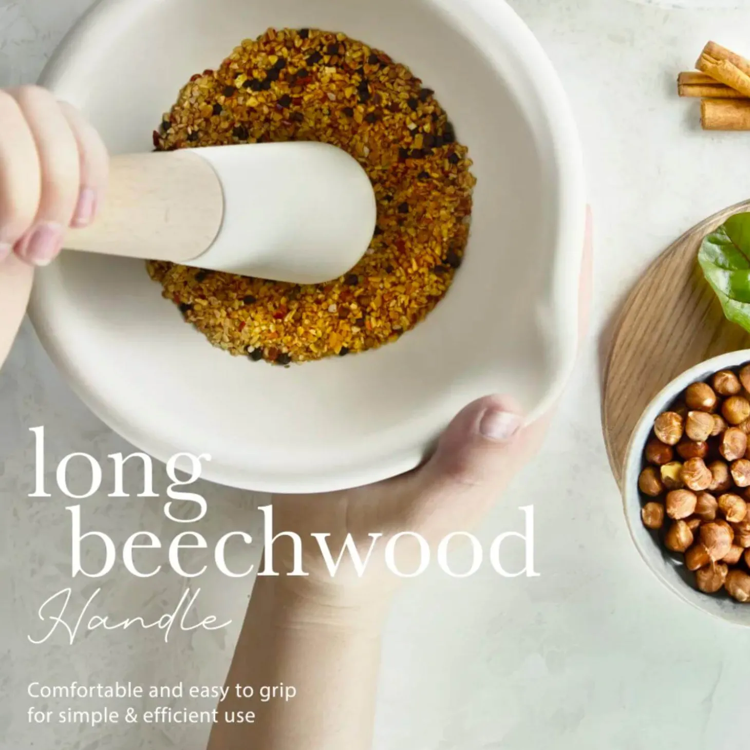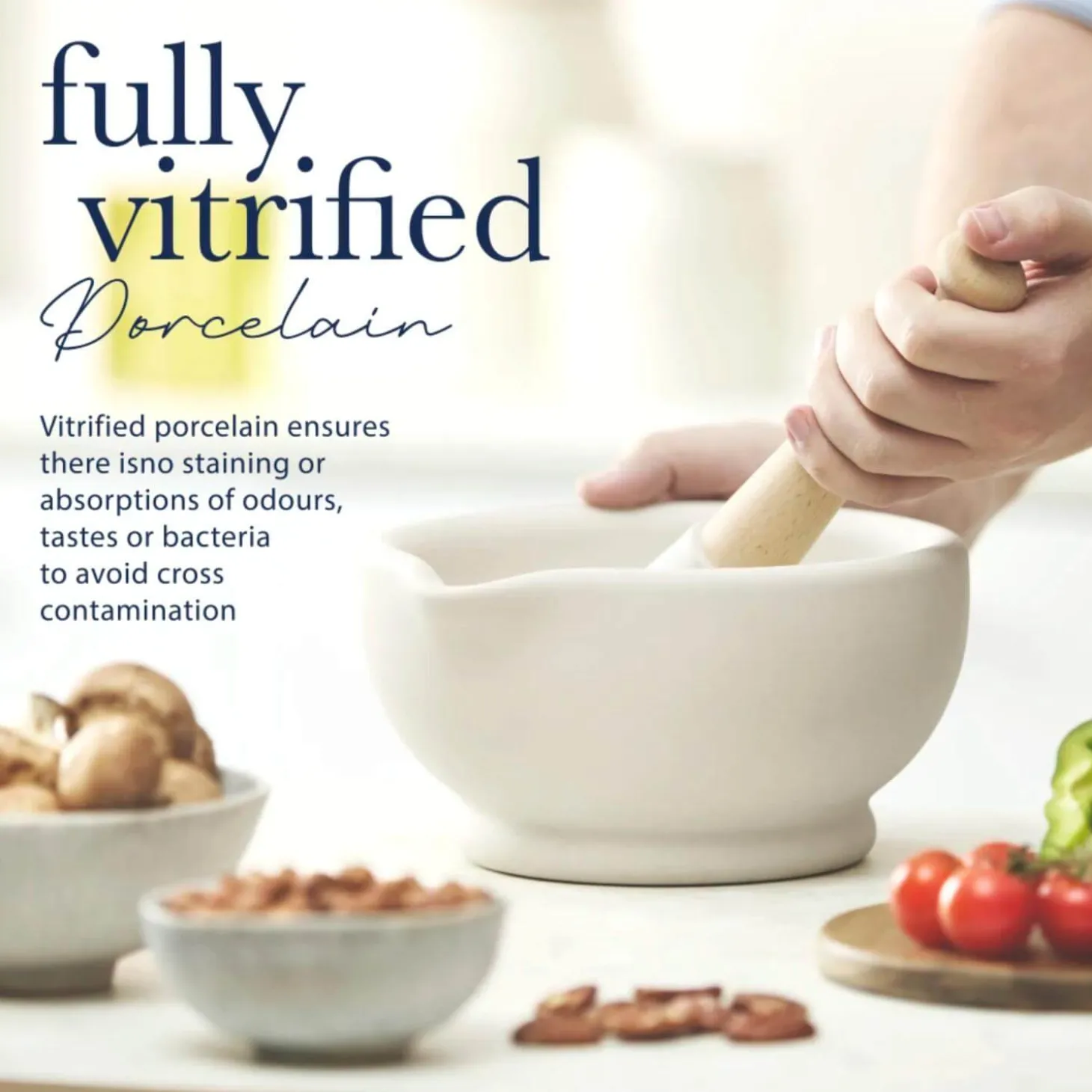 Milton Brooks presents the Size 6 Porcelain Mortar & Pestle, made from unglazed porcelain with an abrasive finish, making it perfect for crushing and grinding herbs and spices in the kitchen. This classically designed mortar and pestle is ideal for cooks of all skill levels. The pestle features an ergonomic beechwood handle, ensuring comfort during use. Milton Brooks are part of the Wade Pottery family and have been crafting mortar and pestles for over 100 years.